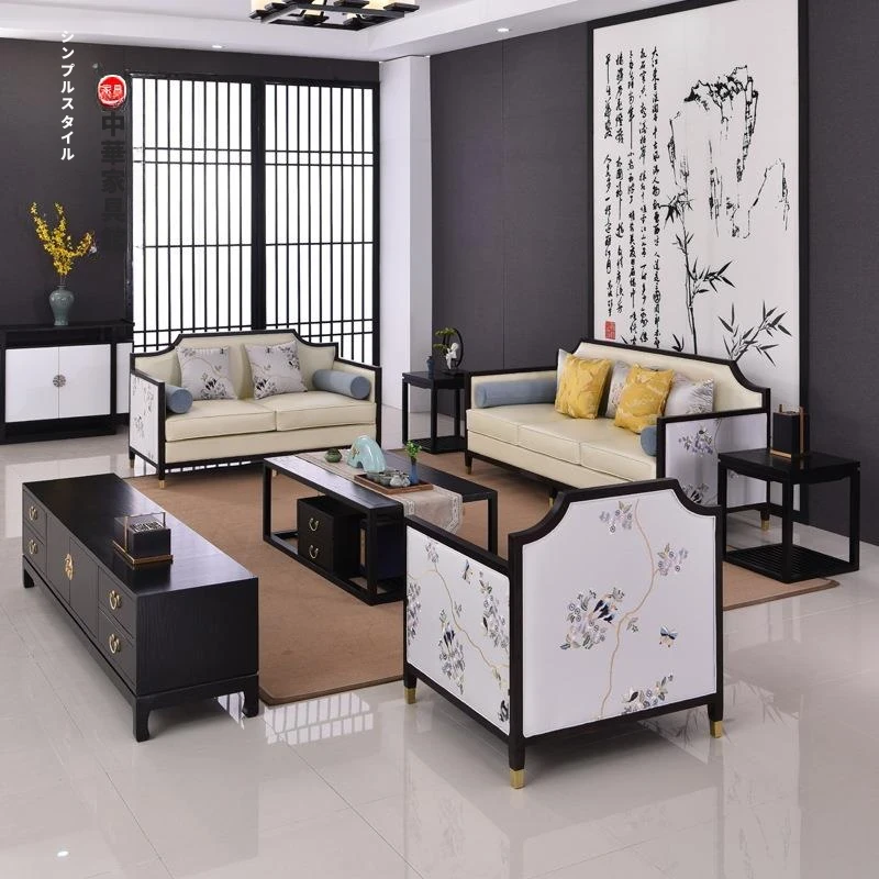 新中式ウッドウッド真皮ソファー|高級感あふれる別荘リビング向け|本格的な無垢材ソファーセット|広東省仏山の家具で、上質な空間を演出!