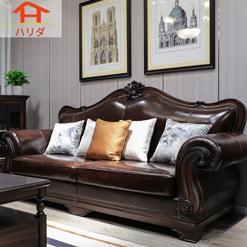 欧風スタイルのリビングルーム用フルウッドソファセット - アメリカンデザインの4人掛け小型KTV本革ソファで、コンパクトな空間でも優雅な雰囲気を演出!