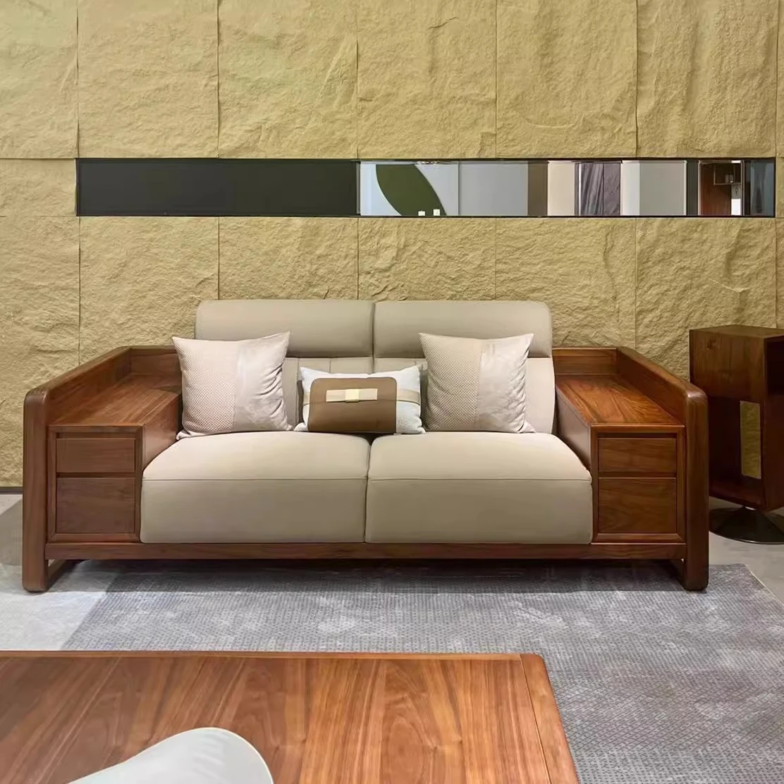 新中式デザインの北米産ブラックウォルナット無垢材ソファセット - 高級感あふれる広々とした別荘のリビングにぴったりなファブリックソファ!