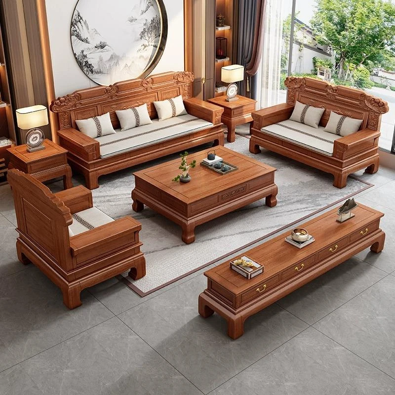 新中式の高級無垢材ソファセット|ウッディなラフカットのローハンベッドと茶室用のシンプルで洗練されたデザイン|別荘やサロンに最適な家具で、心地よいくつろぎ空間を演出します。