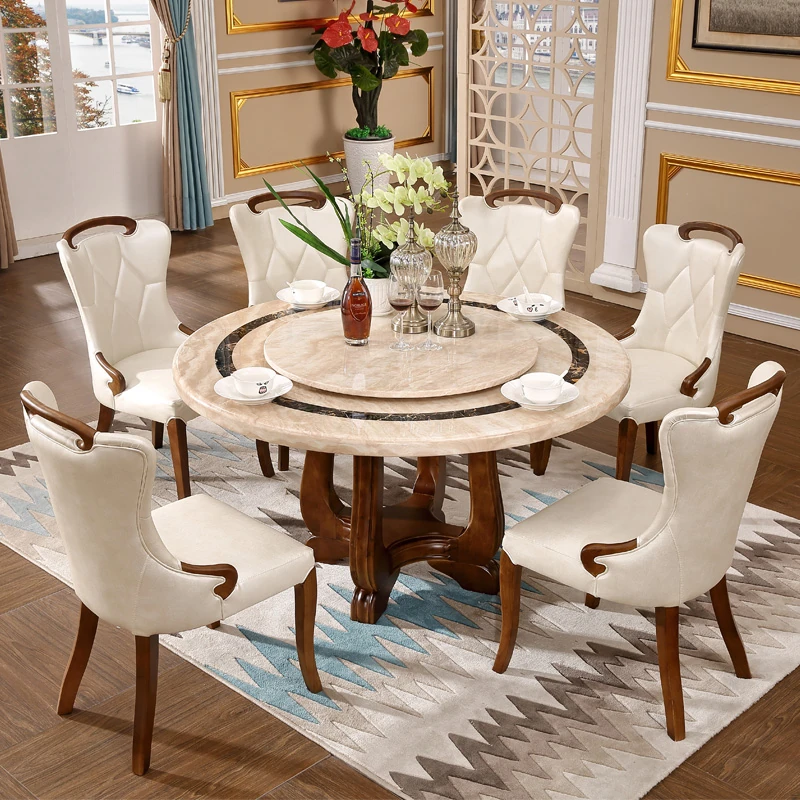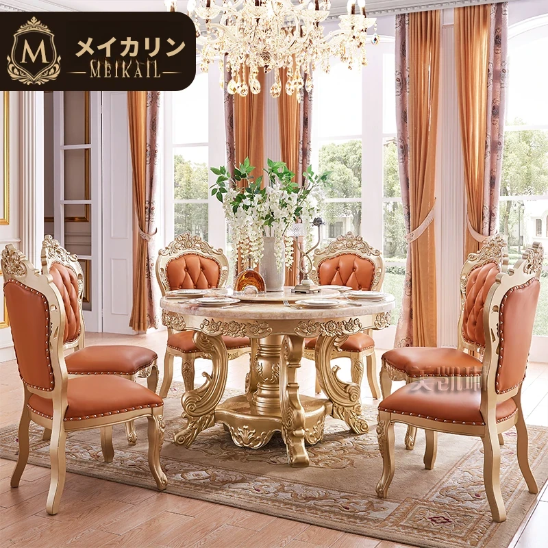 高級感溢れる欧式天然大理石丸テーブル - 豪華な木製彫刻とゴールド仕上げのラウンドダイニングテーブルで、特別な食事のひとときを演出します。
