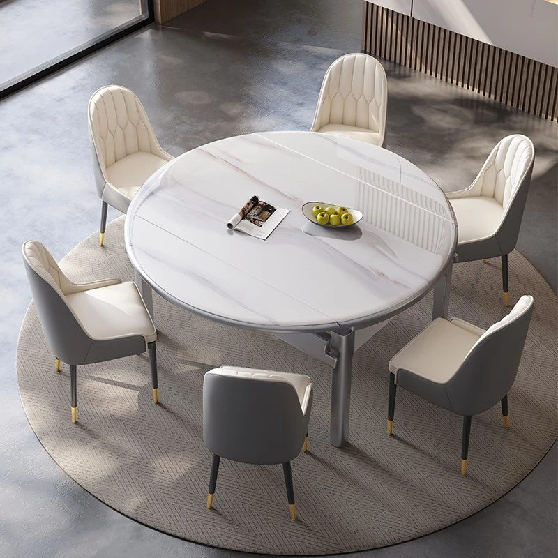 裕钦のモダンでシンプルな伸縮式折りたたみ岩板ダイニングテーブルセット - 小さな家にぴったりの実用的でスタイリッシュな丸テーブル。家族や友人との楽しい食事の時間を演出します!
