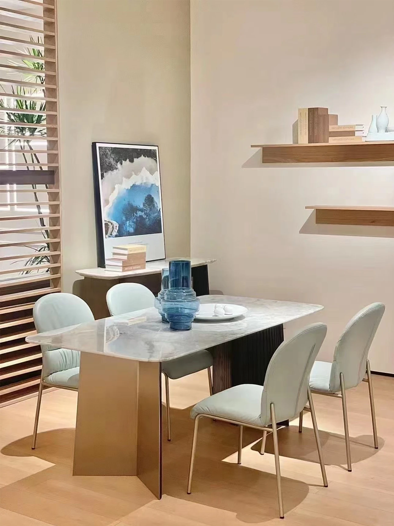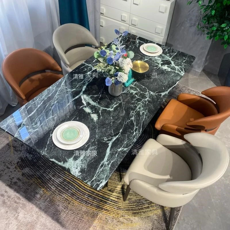 2025年イタリアンミニマリズム天然大理石ダイニングテーブル&チェアセット - モダンでシンプル、軽やかなラグジュアリーな家庭用レザー仕上げの食卓。上質なデザインで、毎日の食事を特別なひとときに変えます!