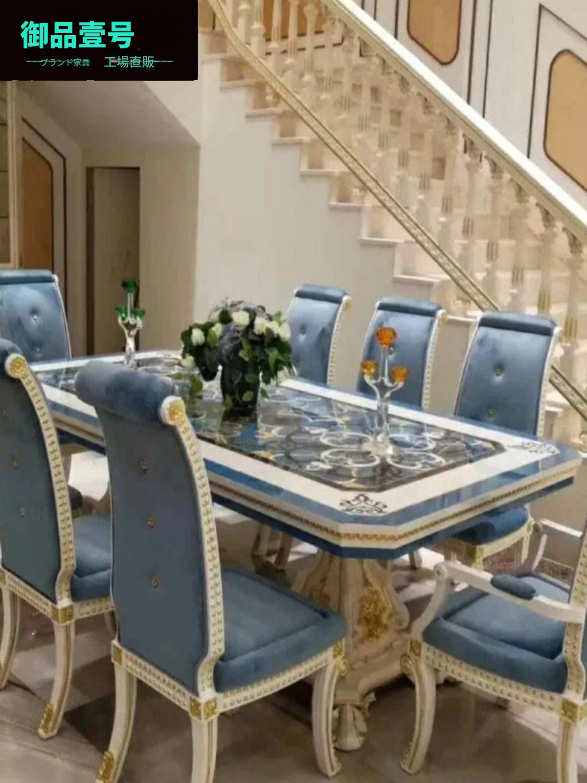 豪華な欧風デザイン!大理石製の長方形ダイニングテーブルセット - 家庭用、6人〜8人対応、耐久性抜群の無垢材使用!食事をもっと特別なひとときに。