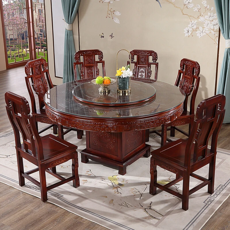 全実木製ダイニングテーブル椅子セット|回転式オーク材ラウンドテーブル|多機能電磁調理器付き|家庭用食事に最適な木製テーブル!
