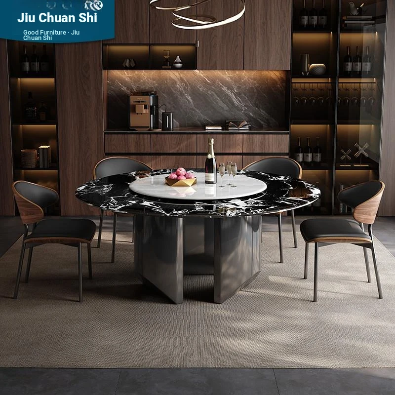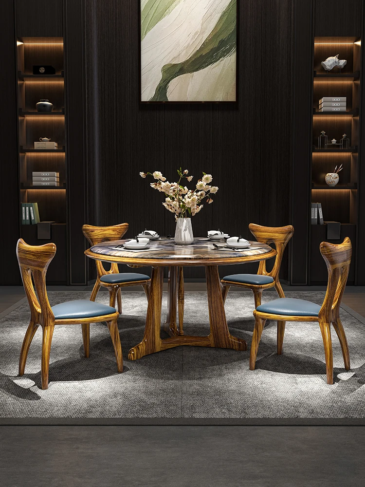 Elegant New Chinese Style Black Gold Wood Dining Table and Chair Set - Round Marble Solid Wood Dining Table for 6-8 People, Perfect for Your Home Dining Room Furniture