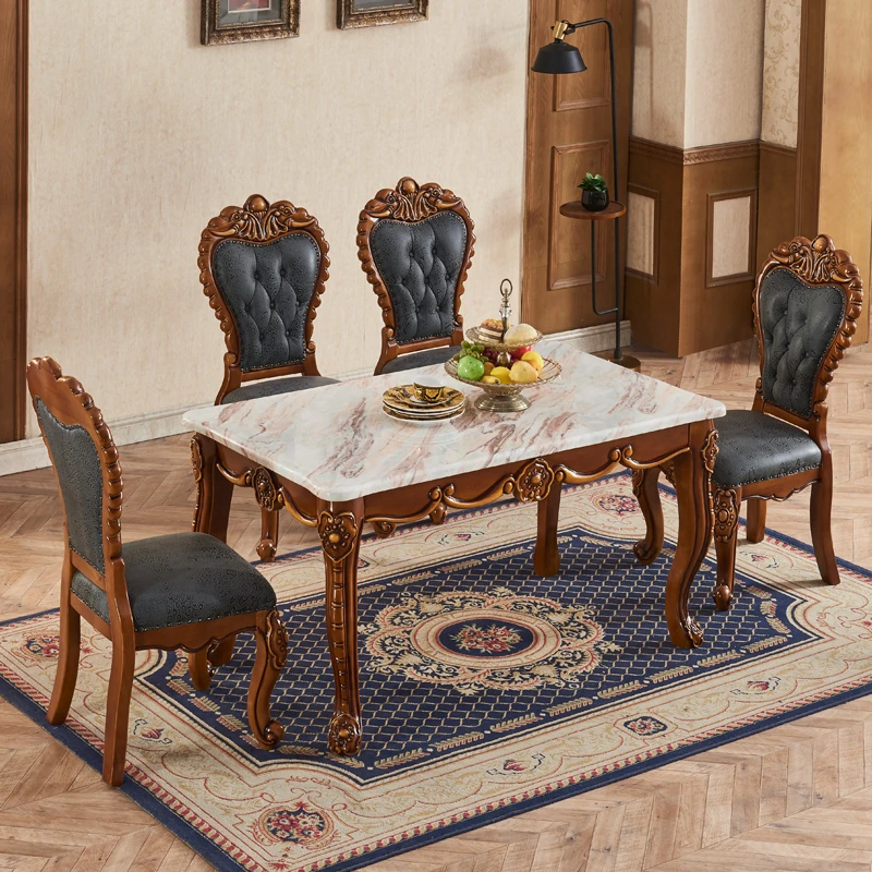 Elegant European Marble Dining Table Set - Rectangular Black Walnut Table with Chairs, Perfect for Small to Medium Spaces, Featuring Exquisite Carved Design for a Luxurious Dining Experience.