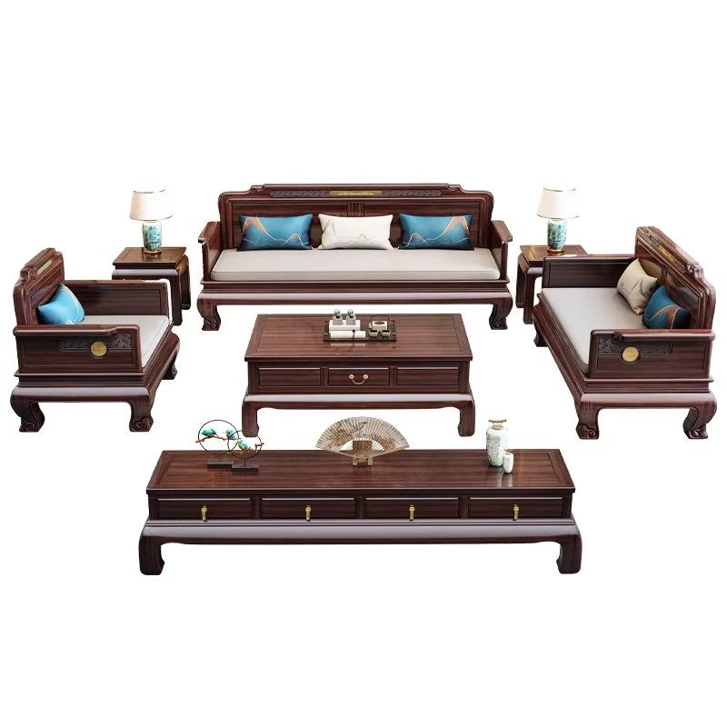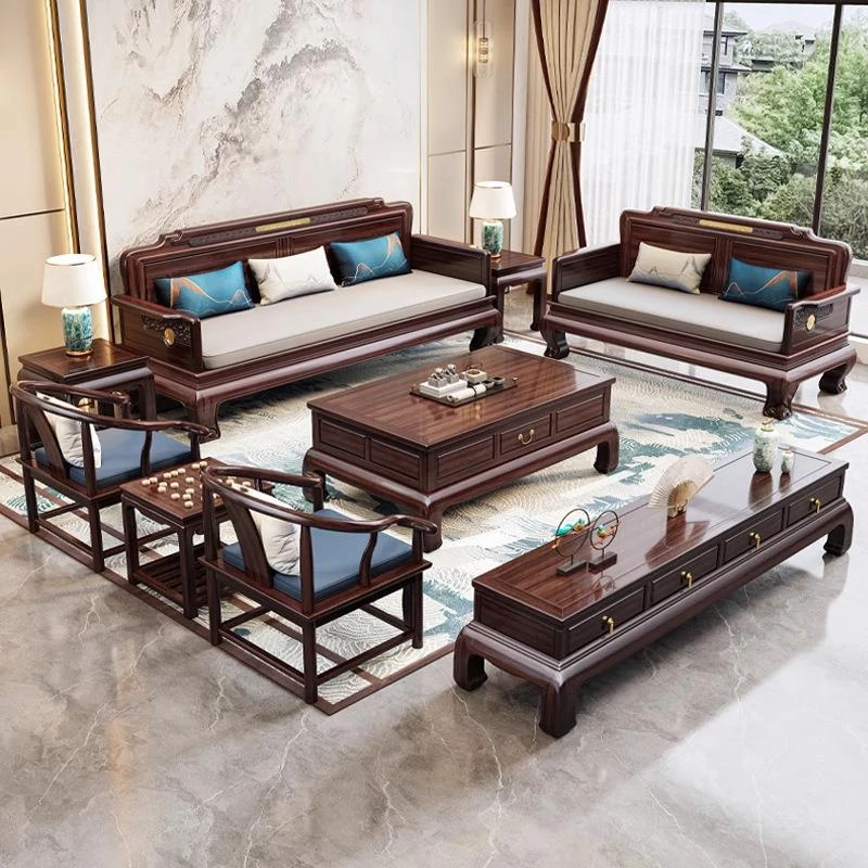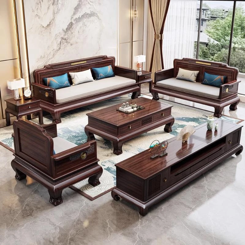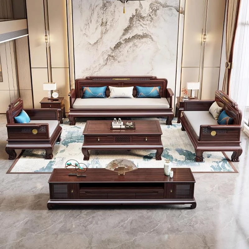 Classic Modern Solid Wood Sofa Set in New Chinese Style - Versatile for Winter and Summer, Perfect for Spacious Living Rooms and Villas, Crafted from Fine Blackwood.