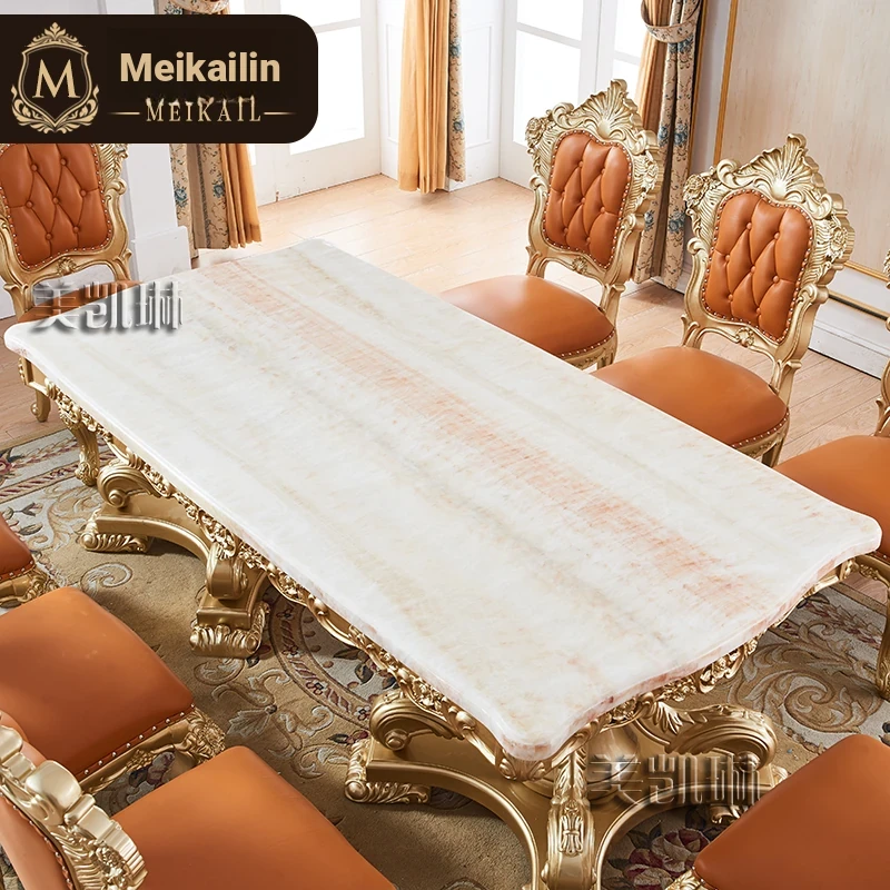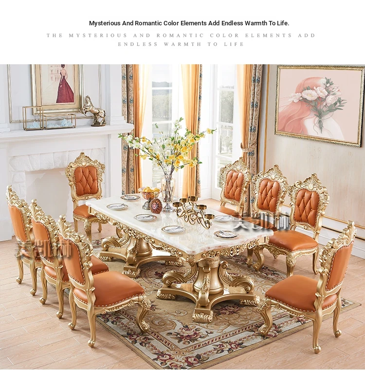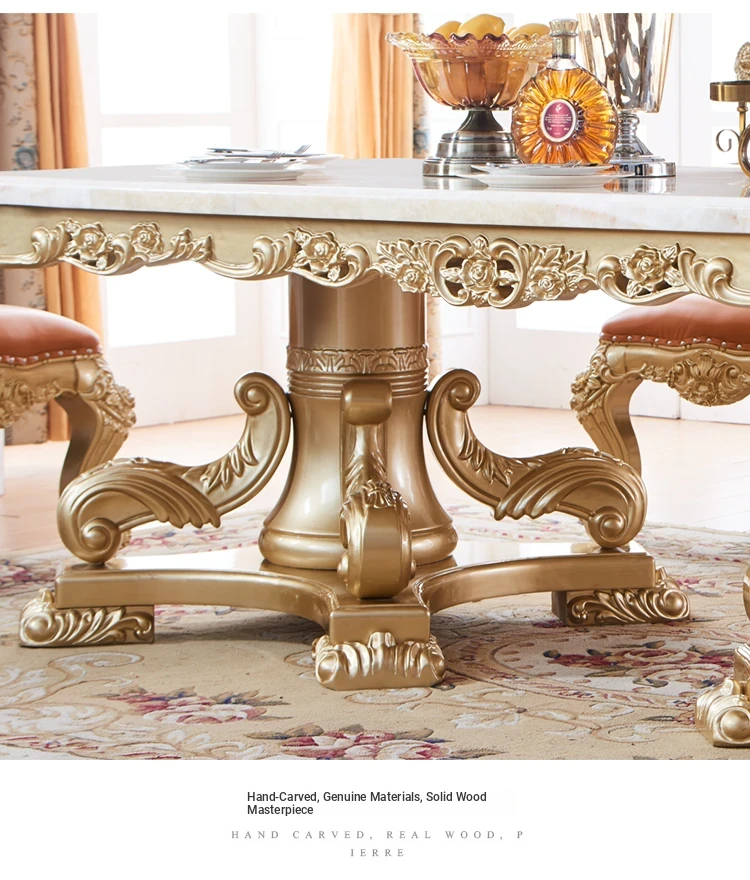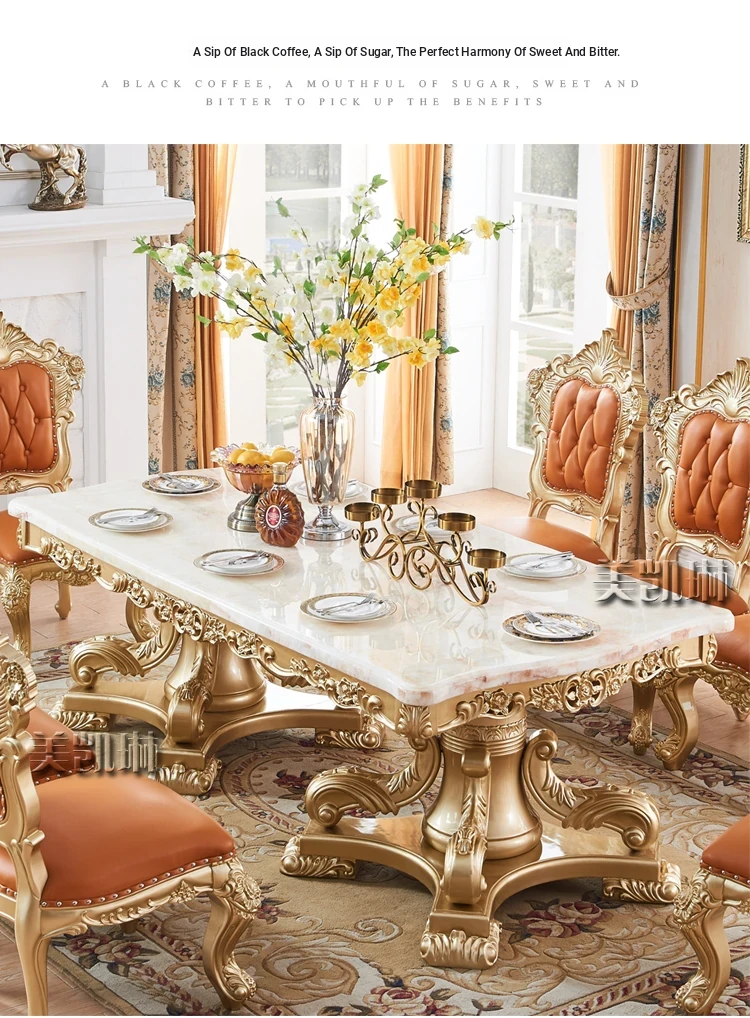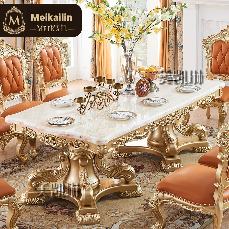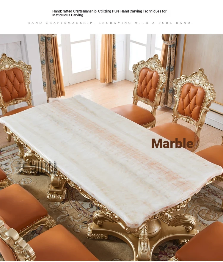 Elegant European Luxury Champagne Gold Rectangular Dining Table Set - Exquisite Natural Marble Table and Chairs for Upscale Villas and Dining Rooms