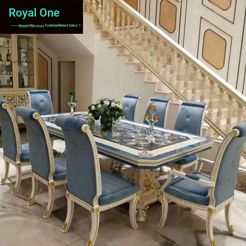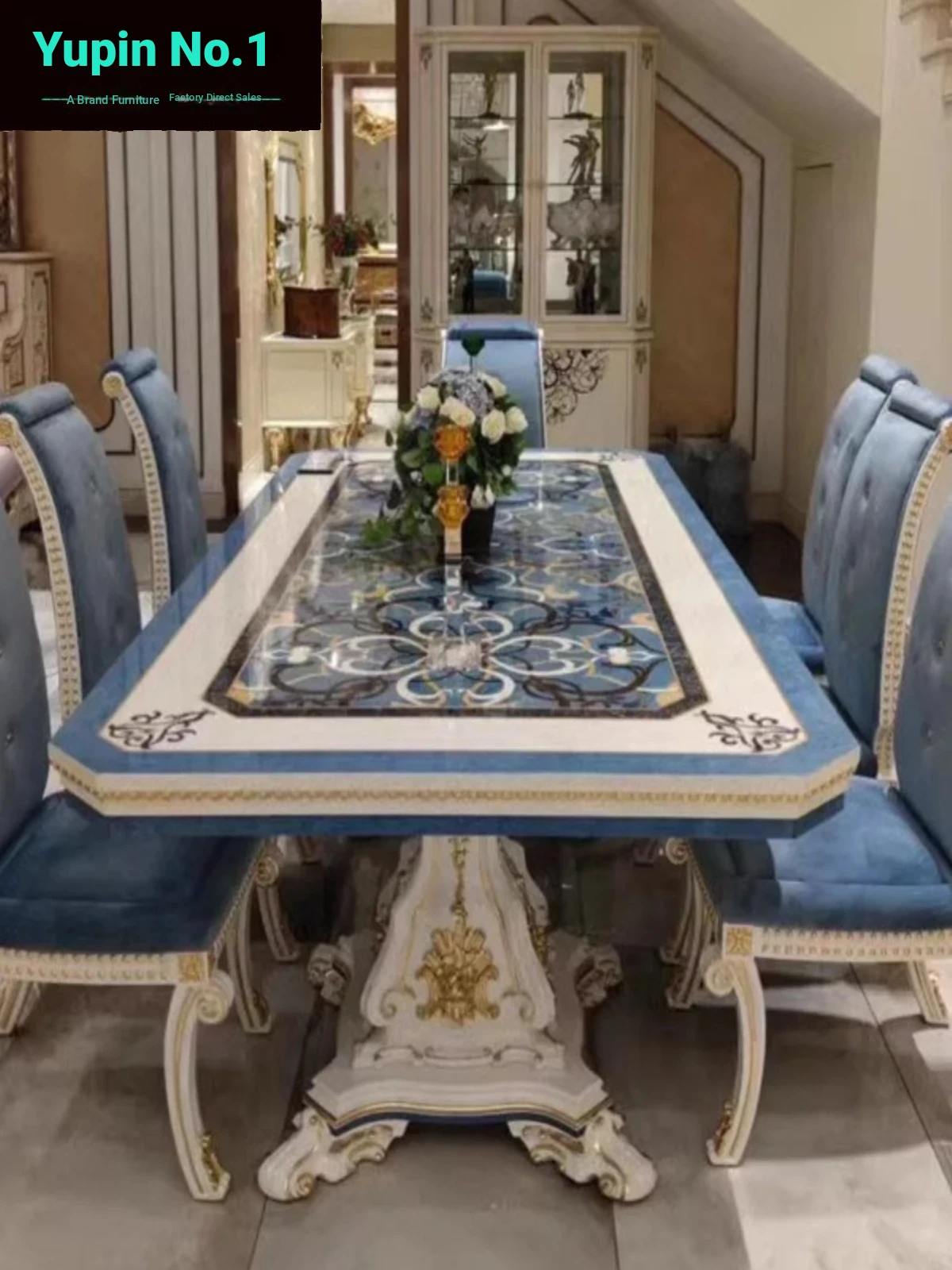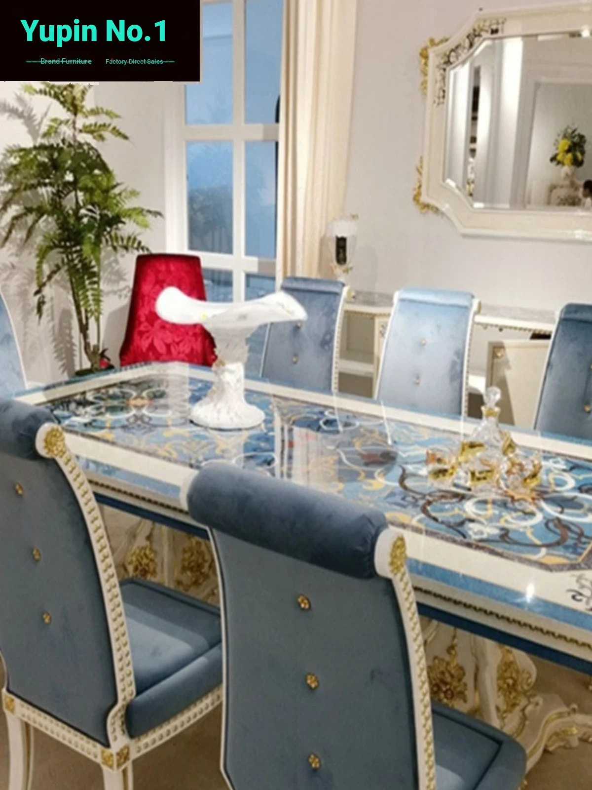 Elegant European Style Solid Wood Carved Dining Table with Shell Inlay - Rectangular Home Dining Set for French Palace Villas, Complete with Chairs