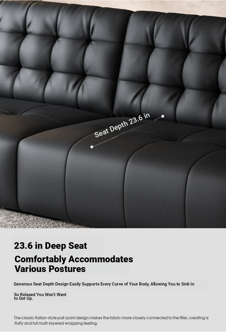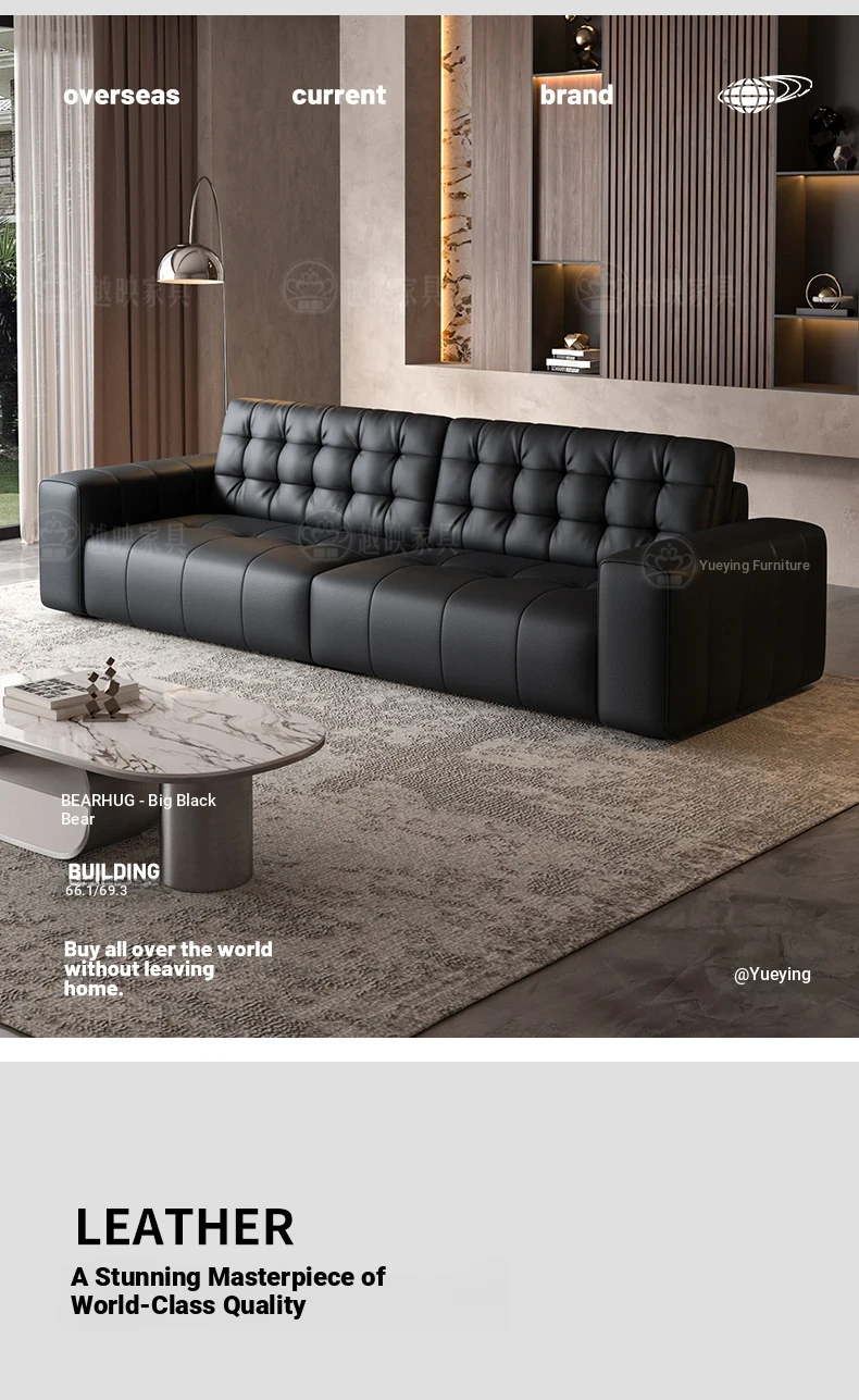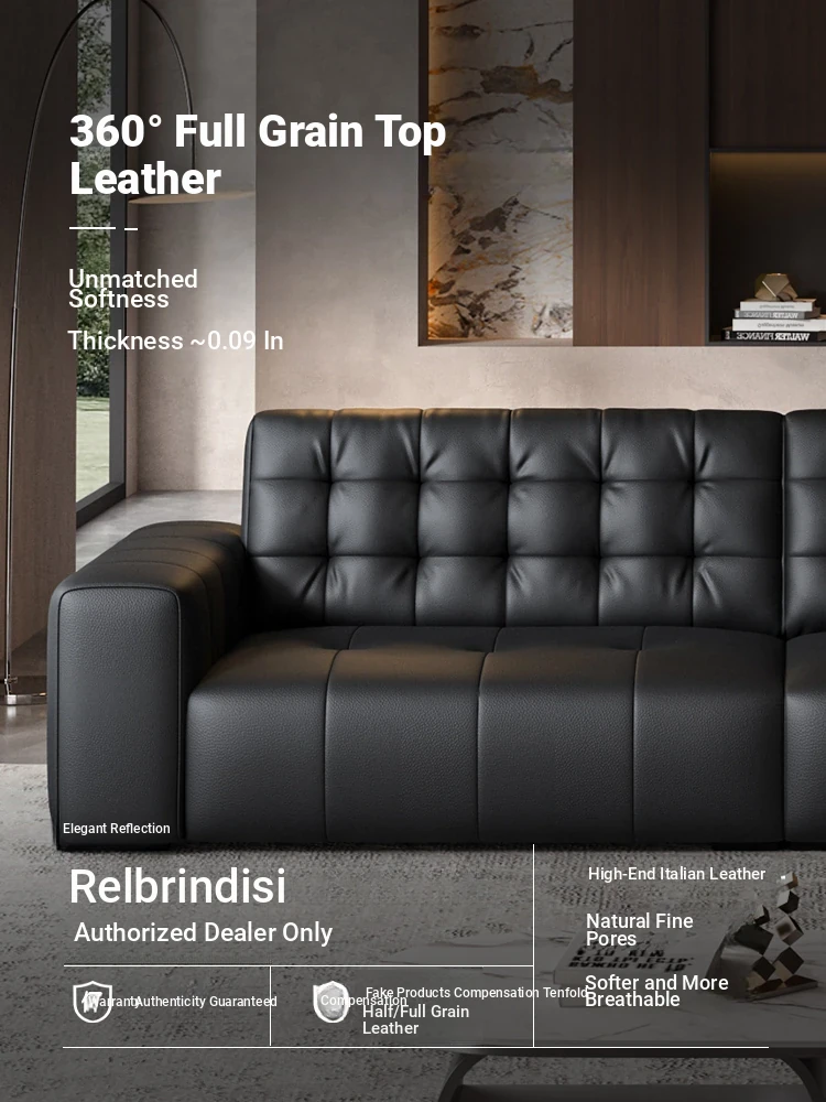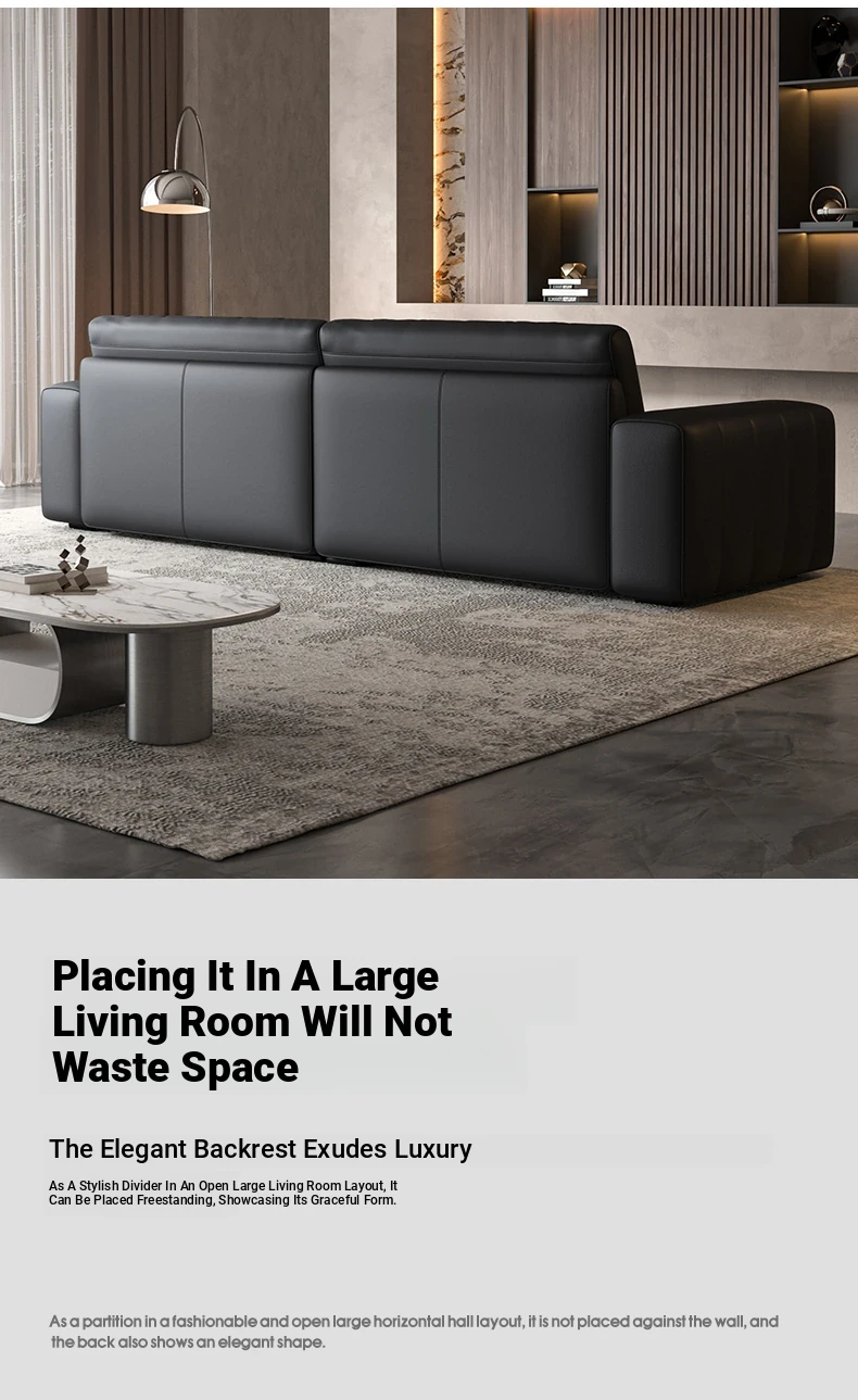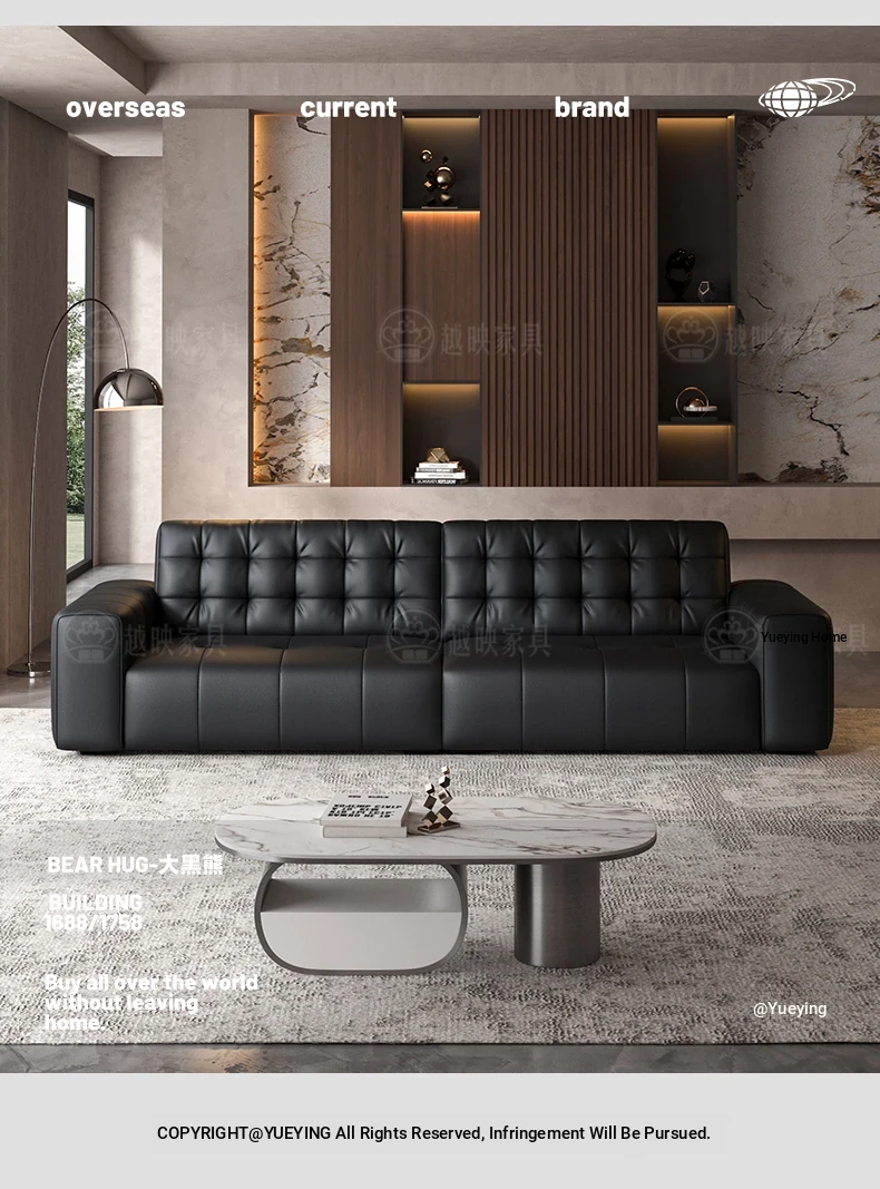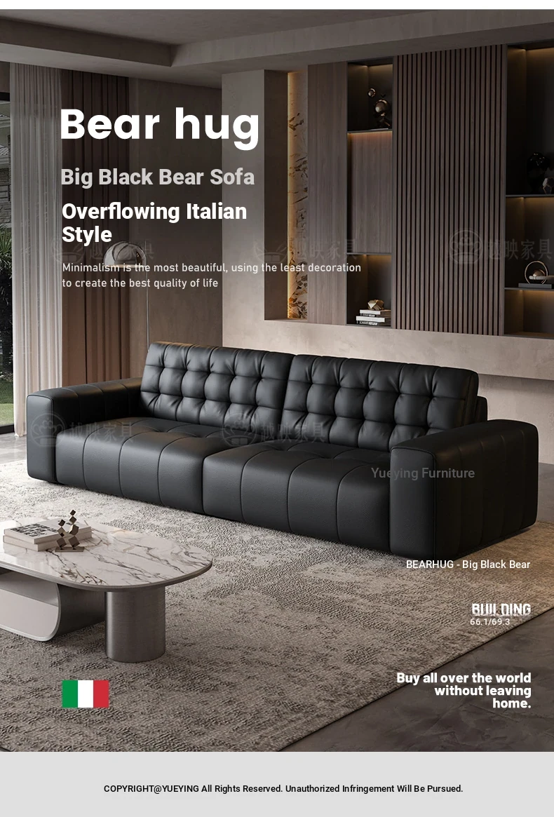 Elegant Italian Minimalist Black Bear Genuine Leather Sofa - Premium Top-Grain Cowhide Living Room Sofa with High Backrest for Ultimate Comfort and Style