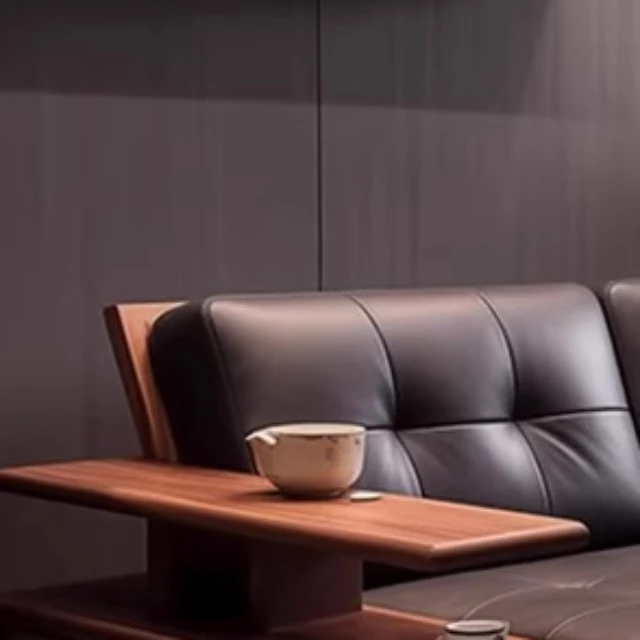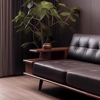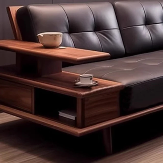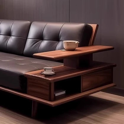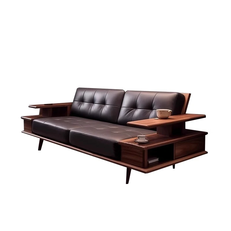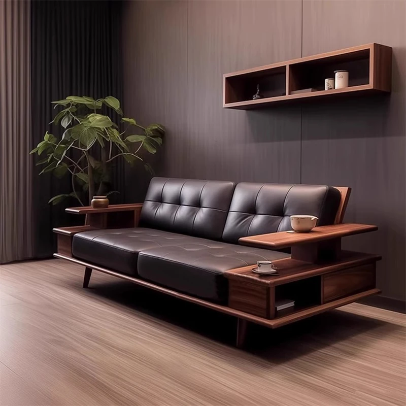 Elegant Modern Chinese Solid Wood Sofa - Zen-Inspired Design with North American Black Walnut, Perfect for Luxurious Living Rooms and Villas, Featuring Straight-Line Leather Upholstery