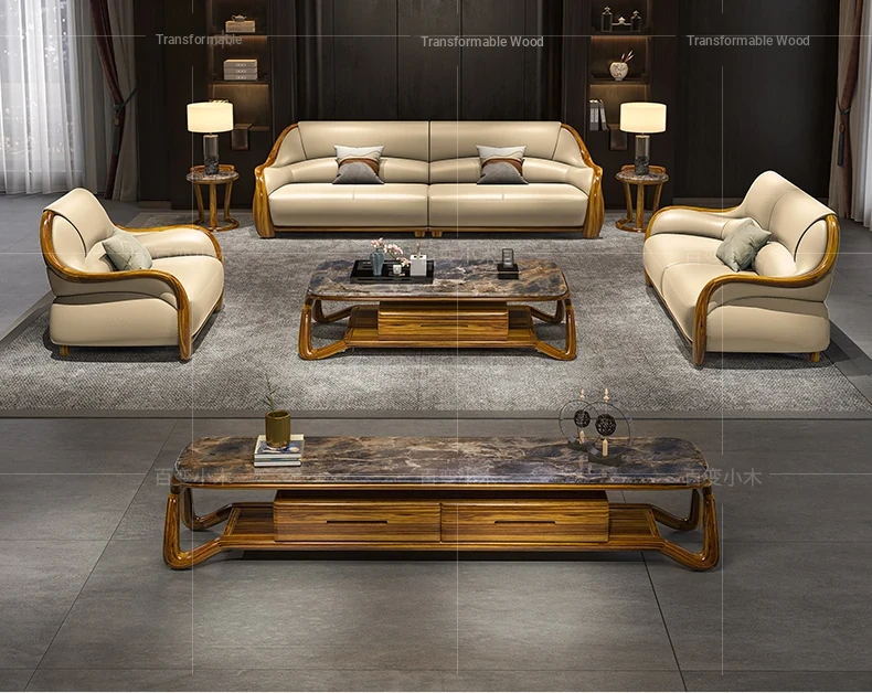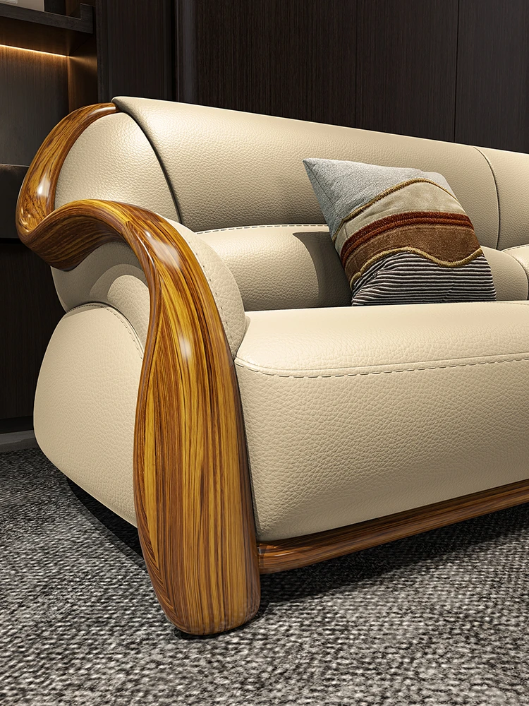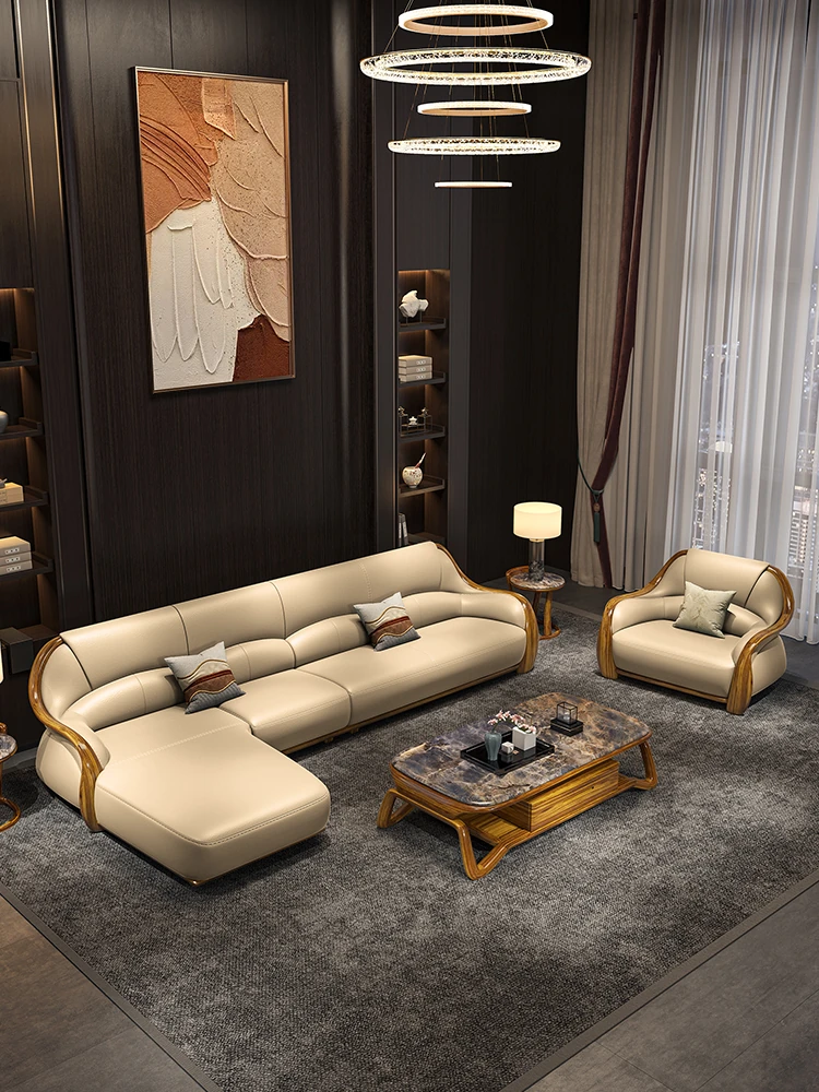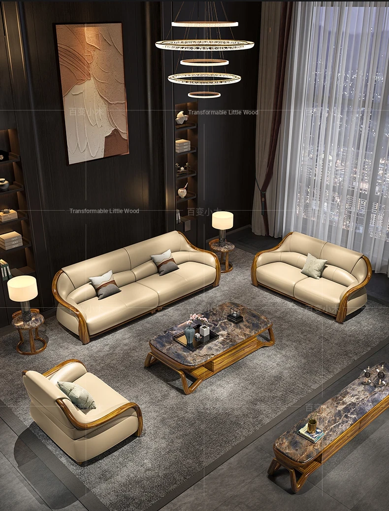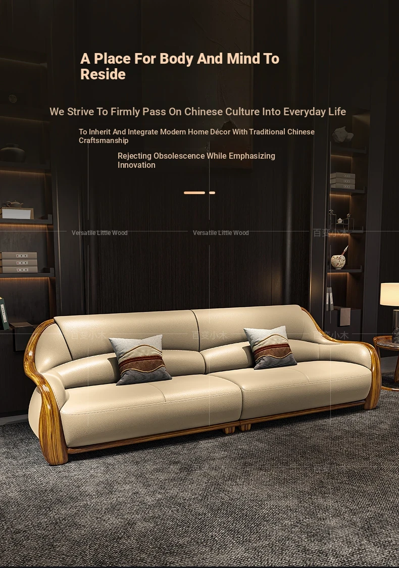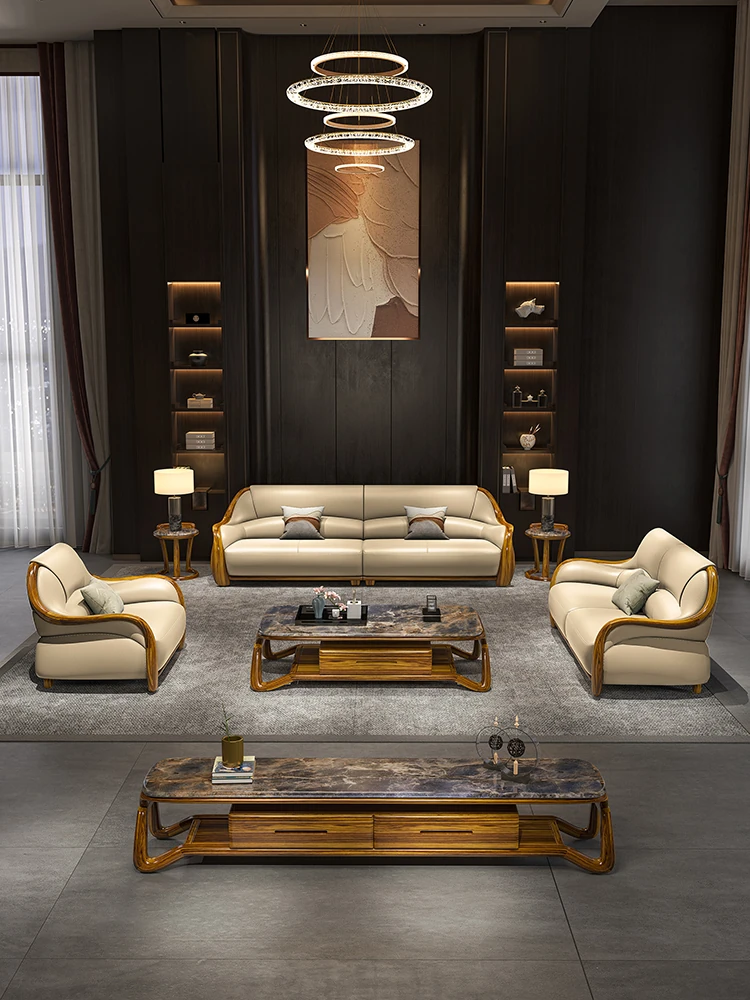 Elegant New Chinese Style Black Gold Wood Genuine Leather Sofa Set - High-End Solid Wood Living Room Furniture for Villas, Crafted in Foshan, Guangdong.