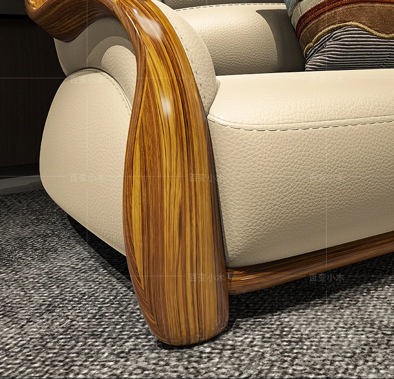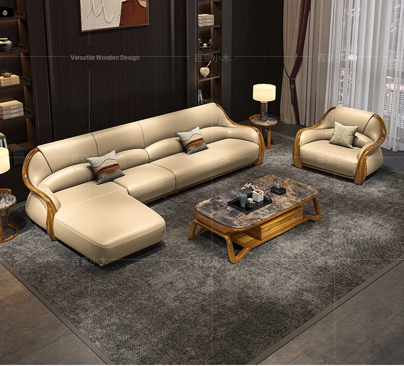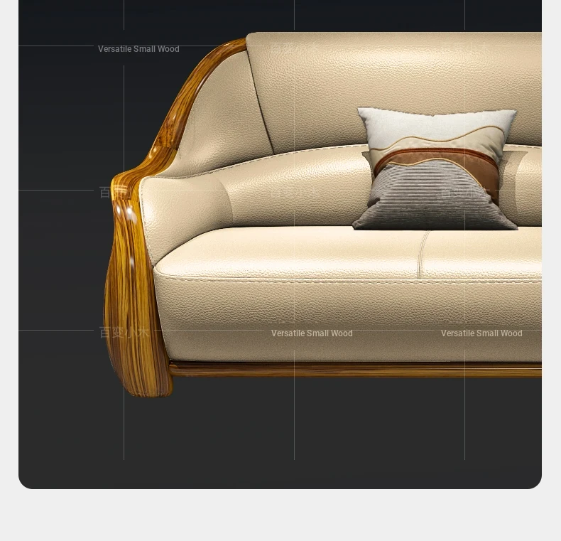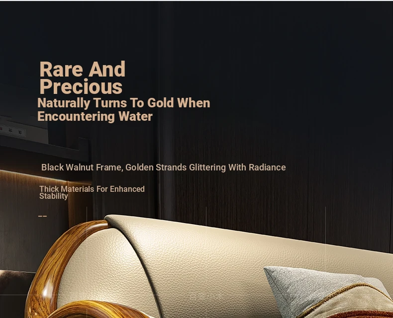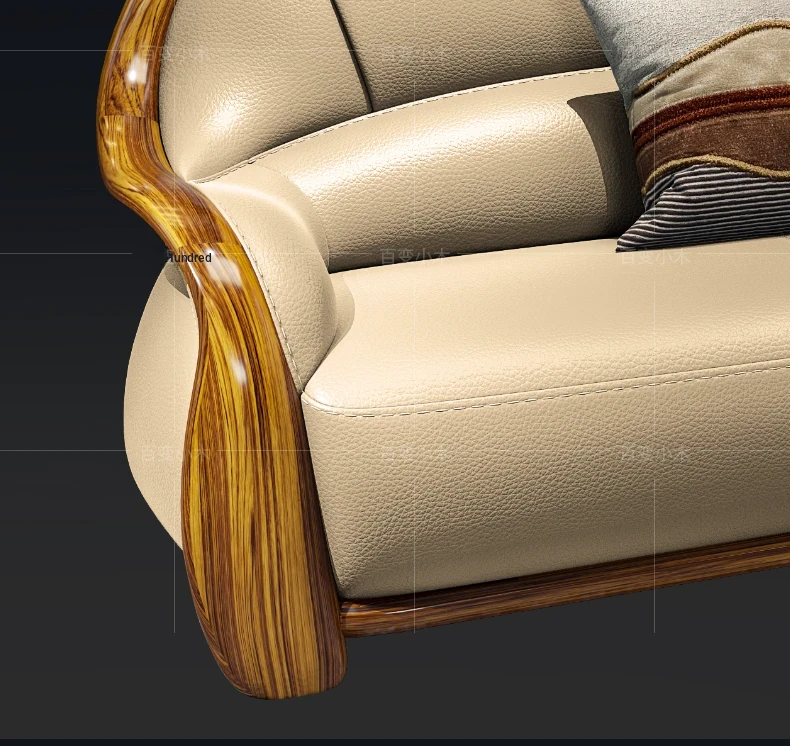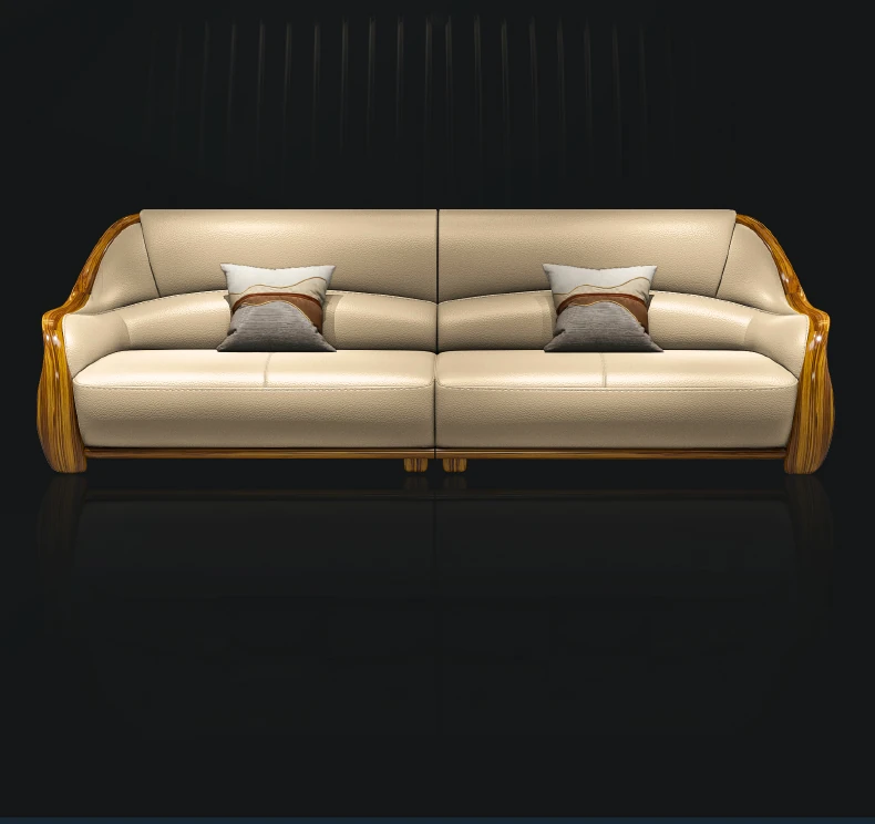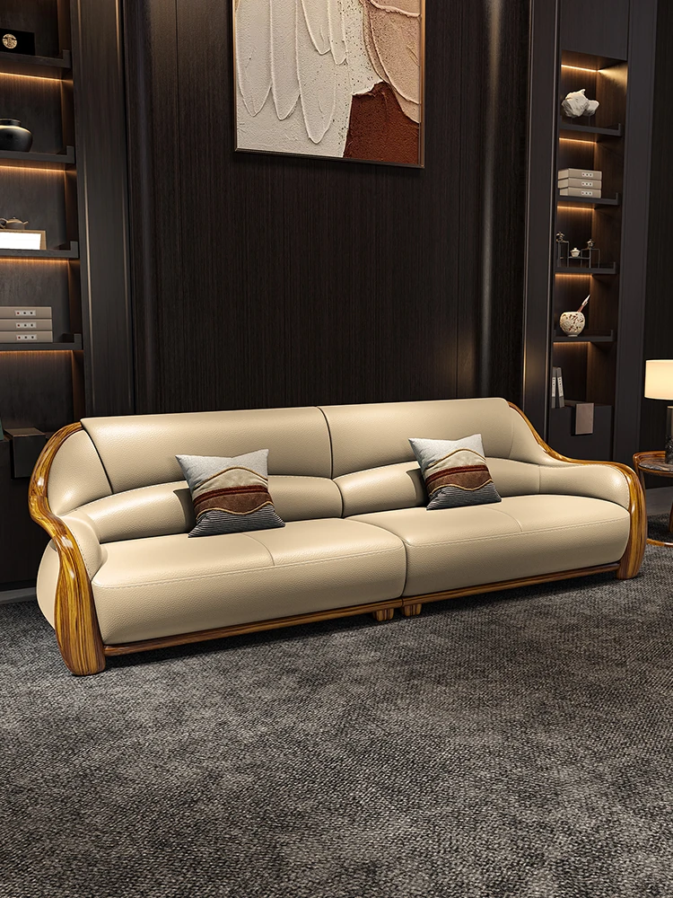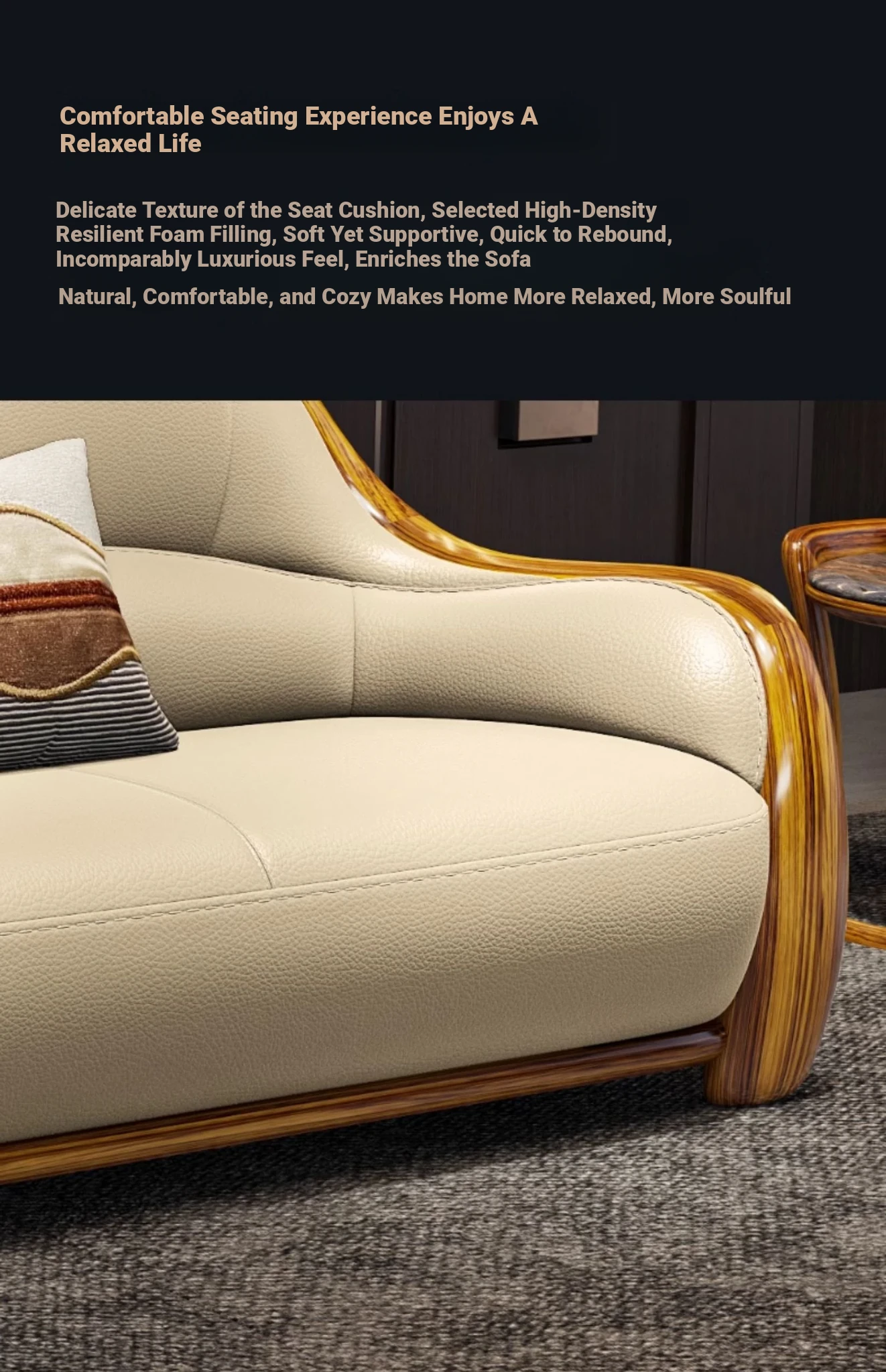 Elegant New Chinese Style Black Gold Wood Genuine Leather Sofa Set - High-End Solid Wood Living Room Furniture for Villas, Crafted in Foshan, Guangdong.