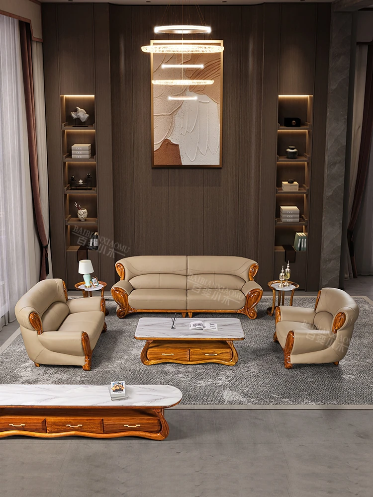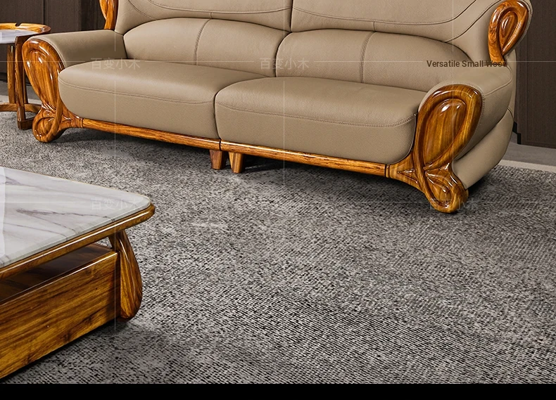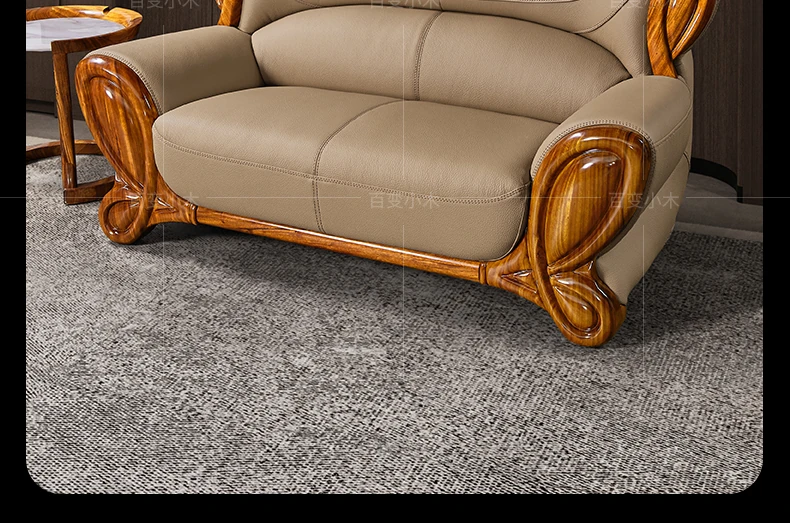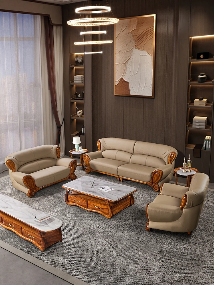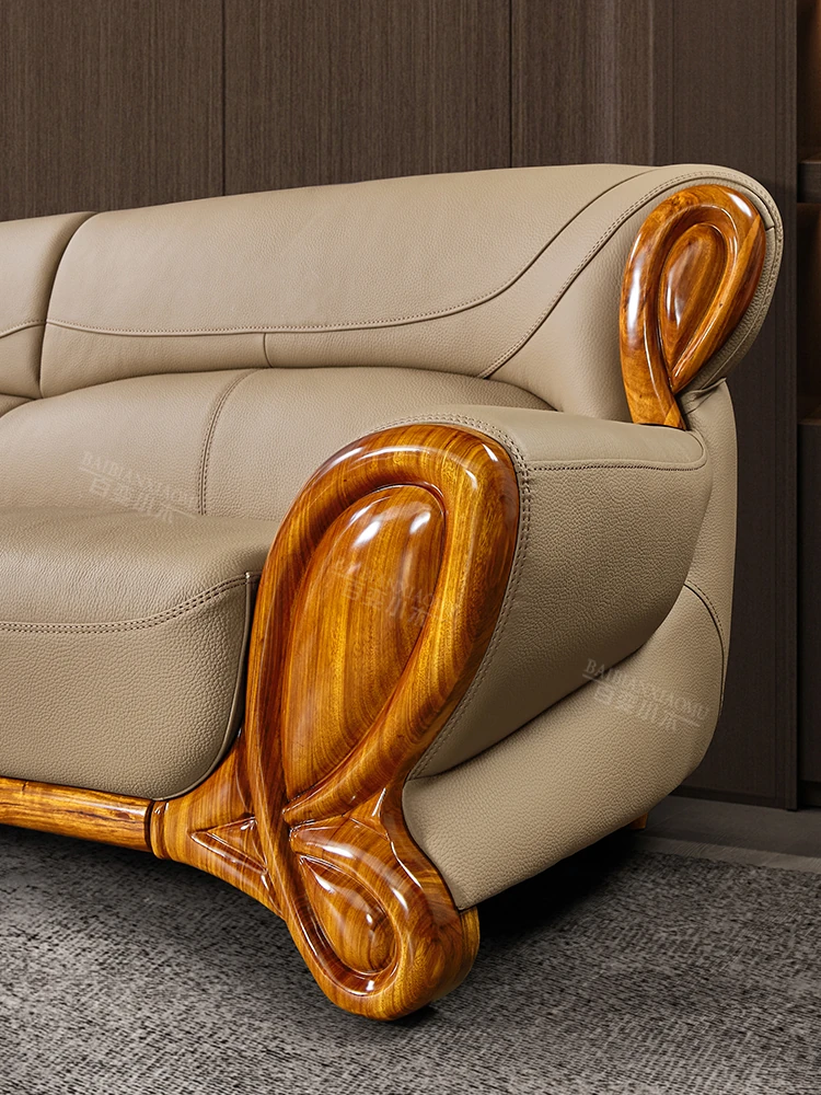Elegant New Chinese Style Black Wood Genuine Leather Sofa - Modern European Large Solid Wood Sofa for Villas and Spacious Living Rooms, Perfect for Luxury Home Decor