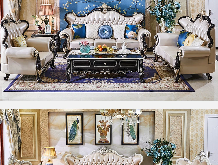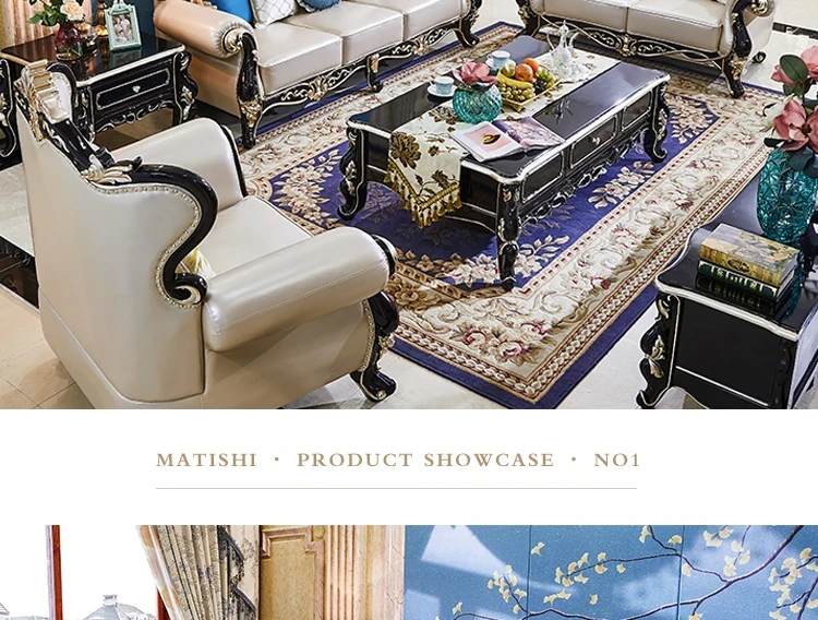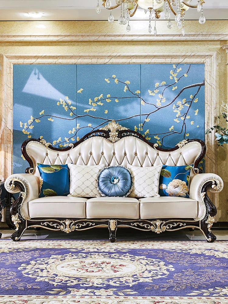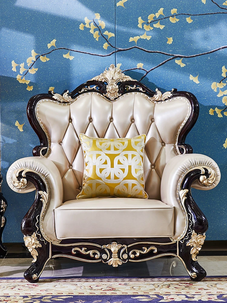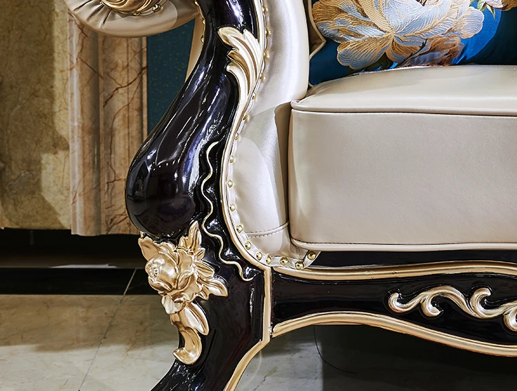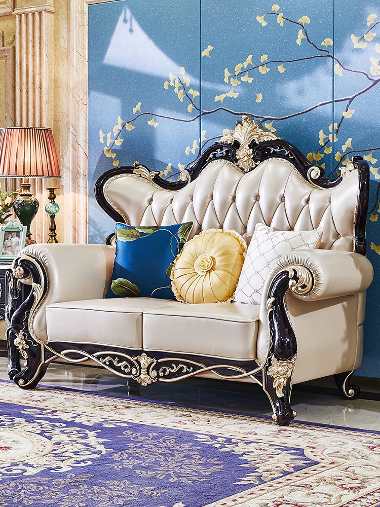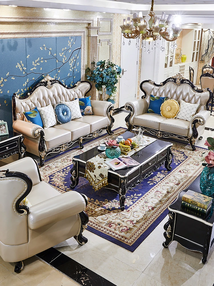 Luxurious European Style Genuine Leather Sofa Set - Elegant Black Ebony with Double-Sided Carvings, Premium Solid Wood for a Chic Living Room Experience