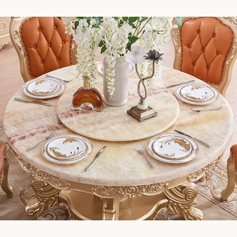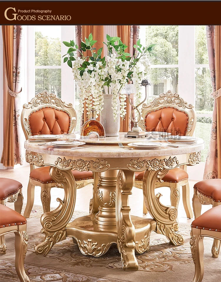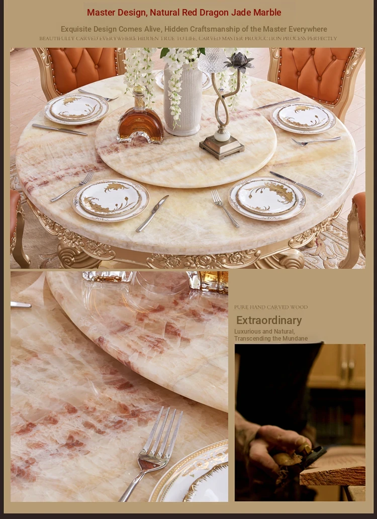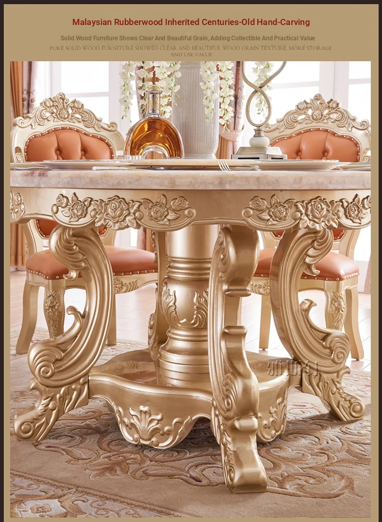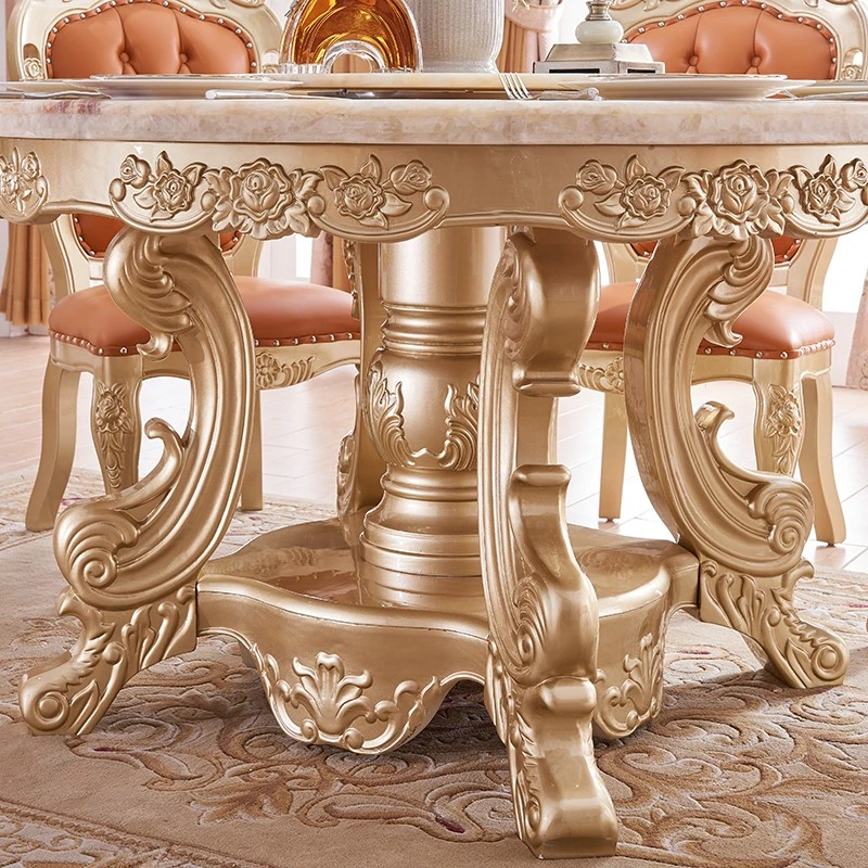 Luxurious European-Style Round Dining Table with Natural Marble Top and Elegant Golden Carved Solid Wood Base - Perfect for Upscale Entertaining and Dining Experiences.
