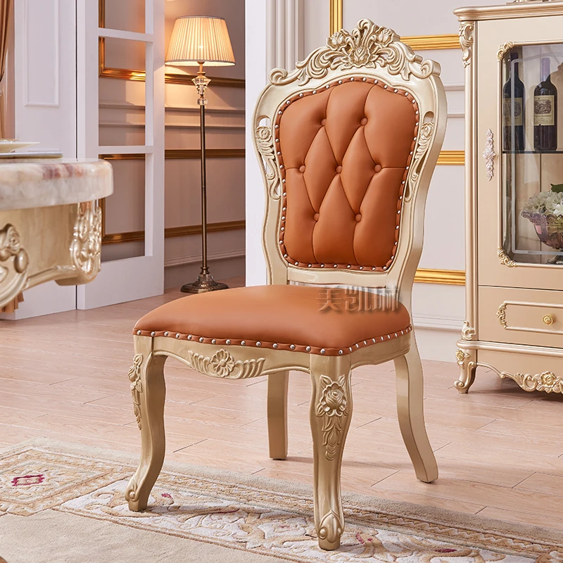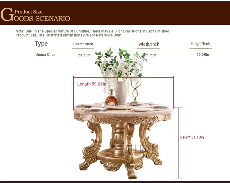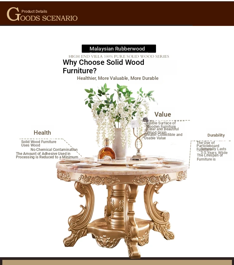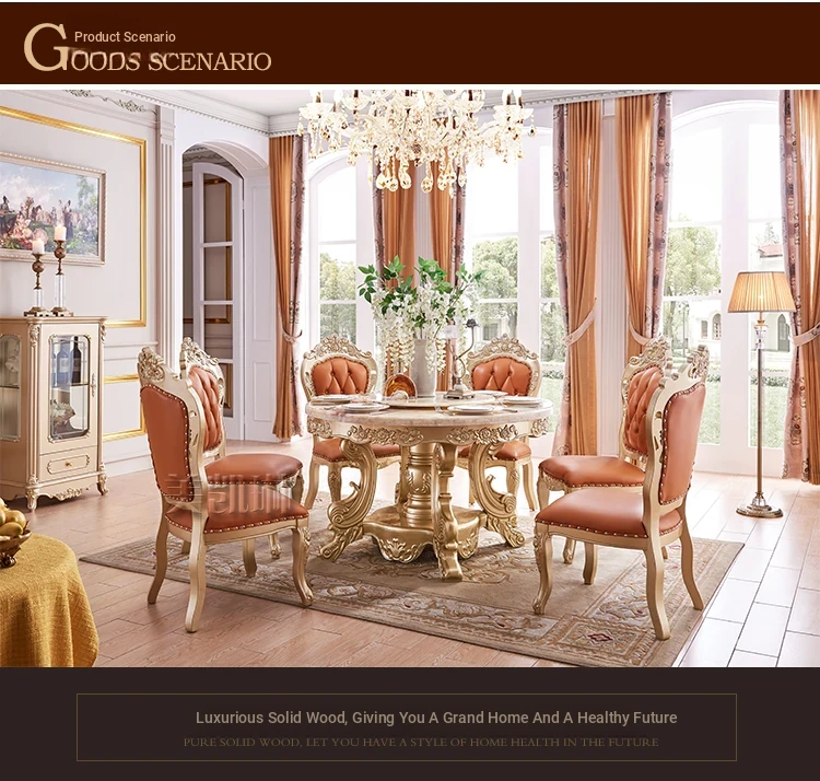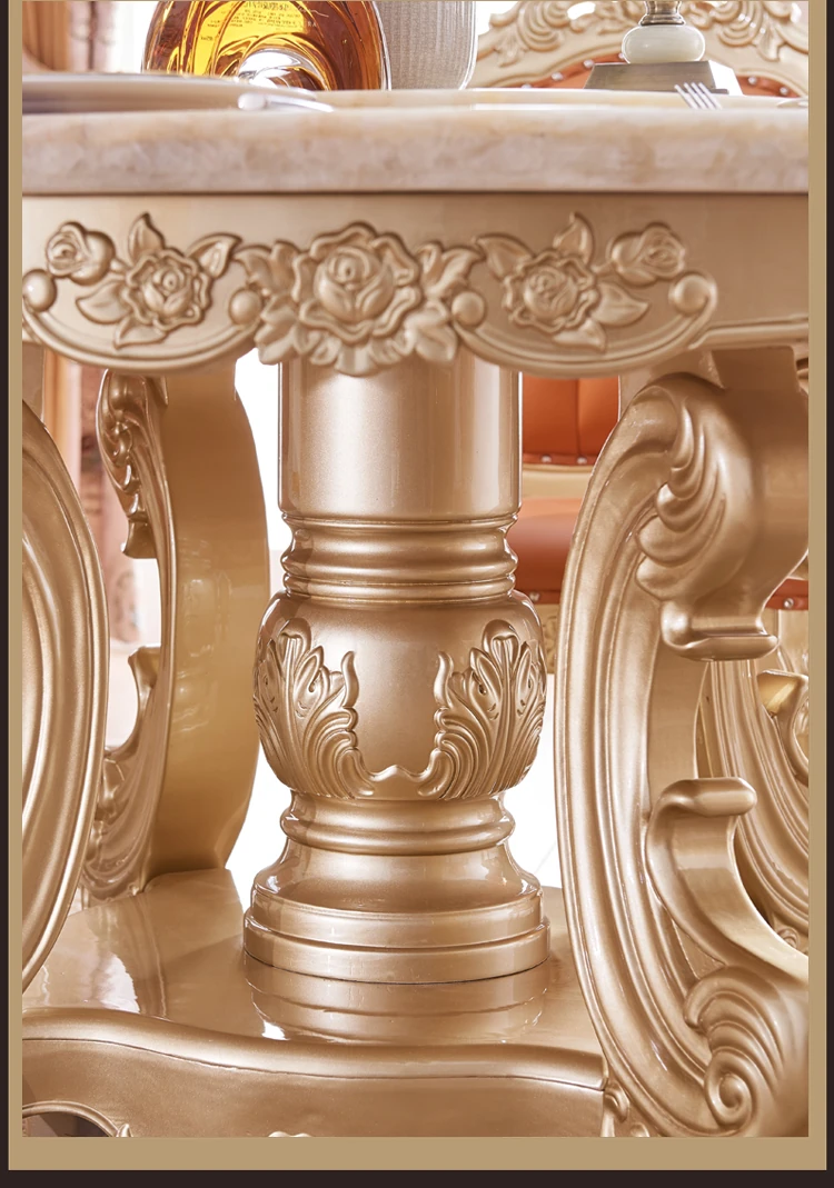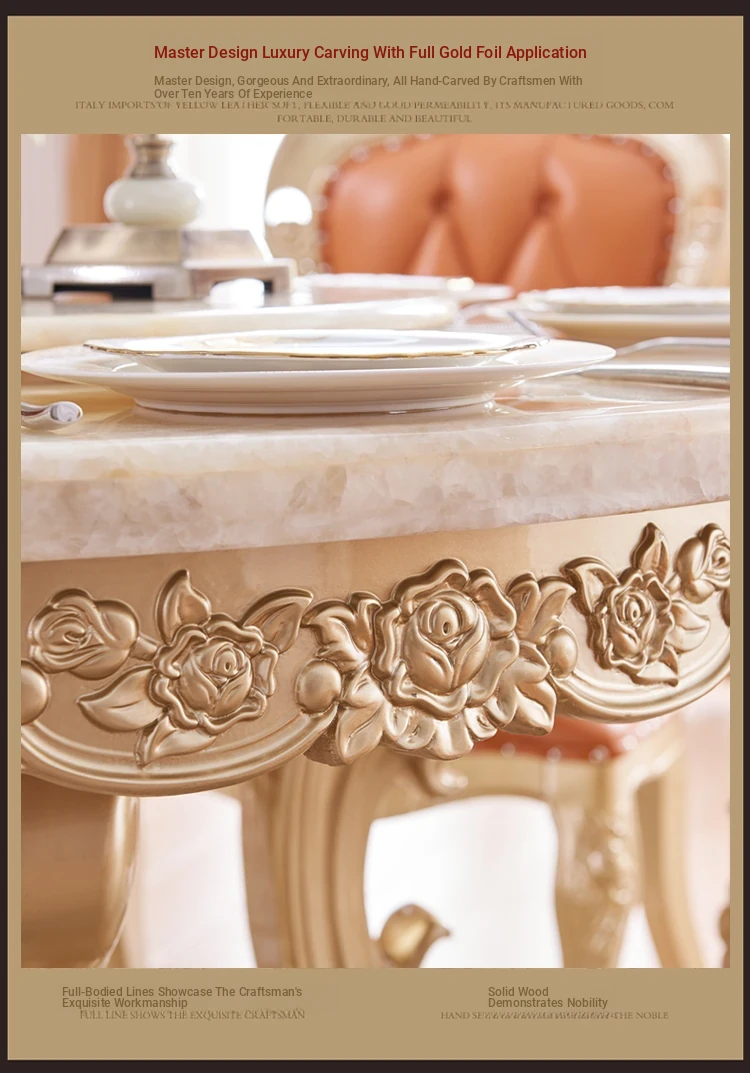 Luxurious European-Style Round Dining Table with Natural Marble Top and Elegant Golden Carved Solid Wood Base - Perfect for Upscale Entertaining and Dining Experiences.