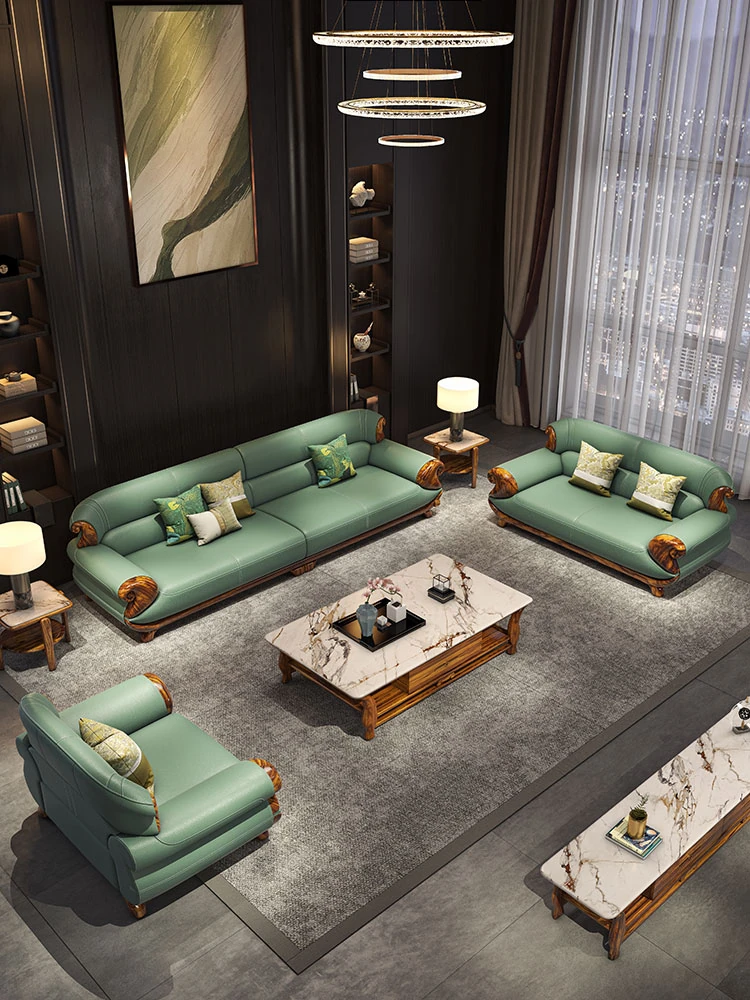 Modern Ebony Wood Genuine Leather Sofa - Luxury New Chinese Style Solid Wood Sofa Set for Villa Living Room Furniture