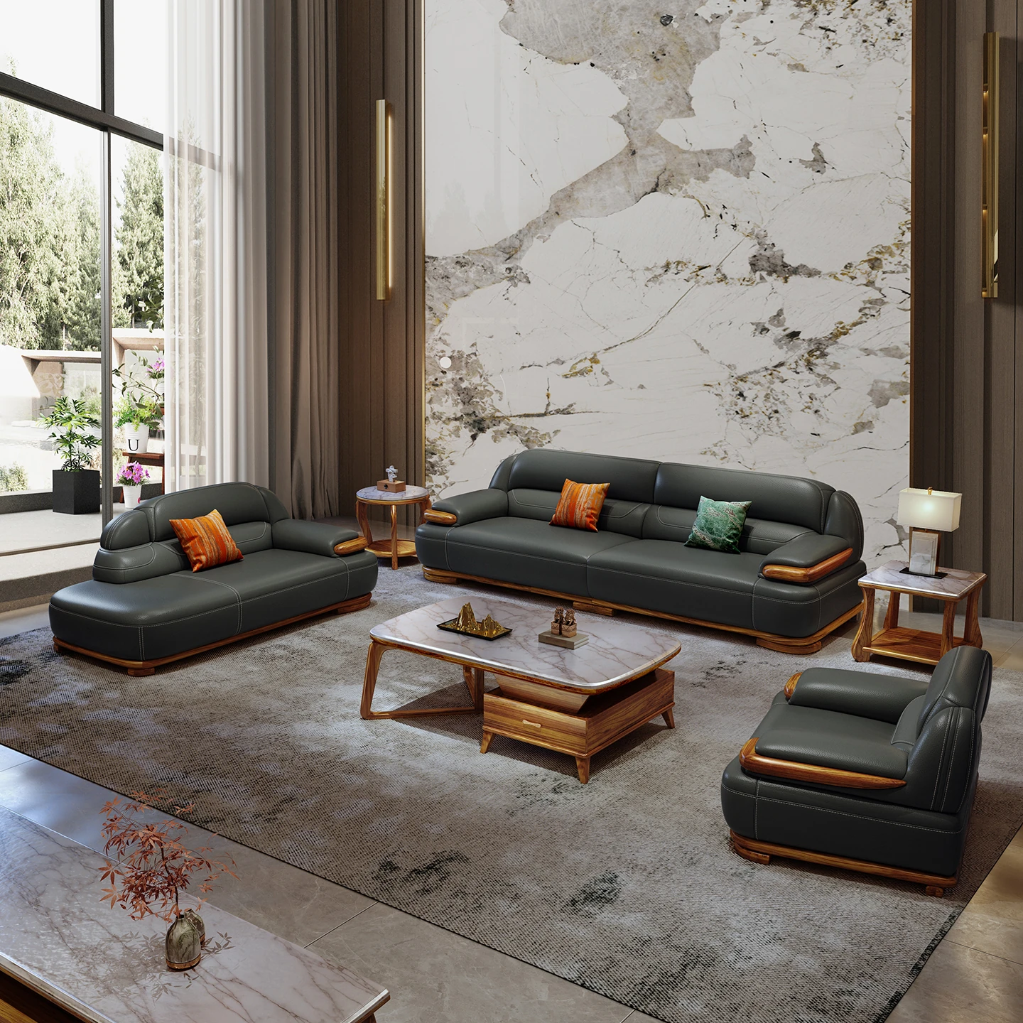 Luxury Modern Chinese Style Solid Wood Sofa Set with Top Layer Cowhide - Elegant Black Walnut Leather Sofa for Villa Living Room Furniture
