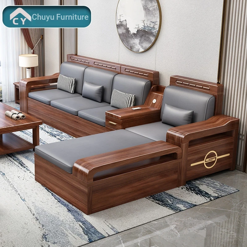 New Chinese Style Solid Wood Sofa Set - Versatile Winter-Summer Living Room Storage Corner L-Shaped Chaise Lounge Sofa