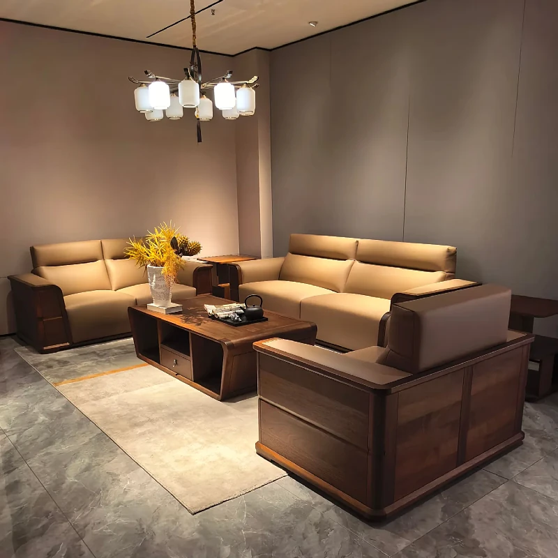 New Chinese Style Solid Wood Sofa Set - Walnut Wood, 2025 New Arrival for Spacious Villas, Minimalist Genuine Leather Furniture for Modern Living Rooms