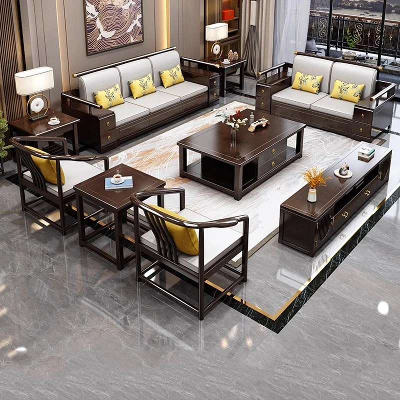 Stylish New Chinese Solid Black Gold Wood Sofa Set - All Solid Wood Living Room Furniture, Modern Design for Year-Round Use with High Storage Box Functionality