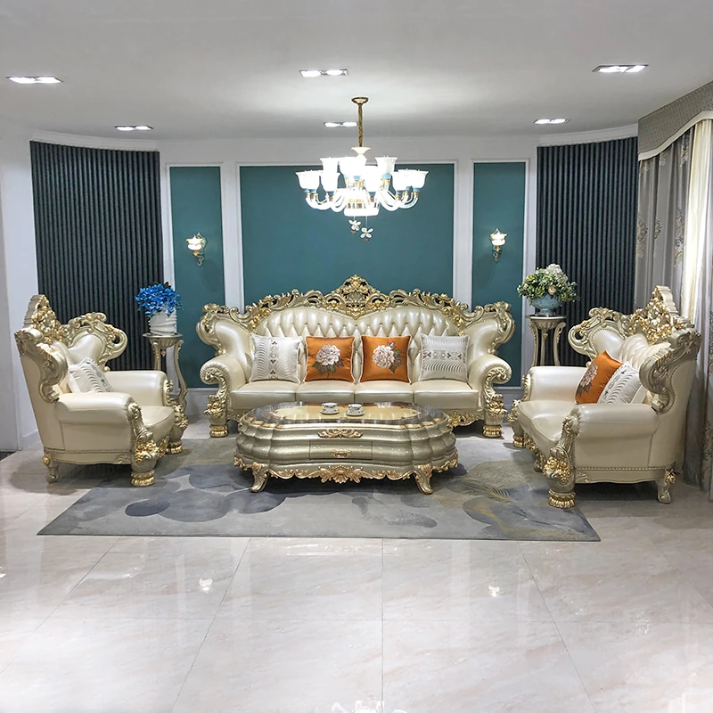 Luxurious European Leather Sofa Set for Spacious Villas - High-End Champagne Color Solid Wood Furniture for Elegant Living Rooms