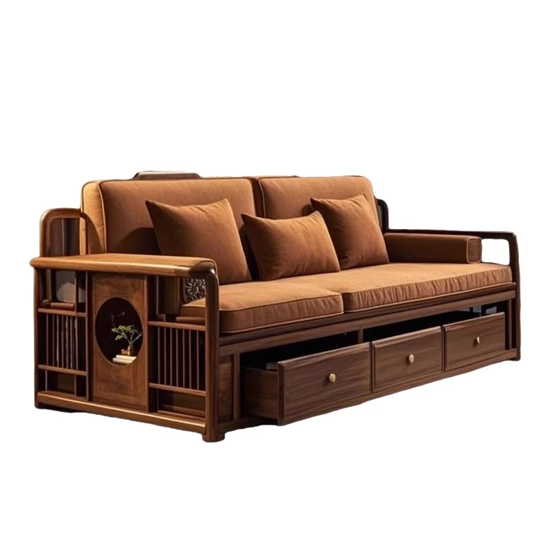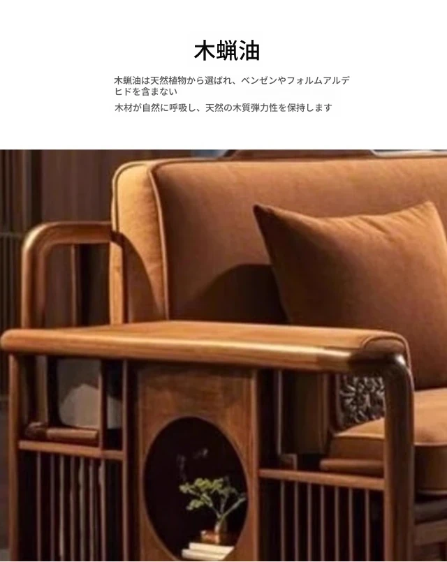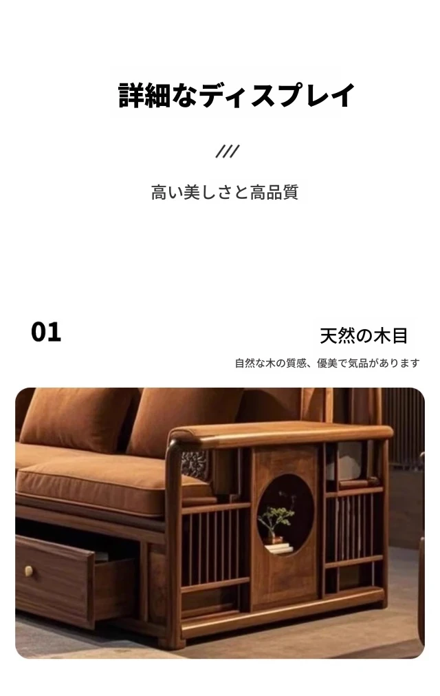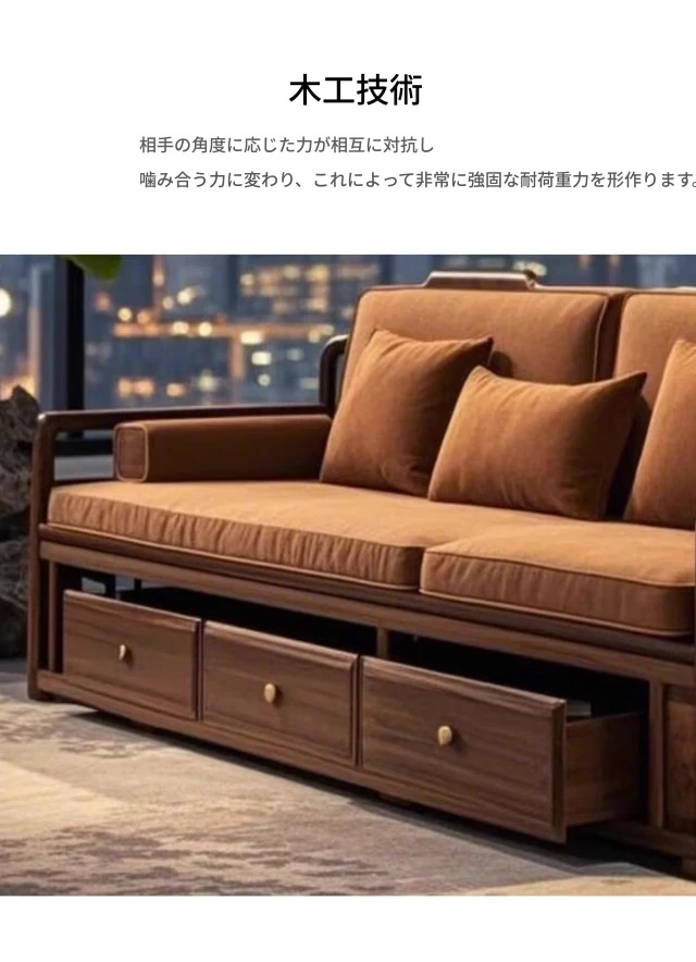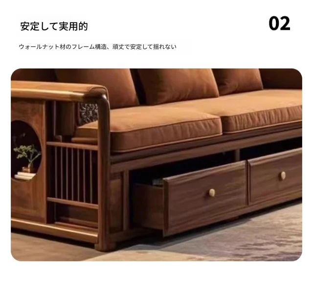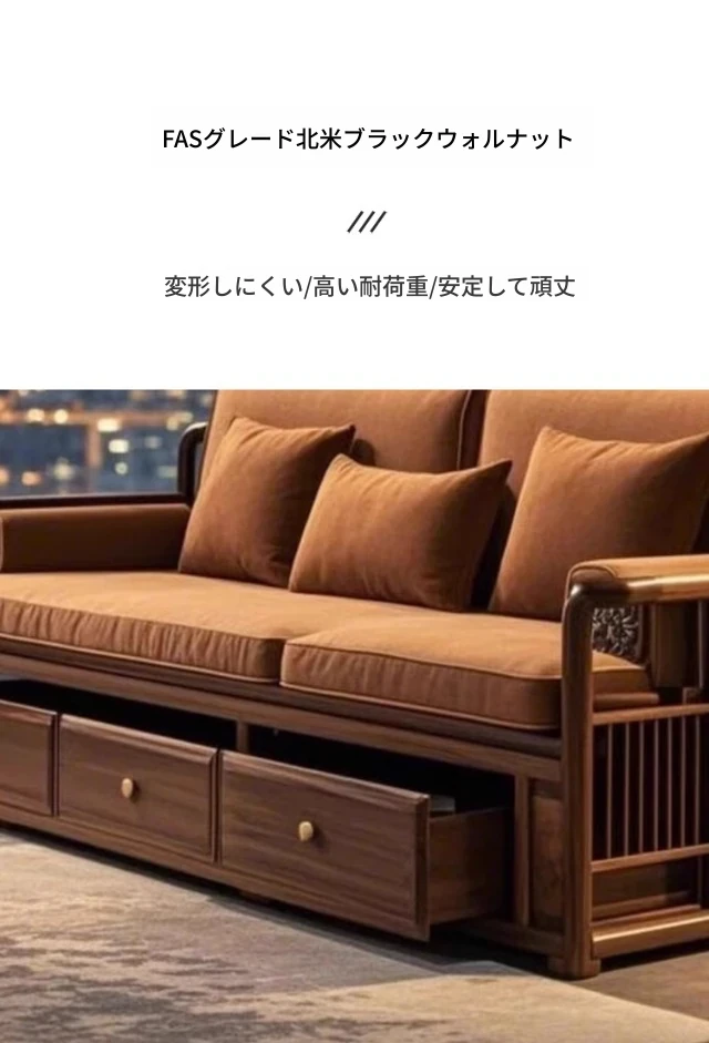 2025年新作!洗練された現代中式デザインのウォールナット無垢材3人掛けソファ。便利な引き出し収納付きで、スタイリッシュなリビング空間を演出します。家庭にぴったりの落ち着いた雰囲気をお楽しみください!