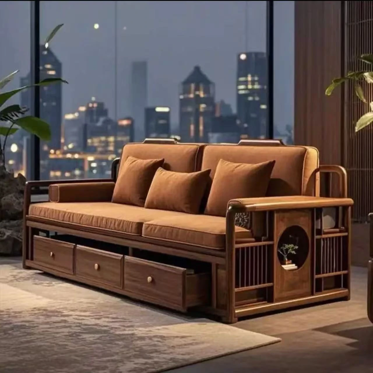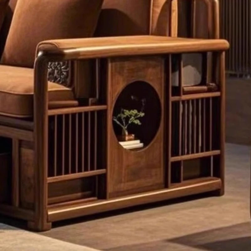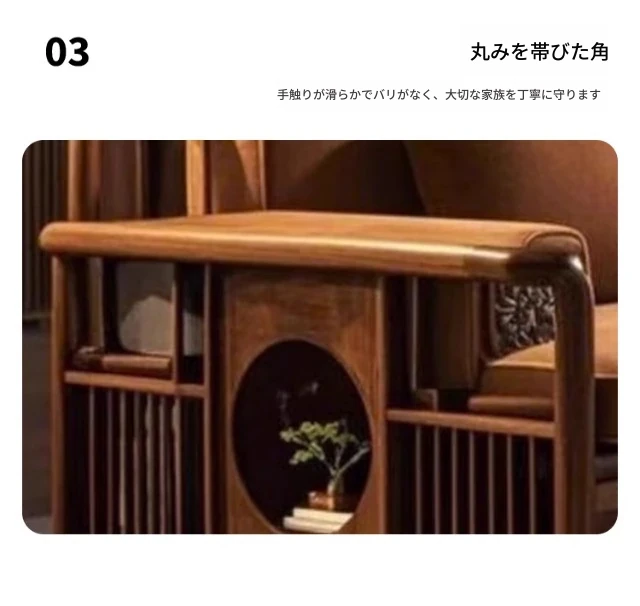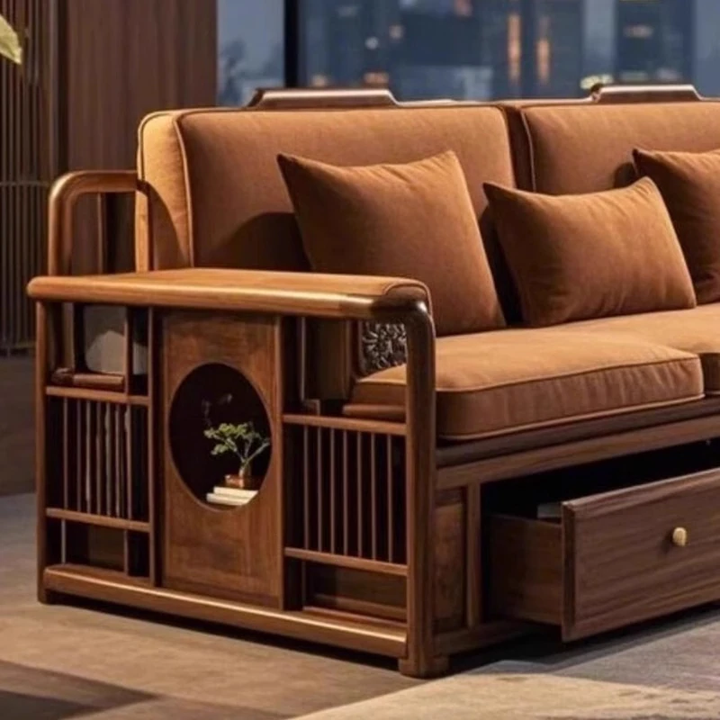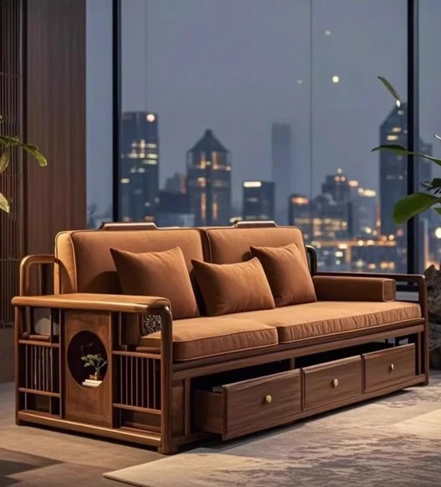 2025年新作!洗練された現代中式デザインのウォールナット無垢材3人掛けソファ。便利な引き出し収納付きで、スタイリッシュなリビング空間を演出します。家庭にぴったりの落ち着いた雰囲気をお楽しみください!