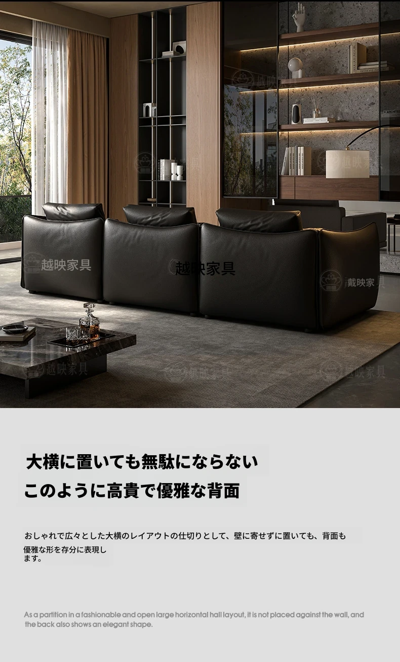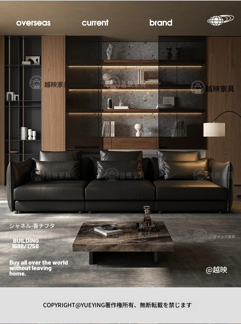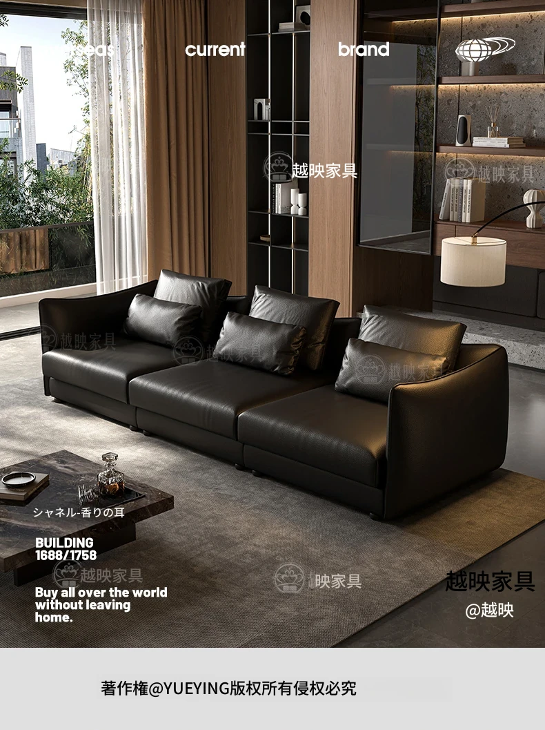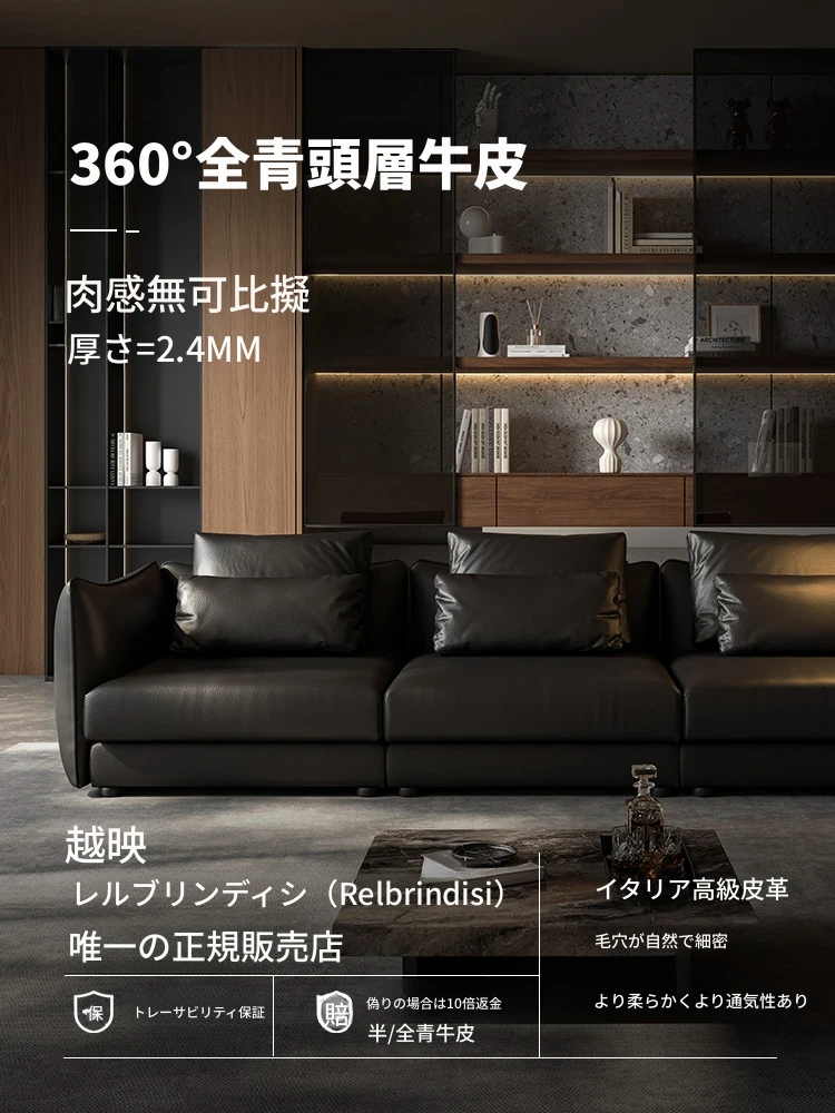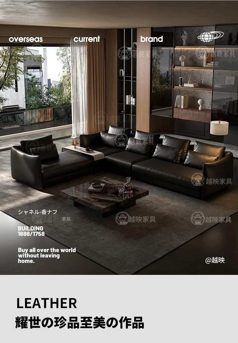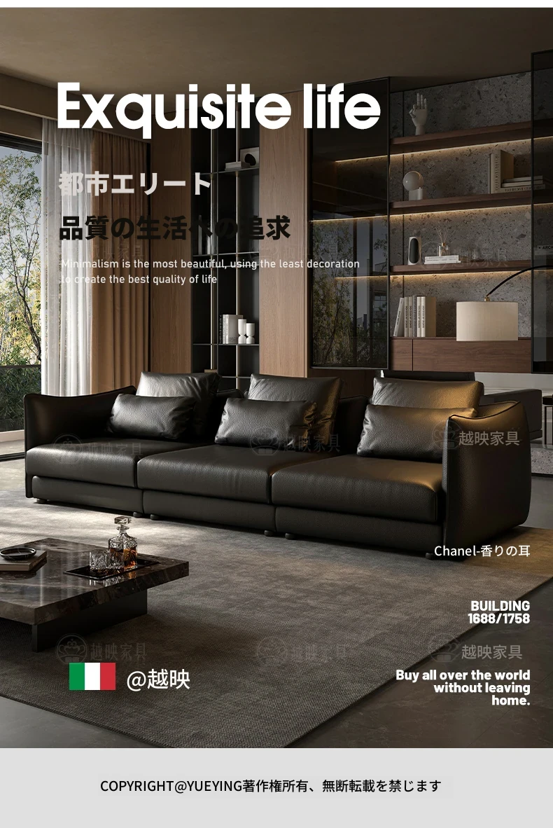 エレガントなチャンネル本革ソファー - イタリアンスタイルのリビングルーム用、輸入全青皮、大平層ヴィラにぴったりな現代的なシンプルデザイン。おしゃれで快適な空間を実現!