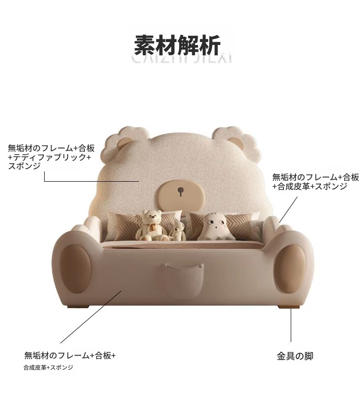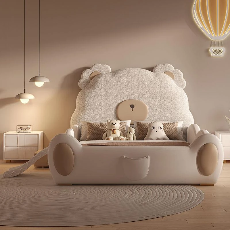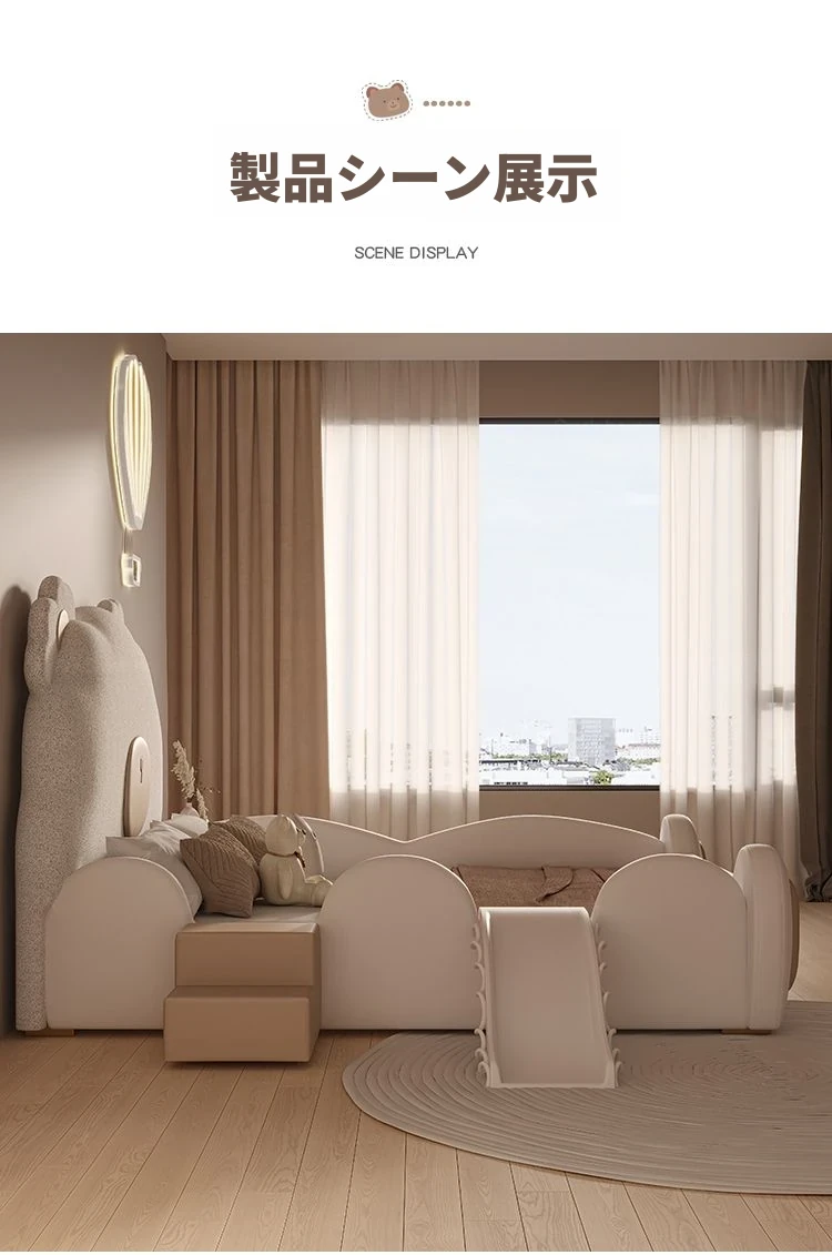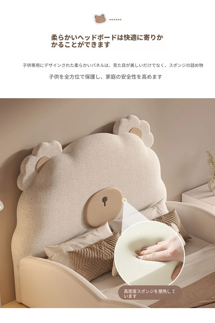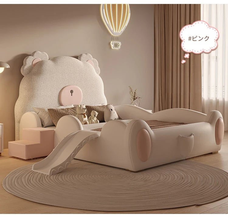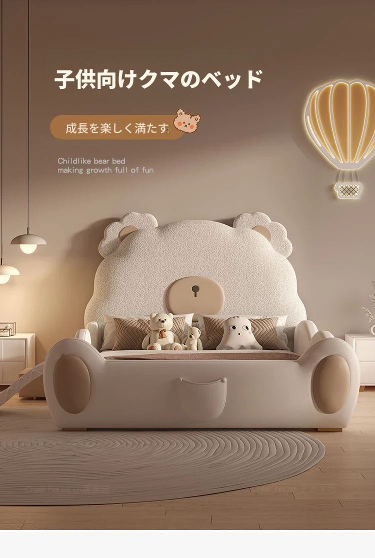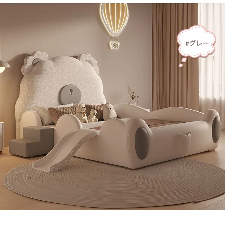 ユニークなカートゥーンデザインの小熊ベッド!男の子も女の子も大喜びのシングルサイズ。シンプルでモダンな高級感あふれる本革ベッドに、人気のスライド付き。お子様の夢の空間を演出します!