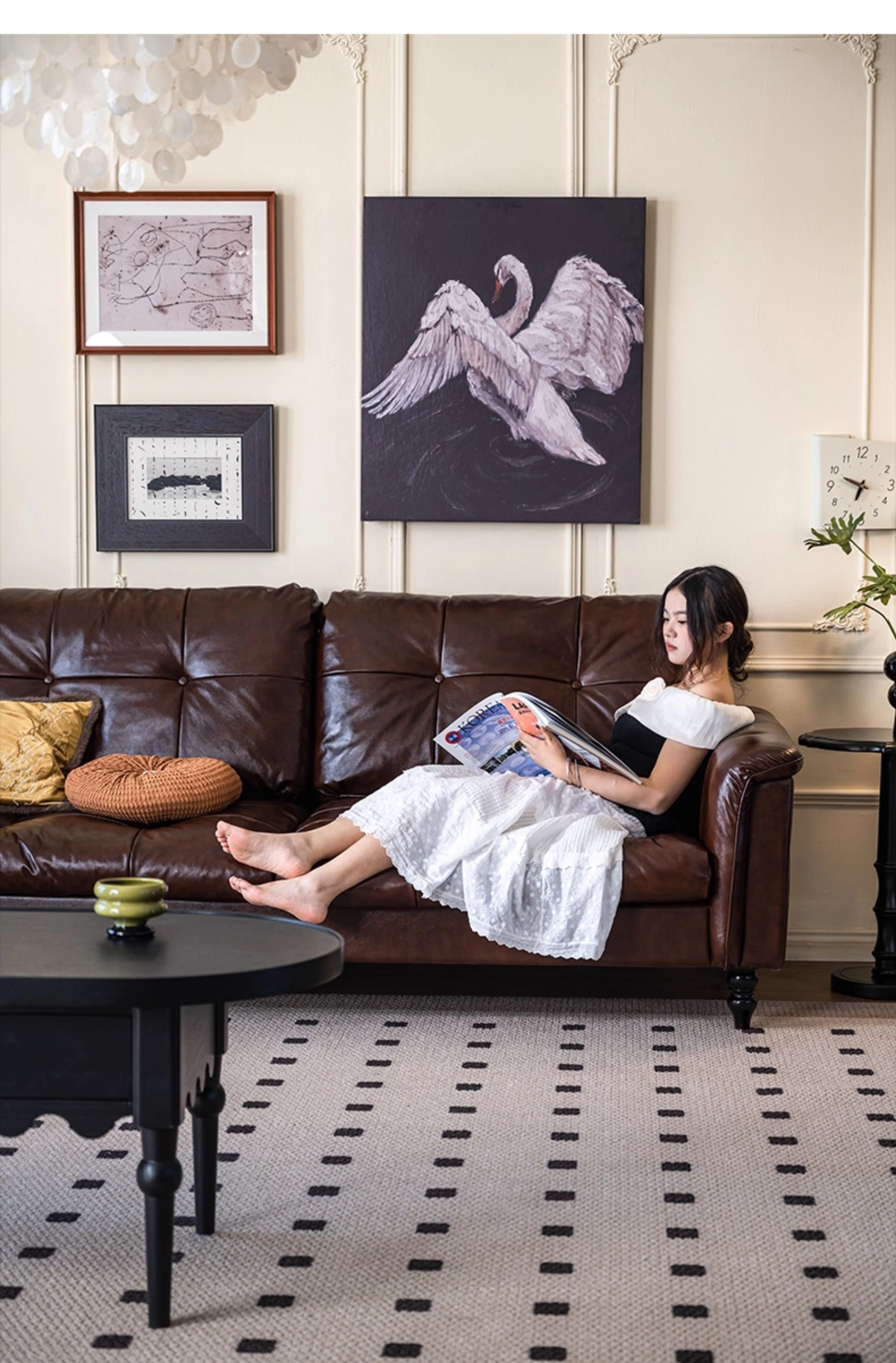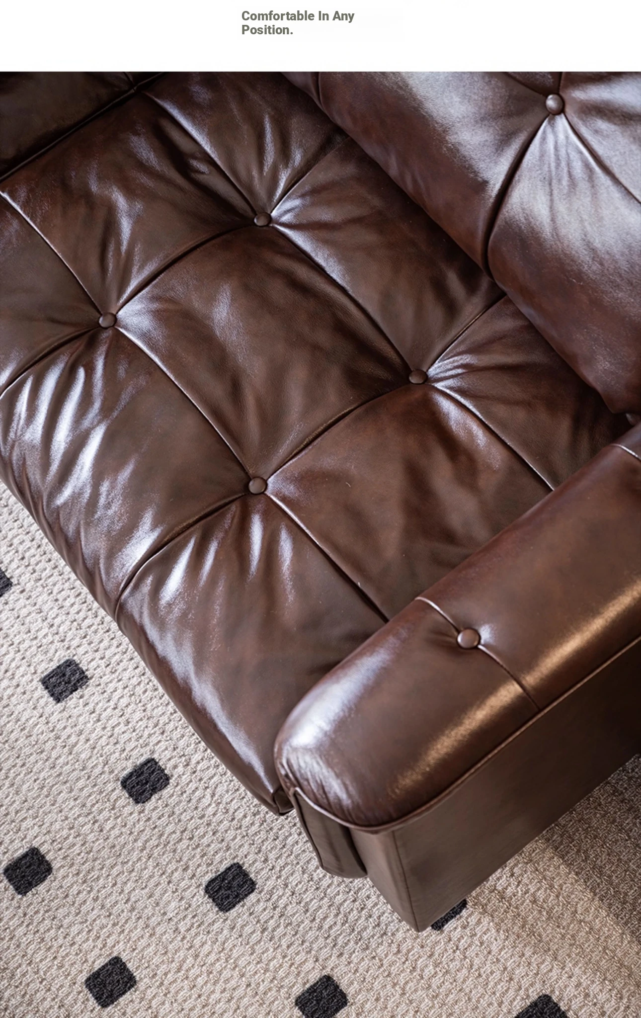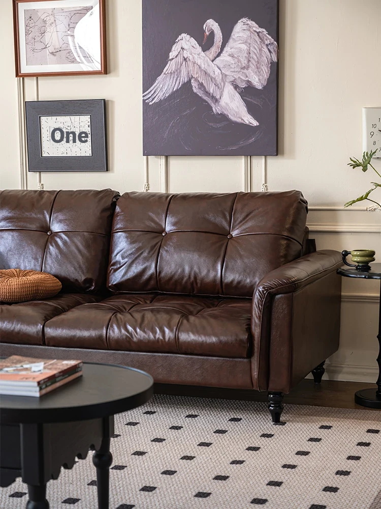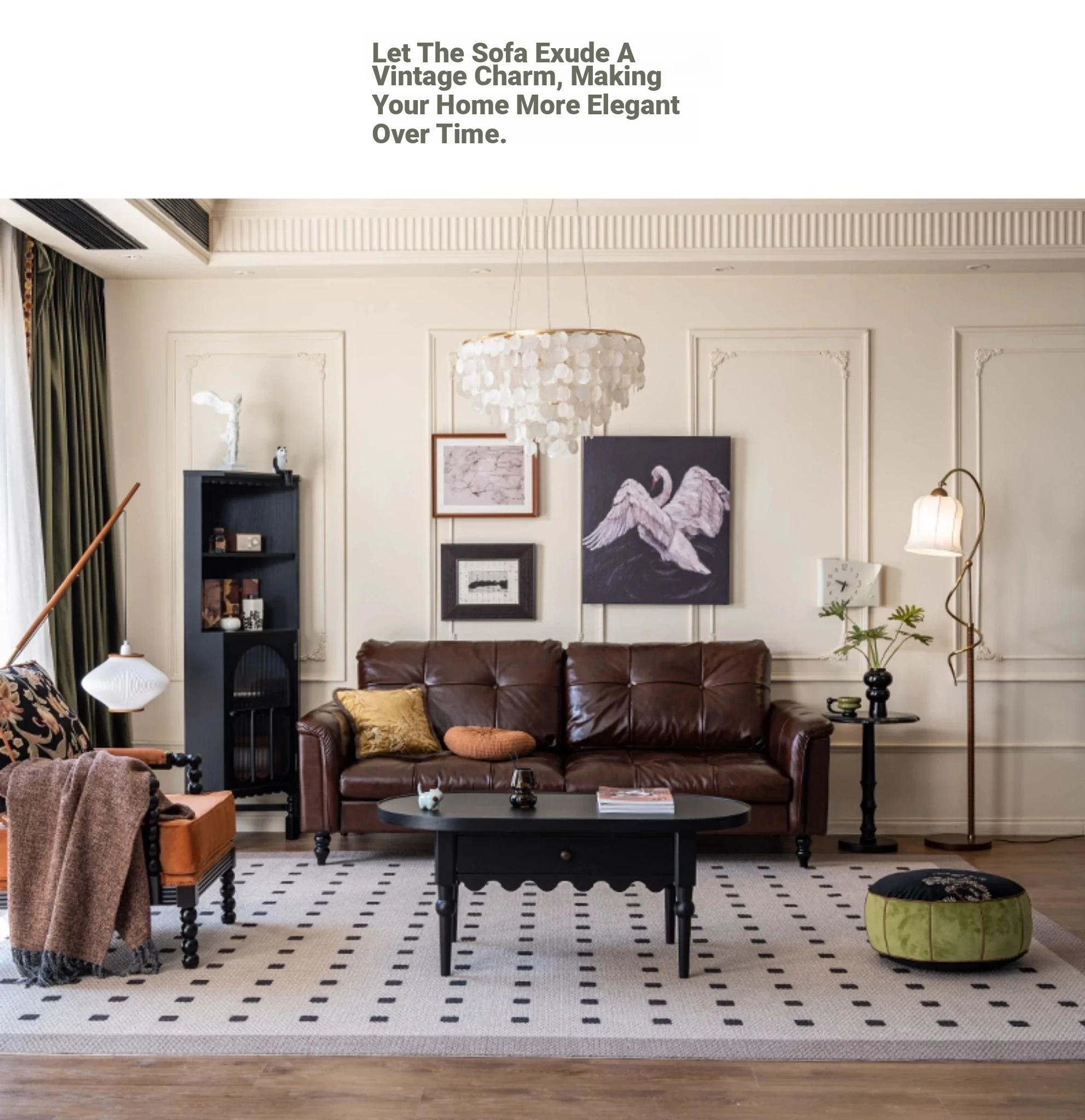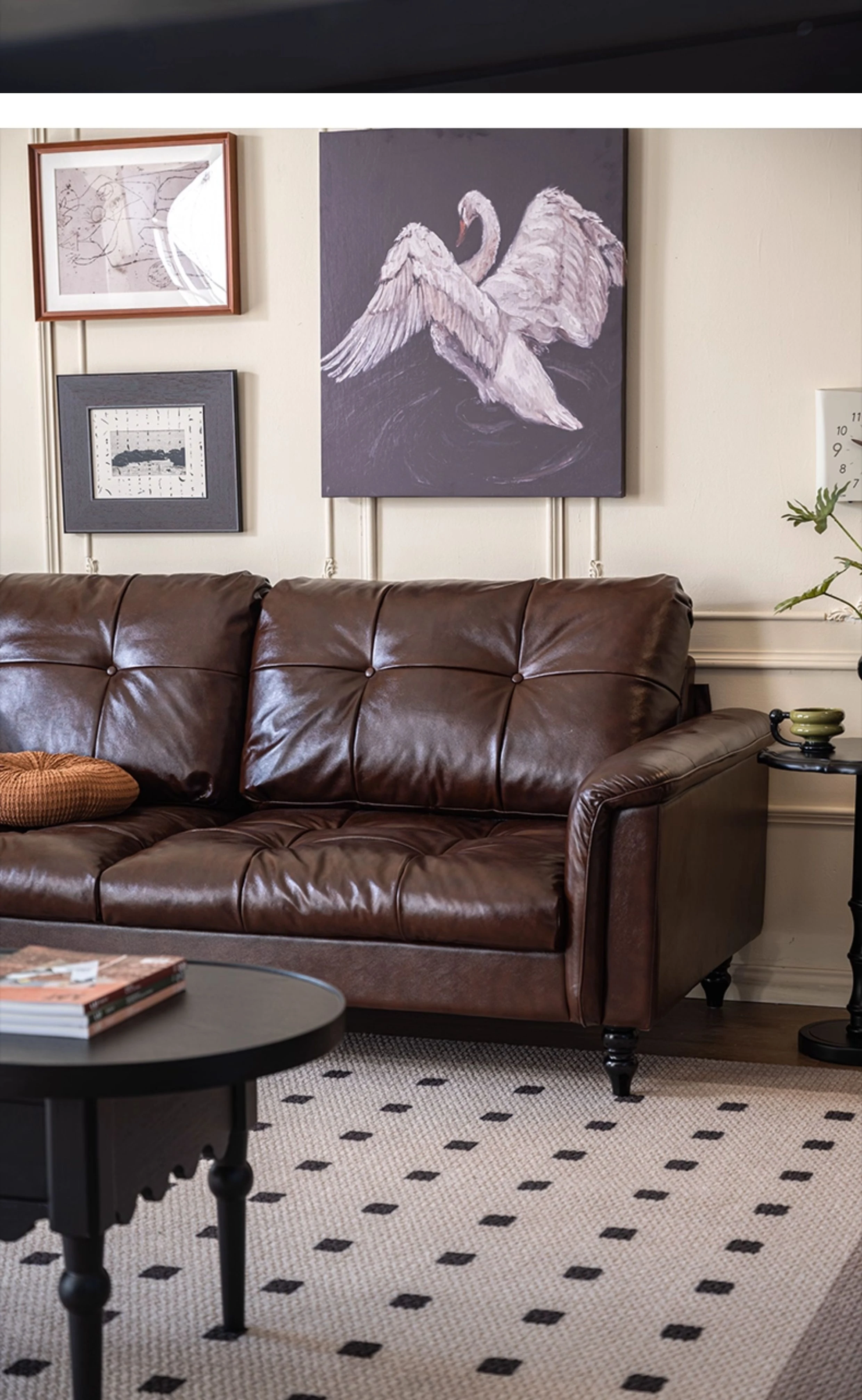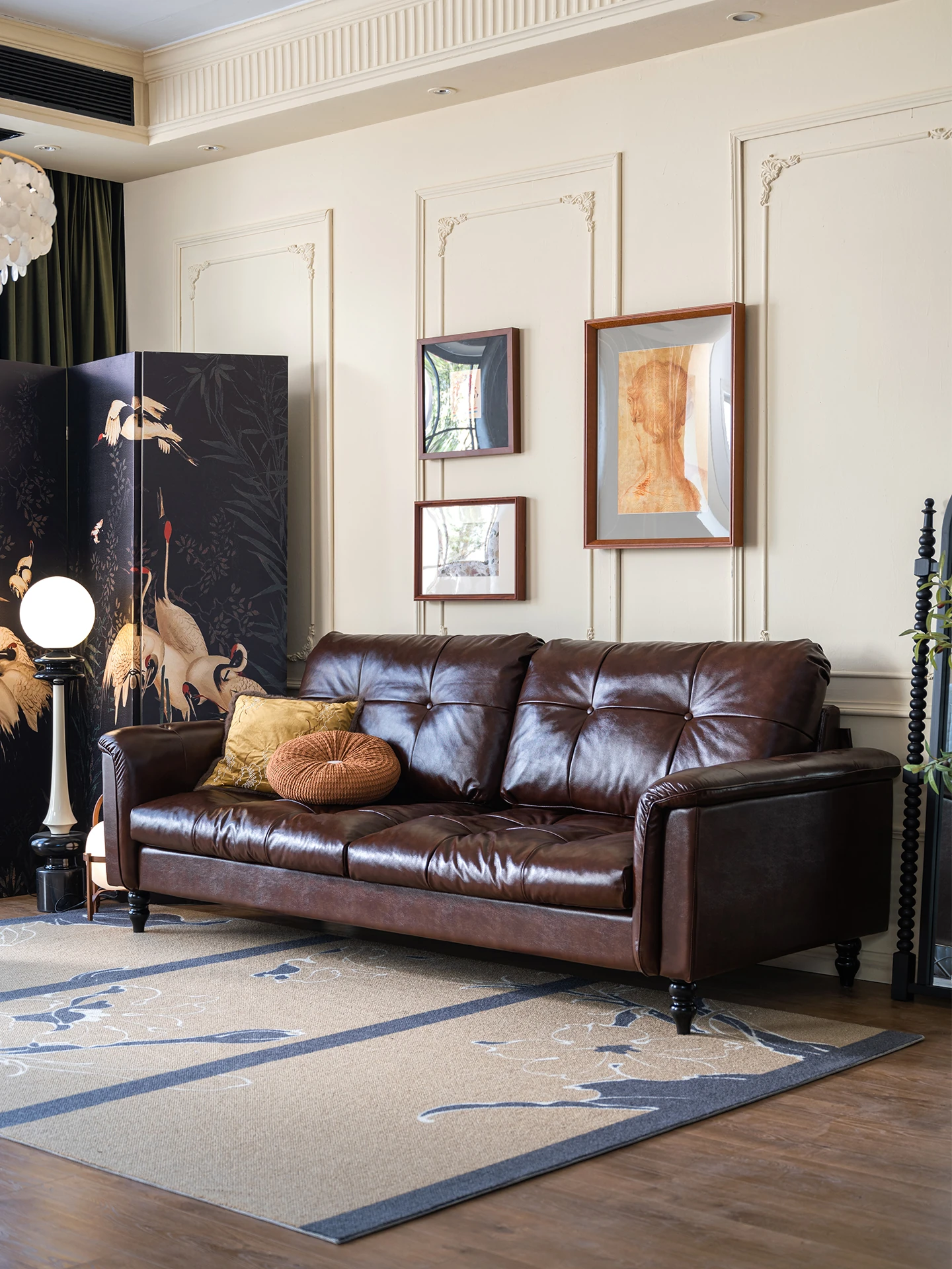 Elegant American Vintage Leather Sofa - Solid Wood, Top Grain Cowhide, Mid-Century Modern Design for Luxurious Living Rooms. Perfect Blend of Style and Comfort!