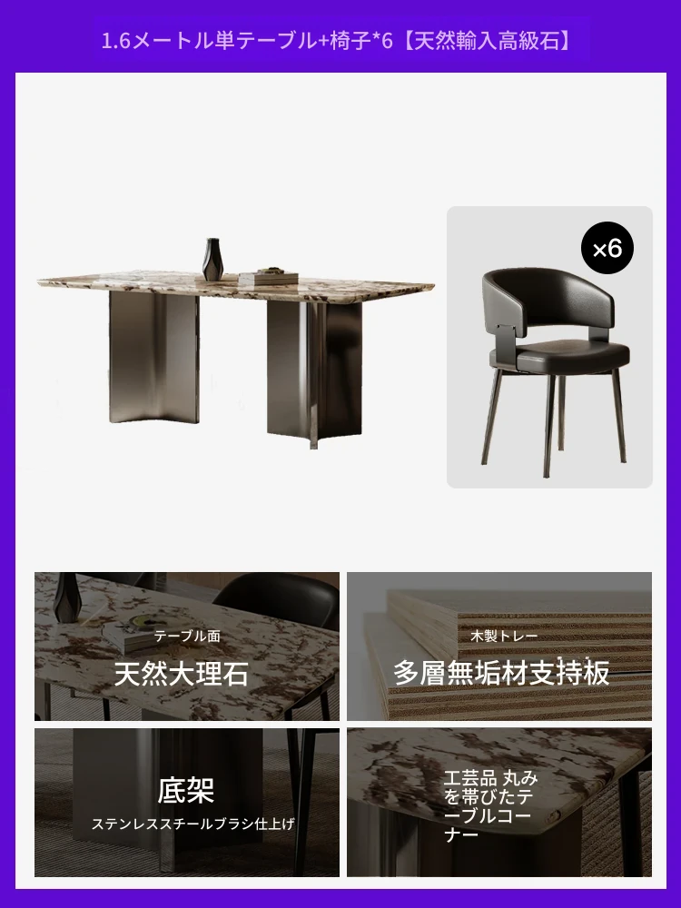 【36mm雪山飛狐大理石】1.6メートルダイニングテーブル+6椅子