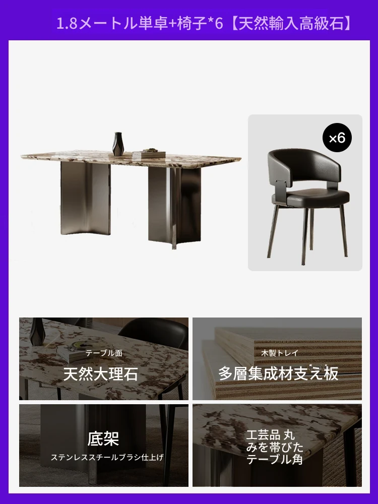 【36mm雪山飛狐大理石】2.2メートルダイニングテーブル+6椅子