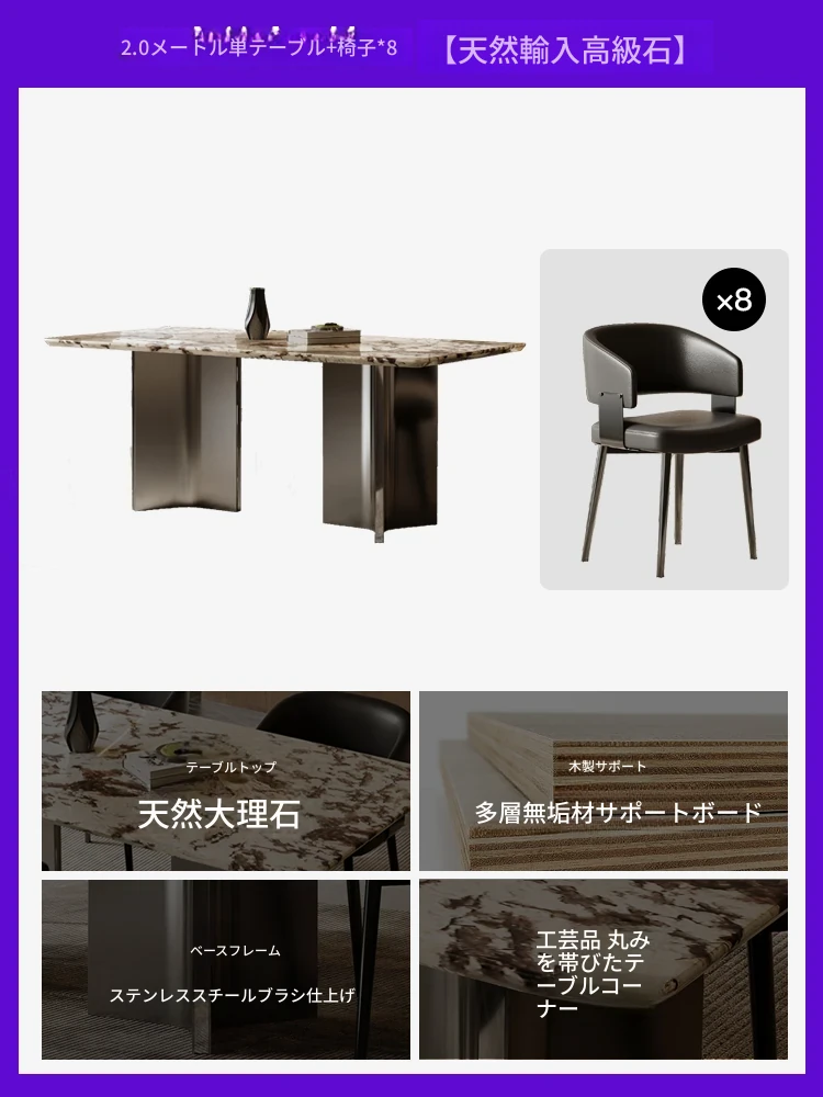 【36mm雪山飛狐大理石】2.0メートルダイニングテーブル+8椅子