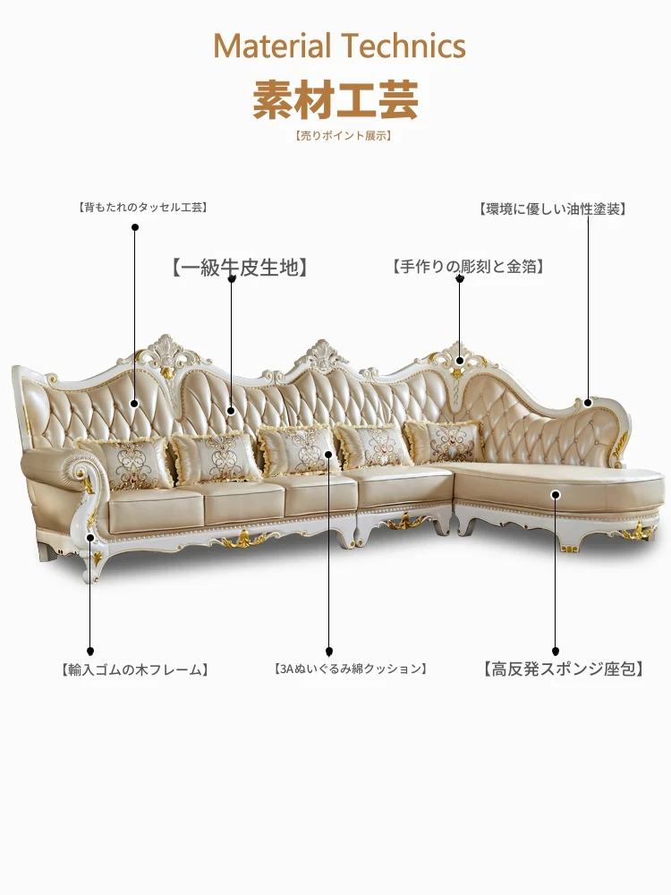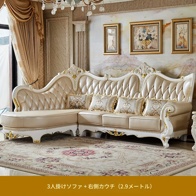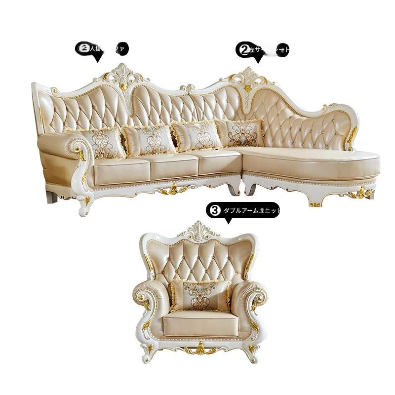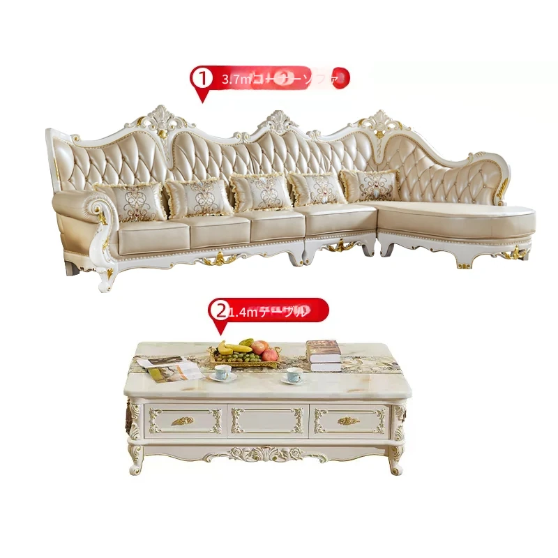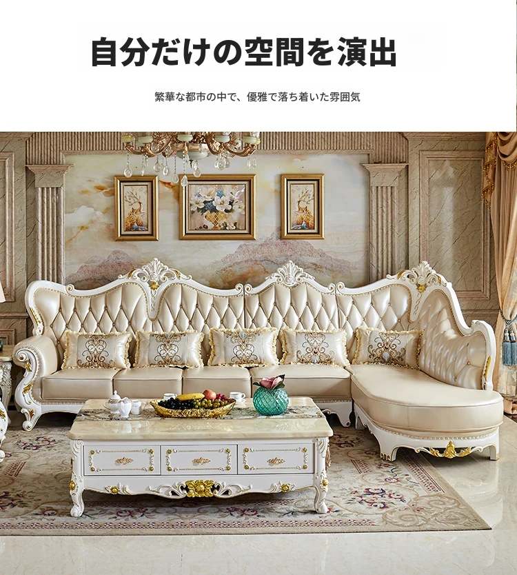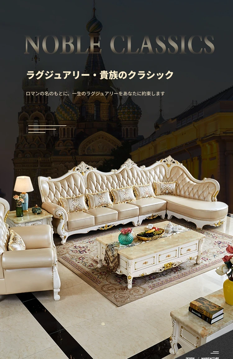 贅沢な欧風デザインの本革ソファセット - 豪華な全木彫刻仕上げ、広々としたリビングに最適なビラスタイルのコーナーソファ。あなたの空間を洗練された雰囲気で演出します!