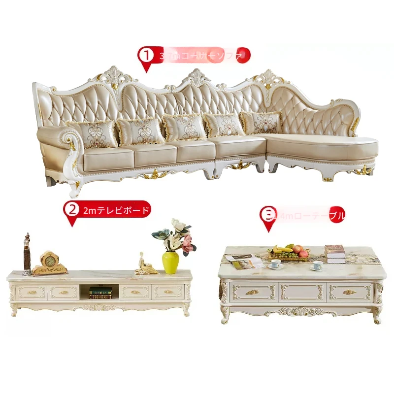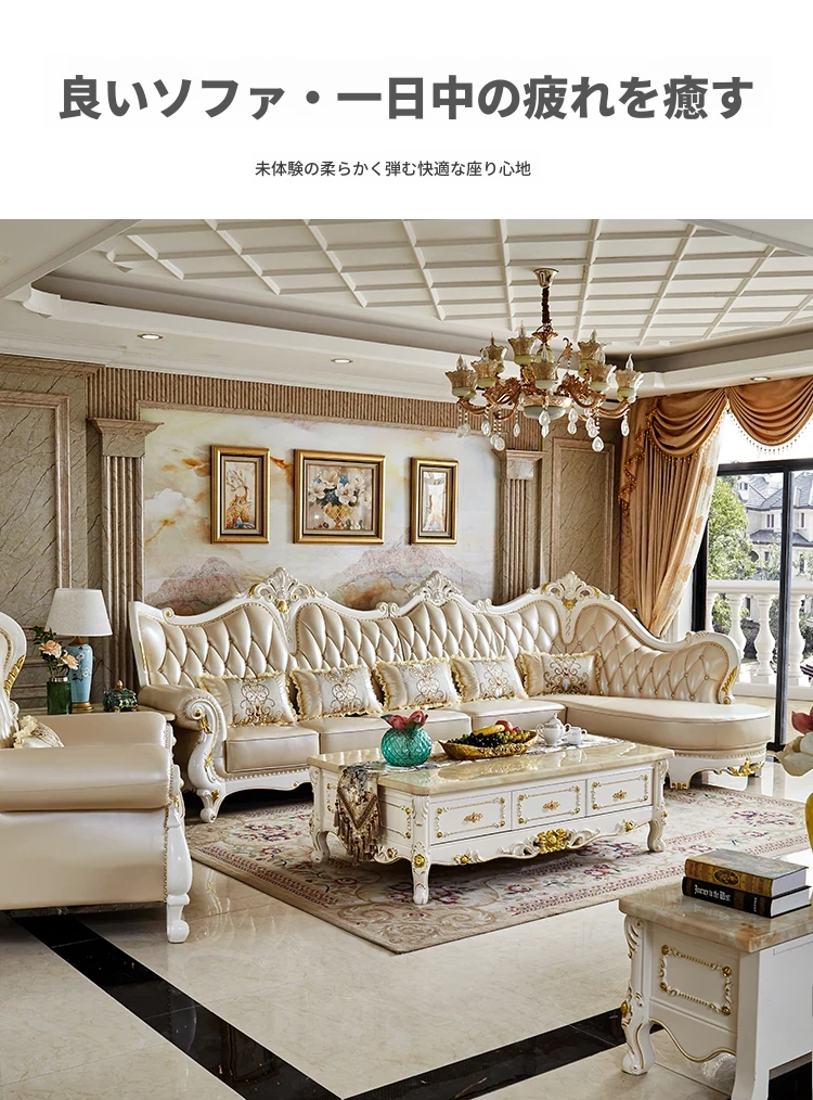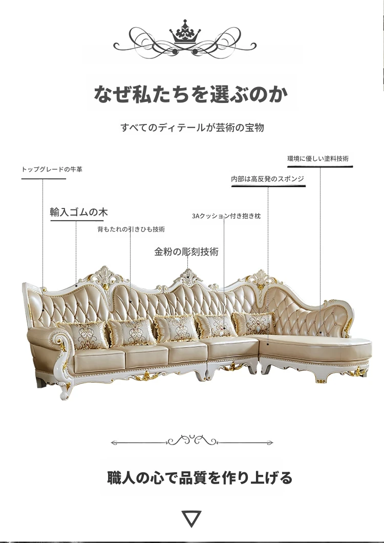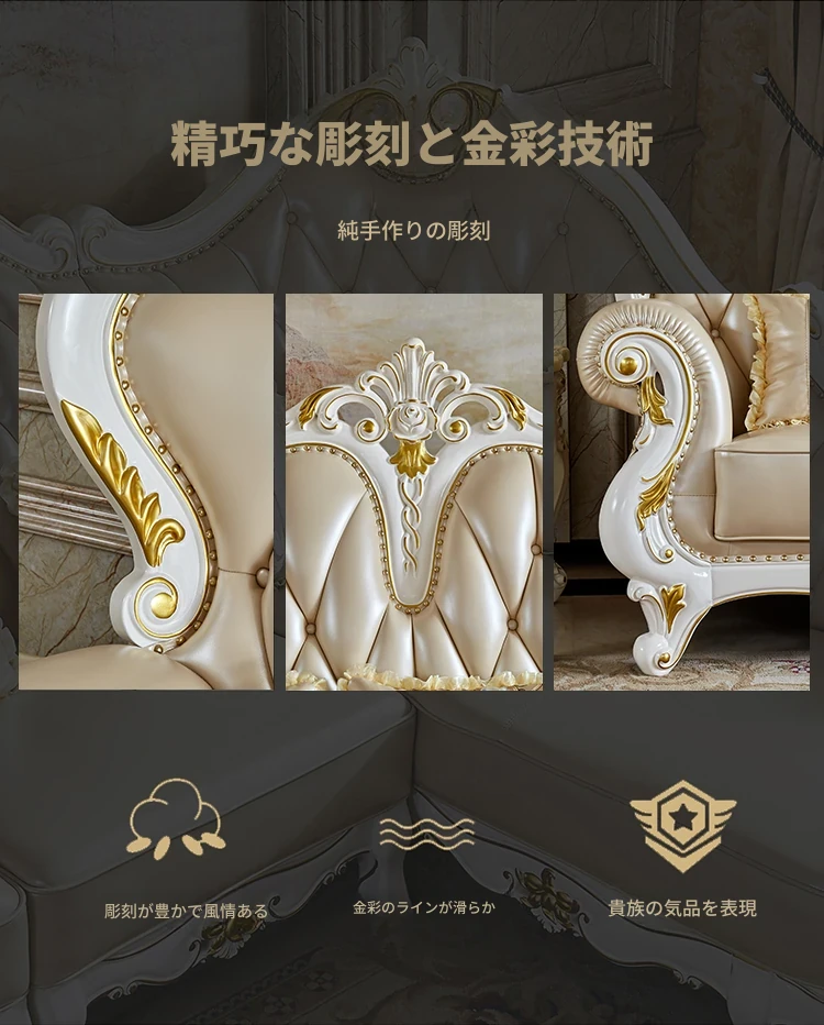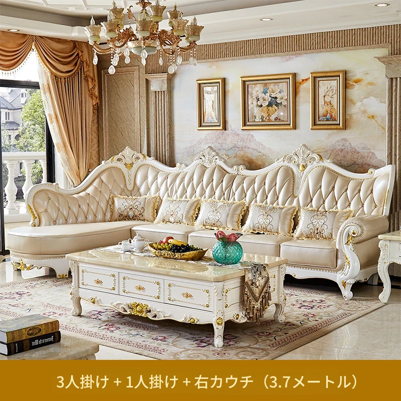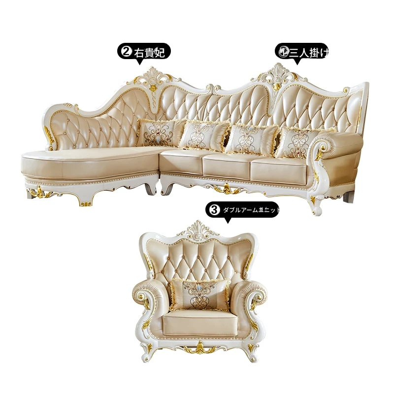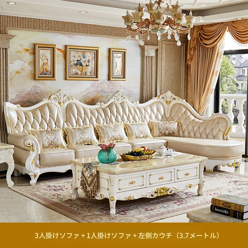 贅沢な欧風デザインの本革ソファセット - 豪華な全木彫刻仕上げ、広々としたリビングに最適なビラスタイルのコーナーソファ。あなたの空間を洗練された雰囲気で演出します!