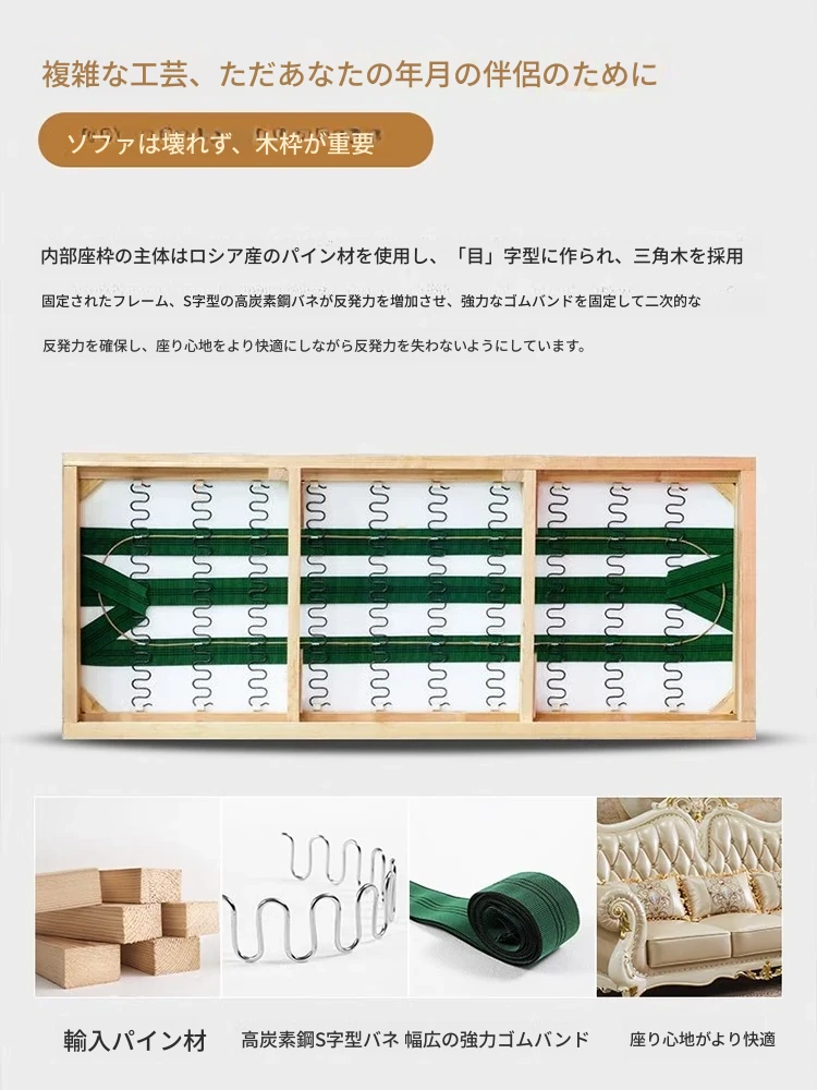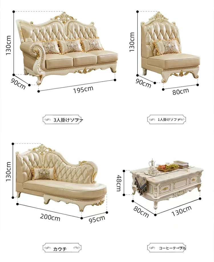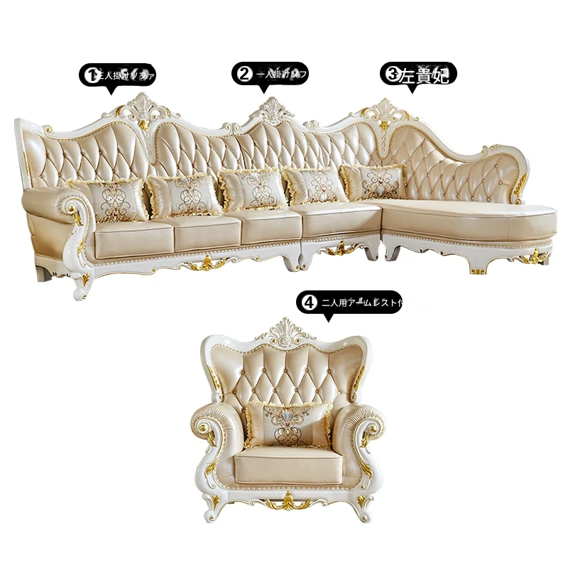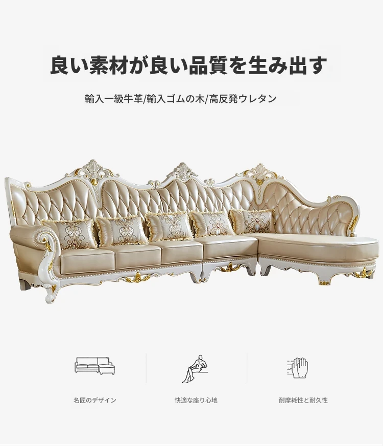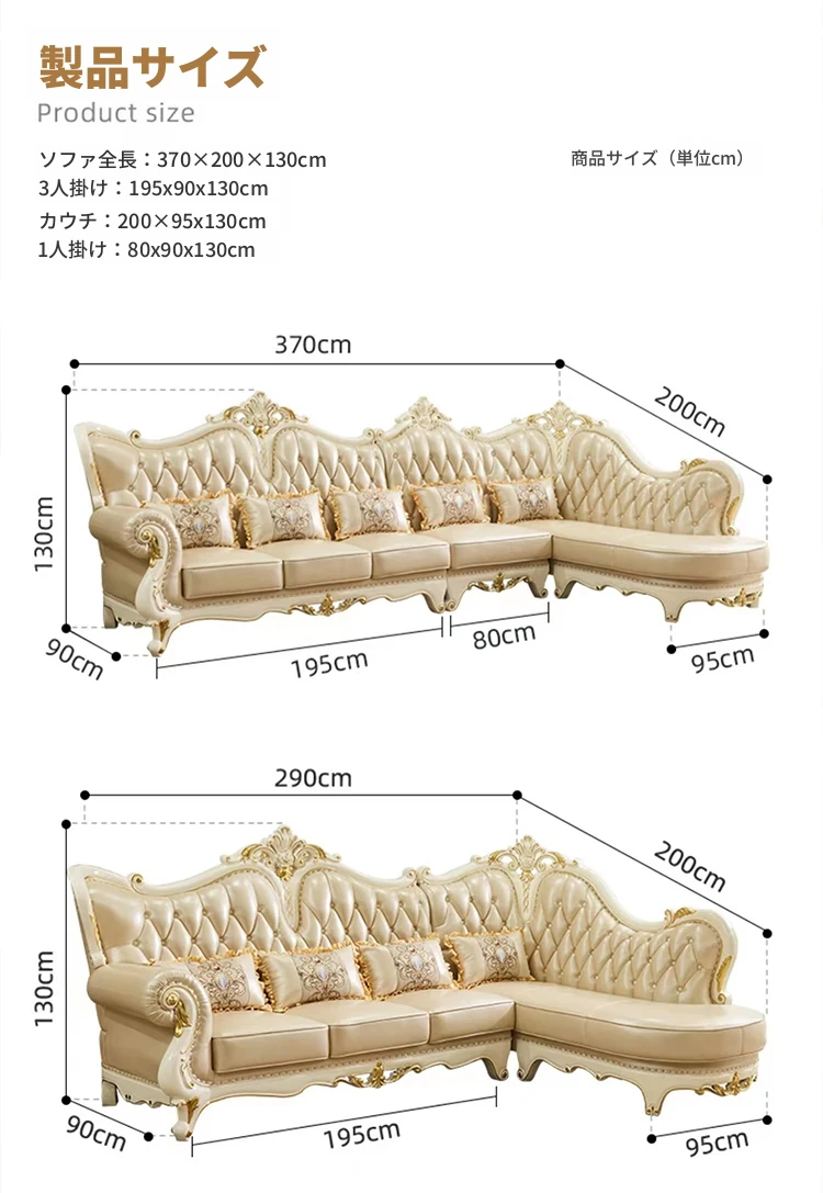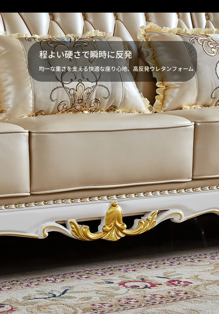 贅沢な欧風デザインの本革ソファセット - 豪華な全木彫刻仕上げ、広々としたリビングに最適なビラスタイルのコーナーソファ。あなたの空間を洗練された雰囲気で演出します!