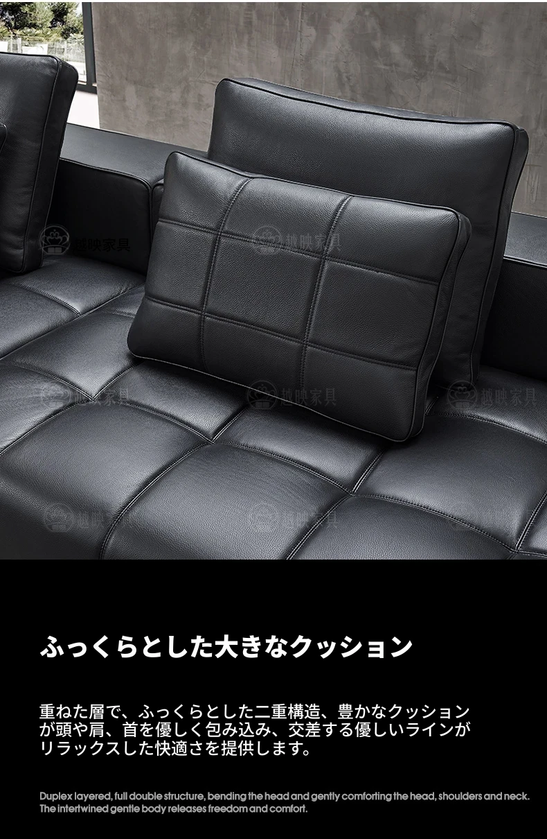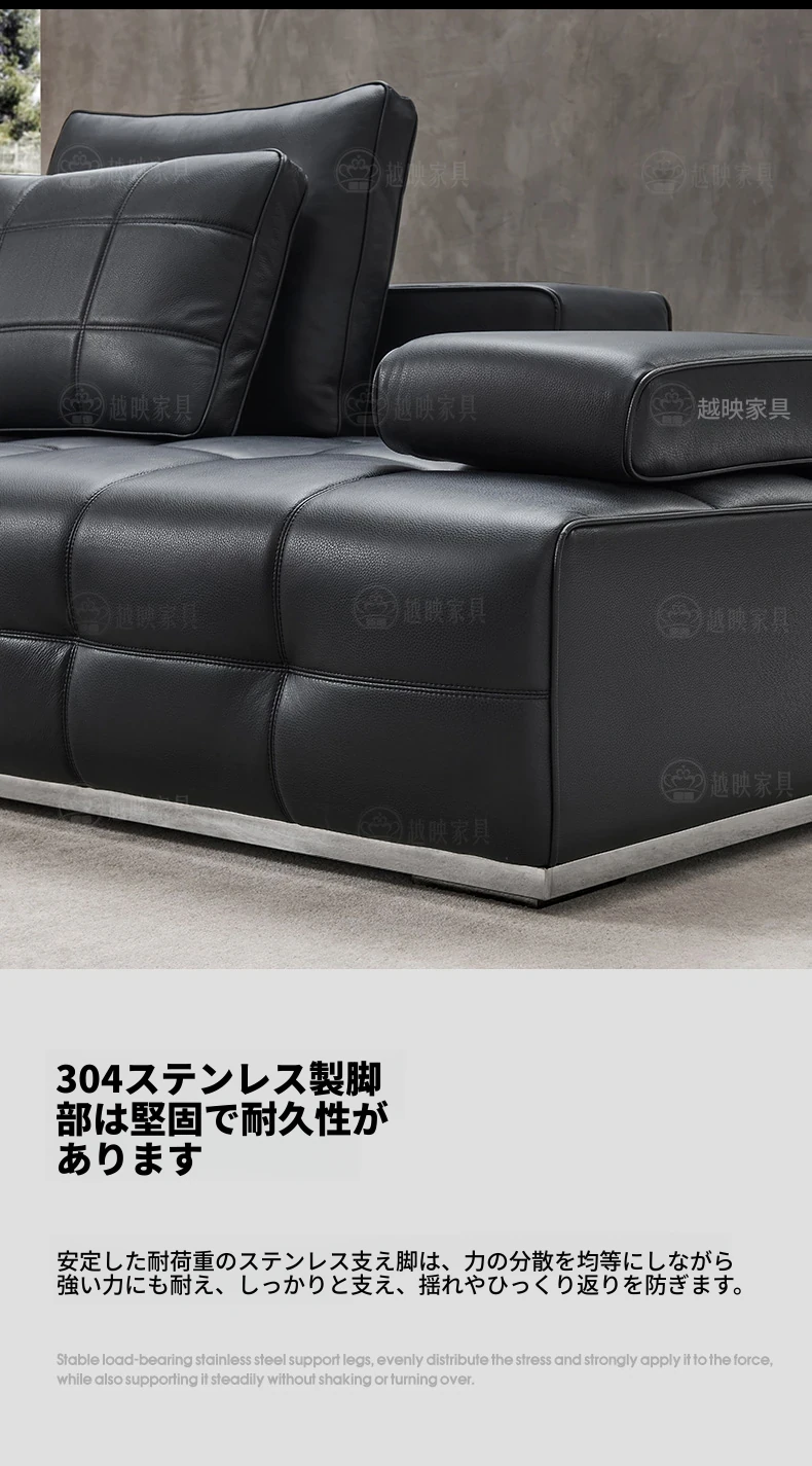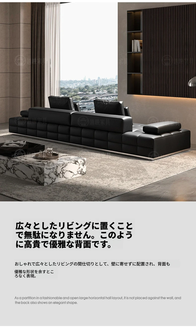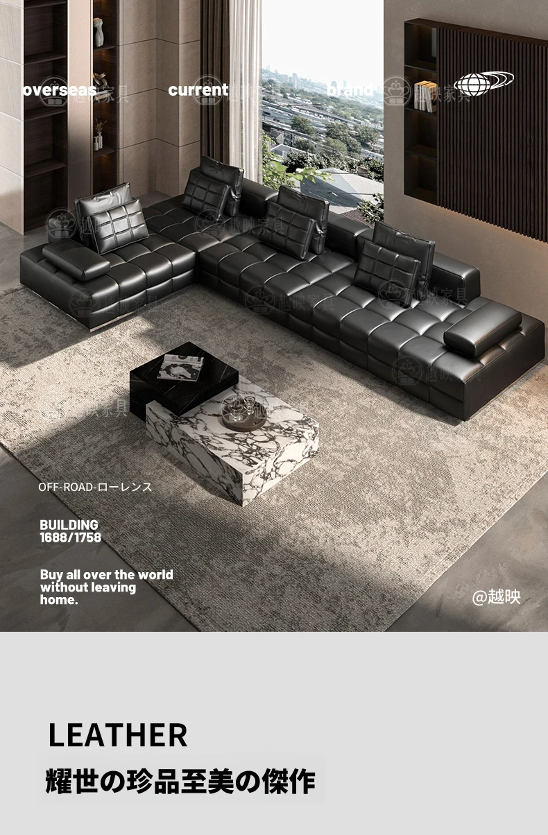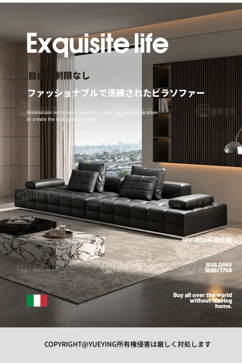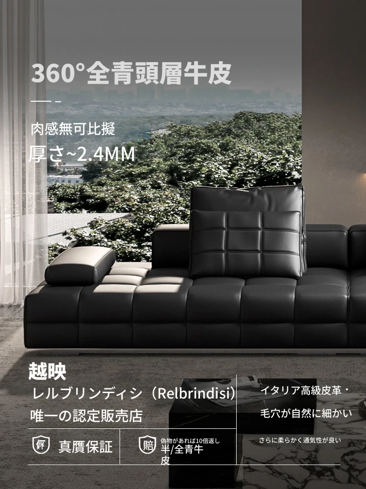 高級全皮製ラウレンスソファー - モダンなイタリアンミニマリズム、シックなブラックカラーでリビングを格上げ!全青皮使用で贅沢な座り心地を実現。広々とした空間にぴったりのデザインです。
