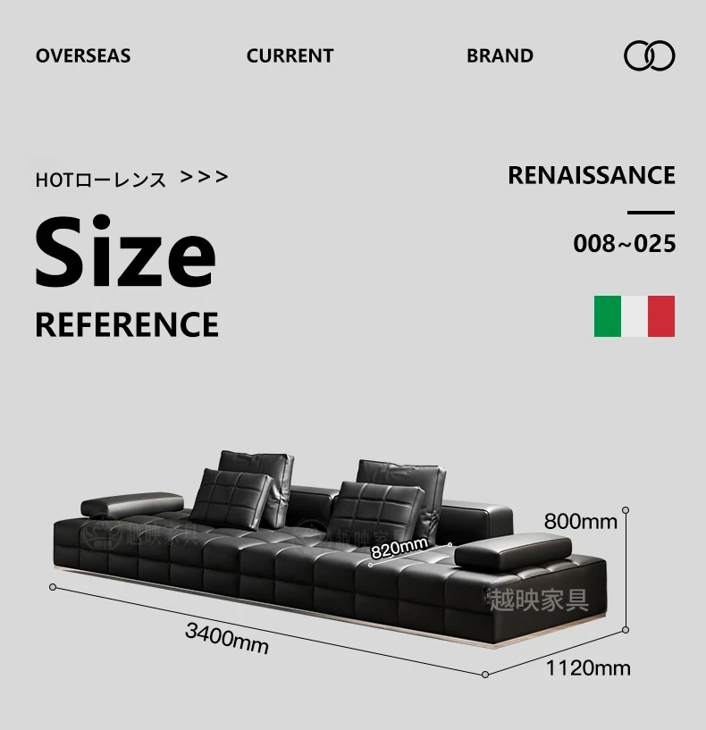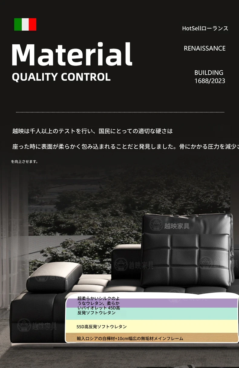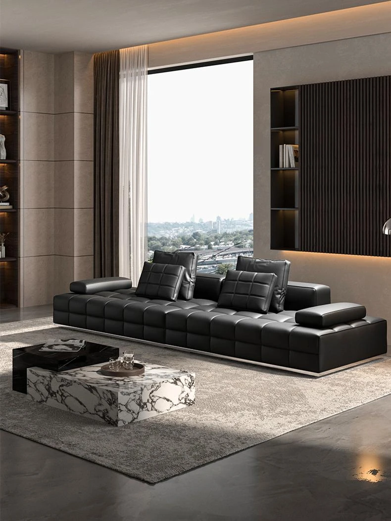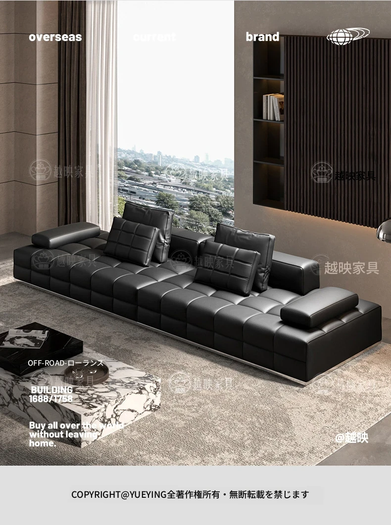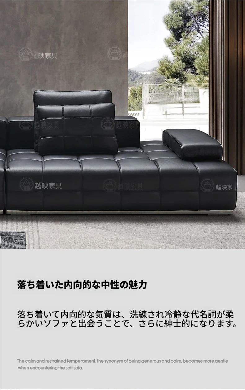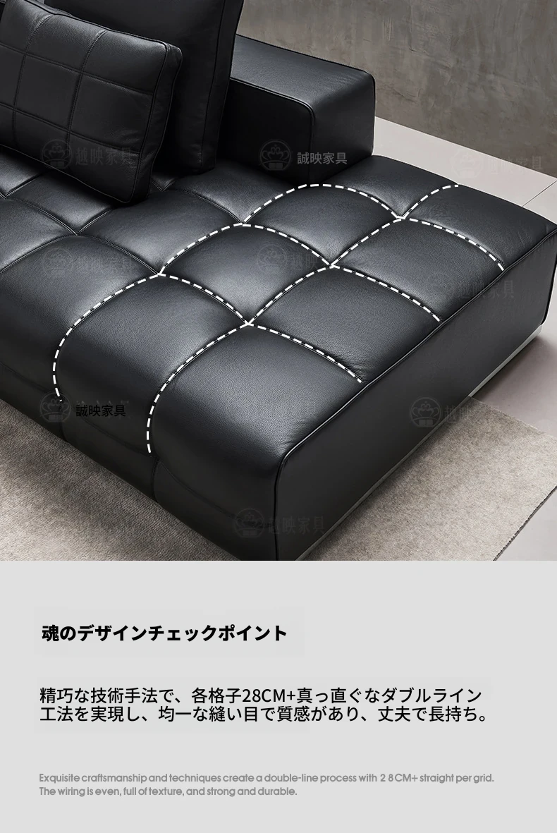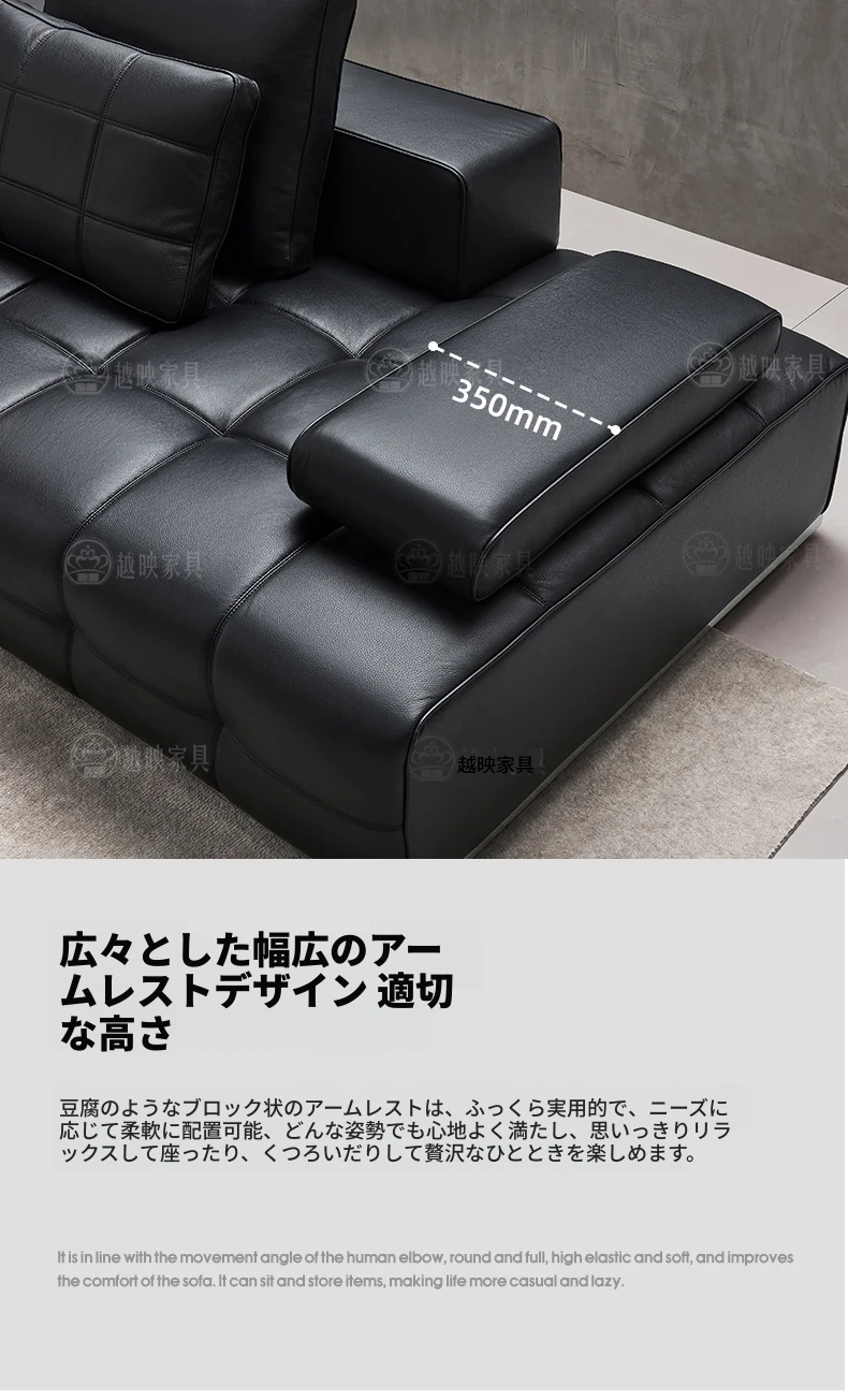 高級全皮製ラウレンスソファー - モダンなイタリアンミニマリズム、シックなブラックカラーでリビングを格上げ!全青皮使用で贅沢な座り心地を実現。広々とした空間にぴったりのデザインです。