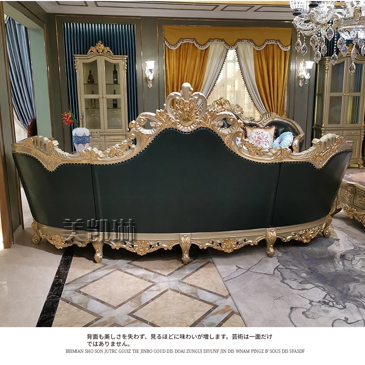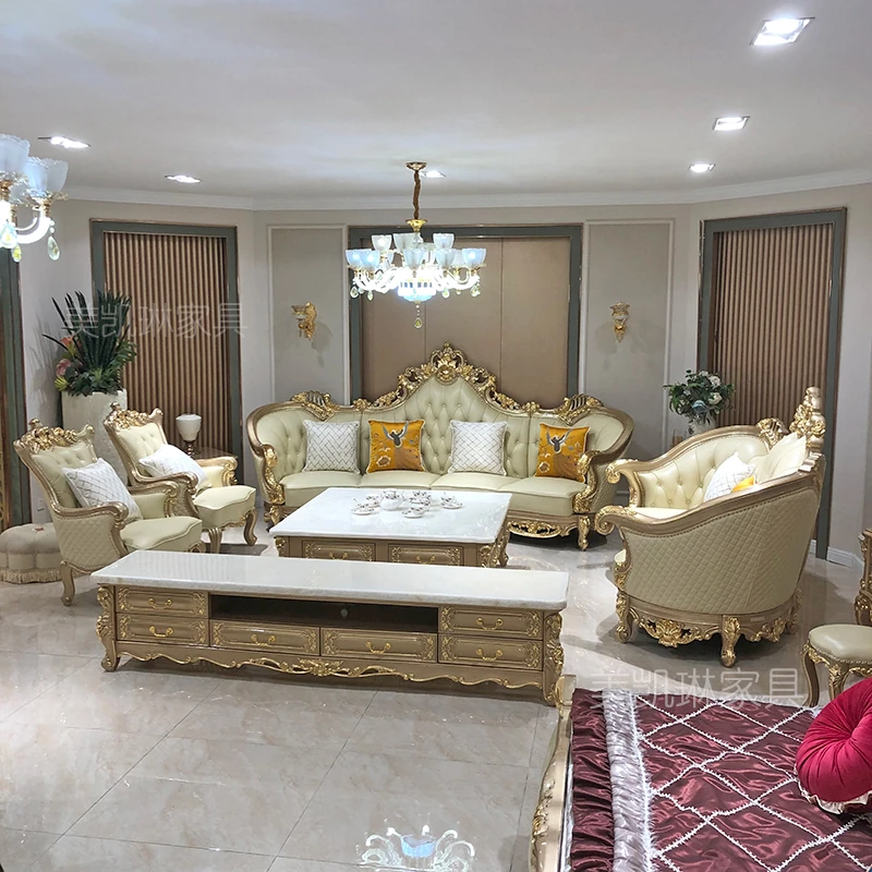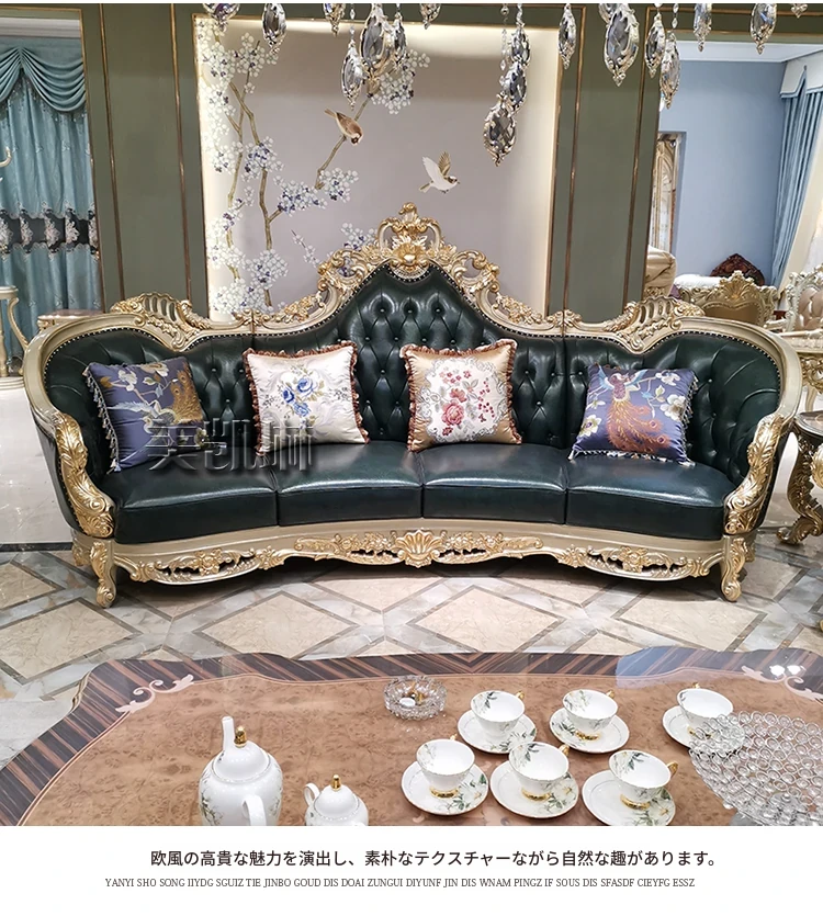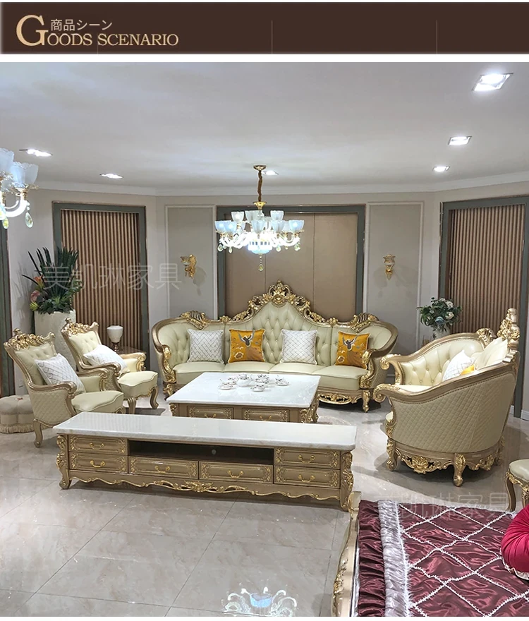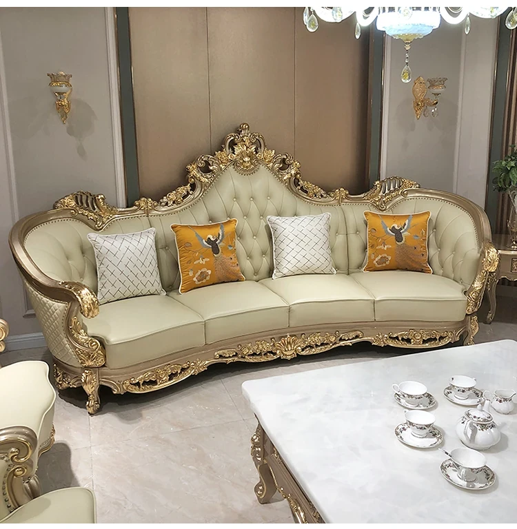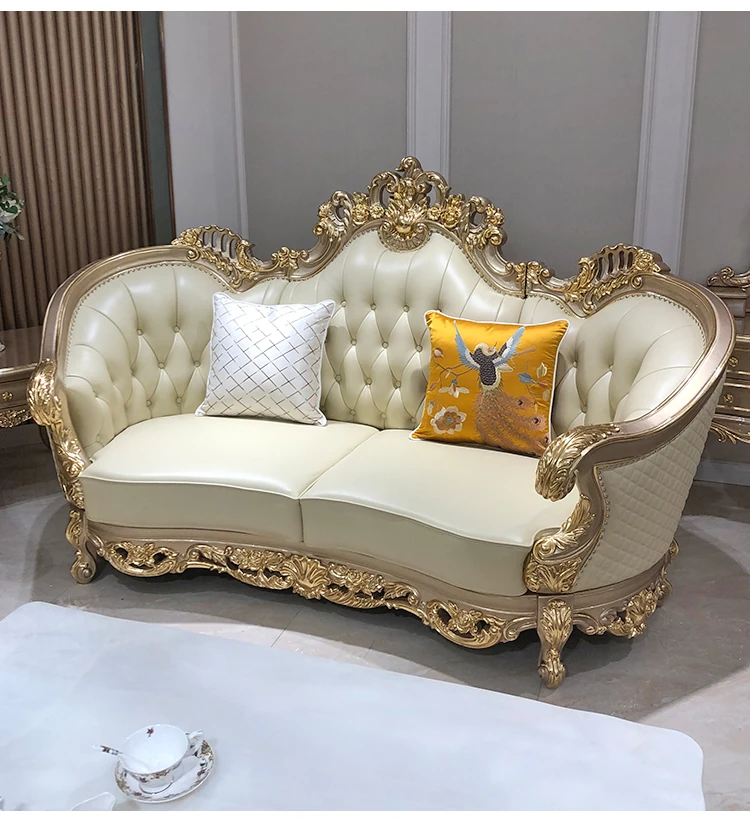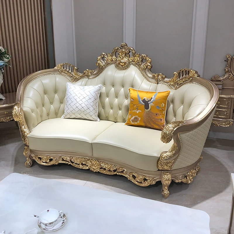 シャンパンカラーの豪華な本革ソファセット|金箔装飾の高級感溢れる実木製|ヴィラや広々としたリビングにぴったりなエレガントなソファです。高級感を演出し、心地よいひとときをお届けします。