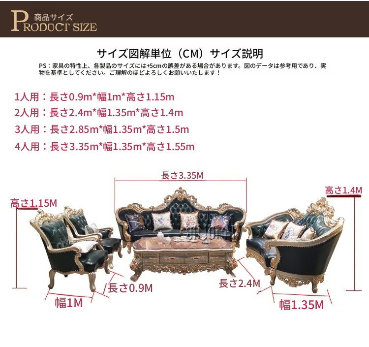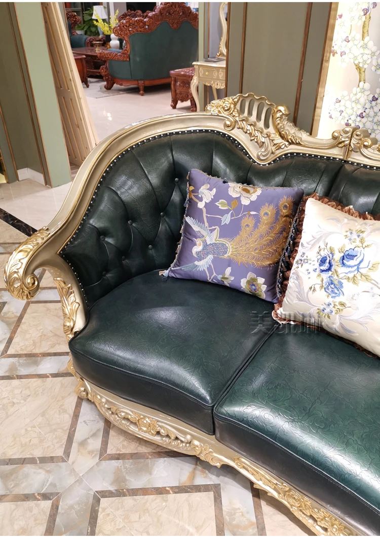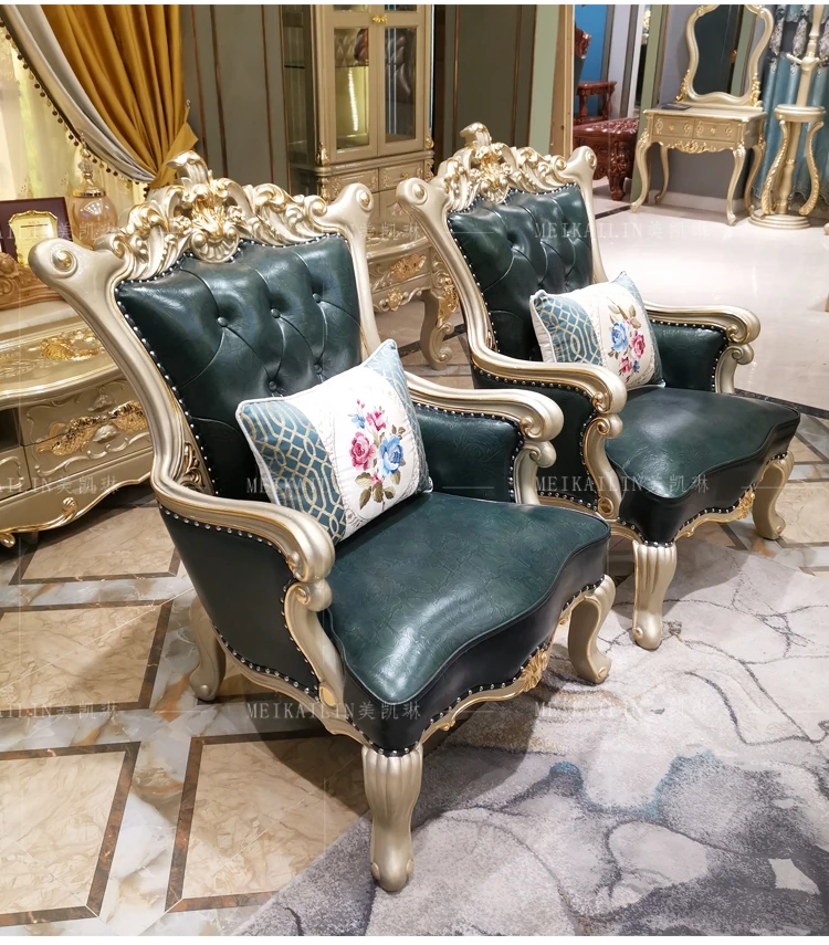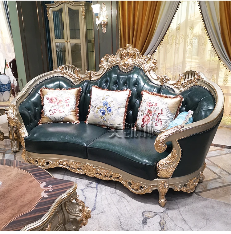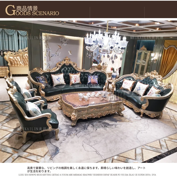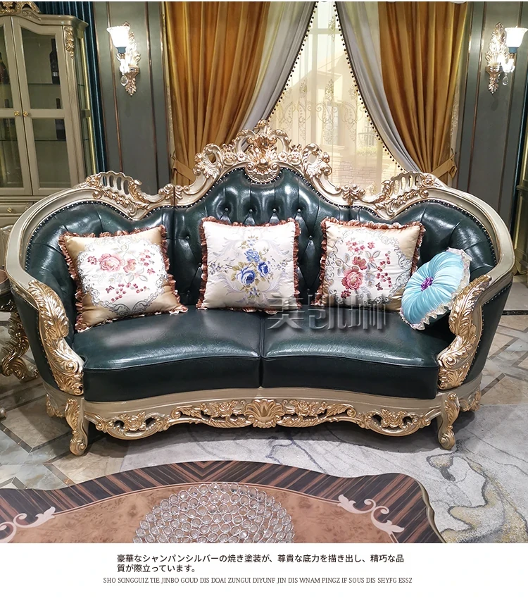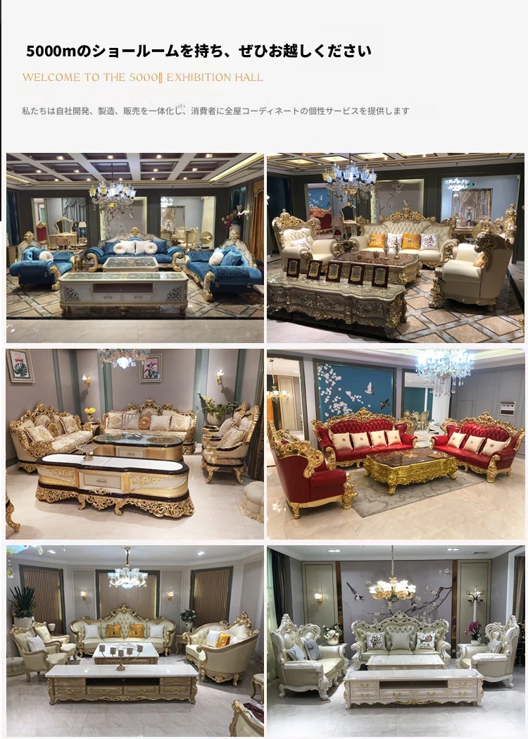 シャンパンカラーの豪華な本革ソファセット|金箔装飾の高級感溢れる実木製|ヴィラや広々としたリビングにぴったりなエレガントなソファです。高級感を演出し、心地よいひとときをお届けします。