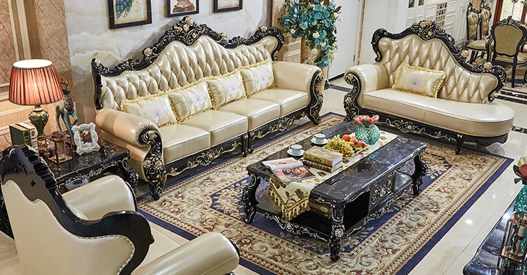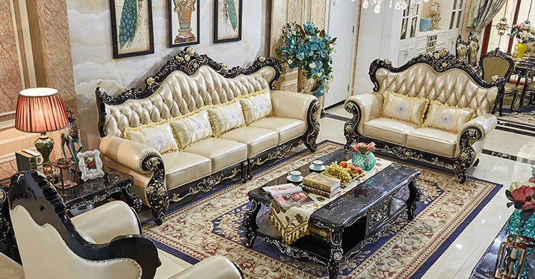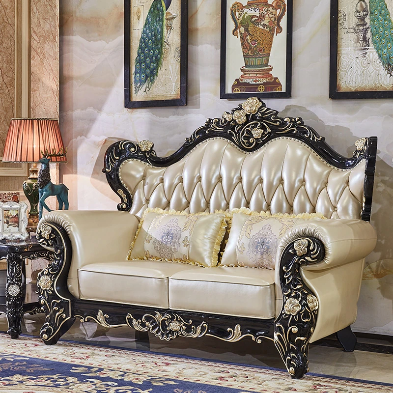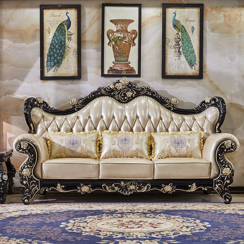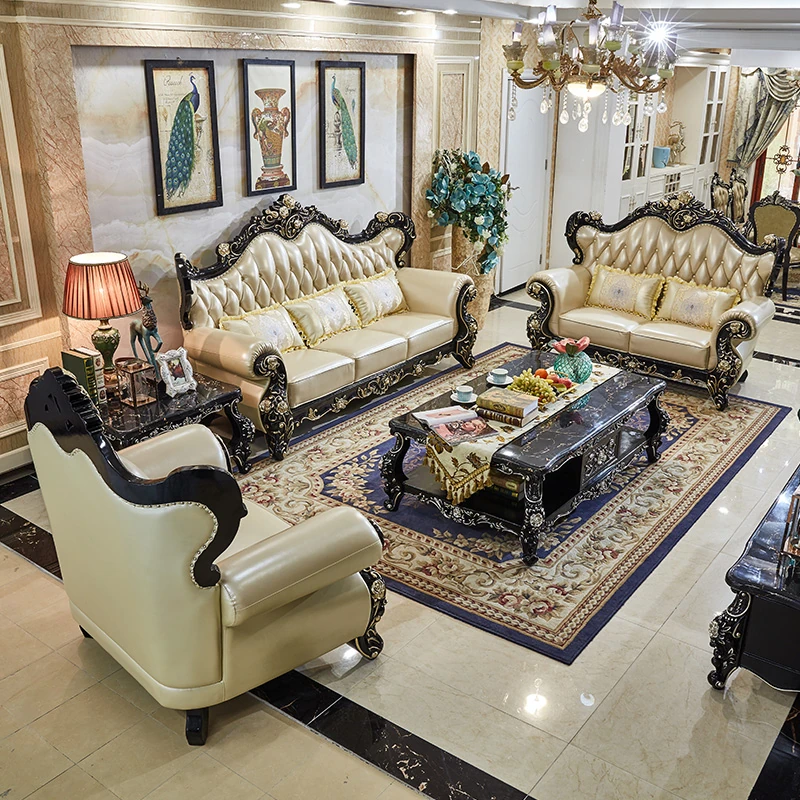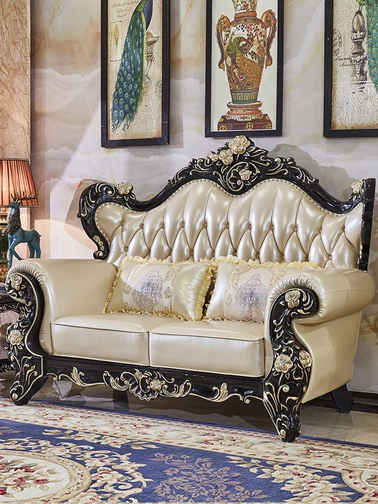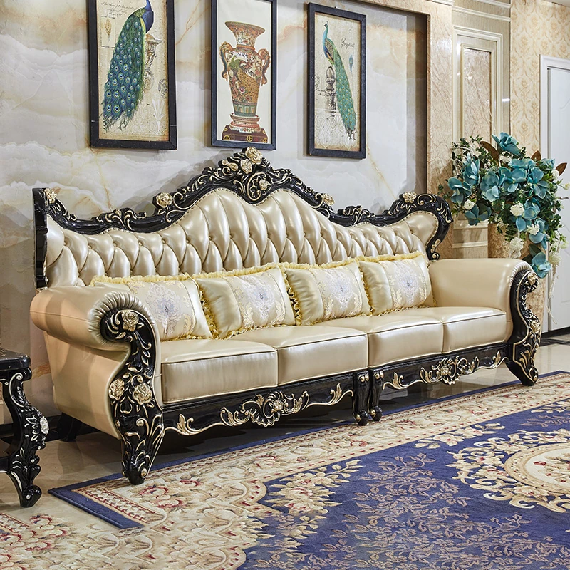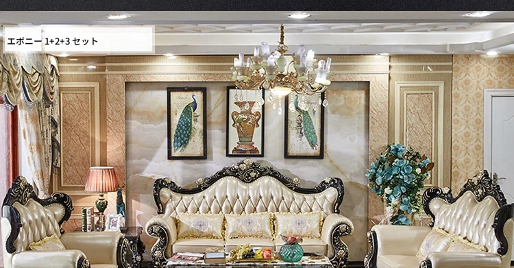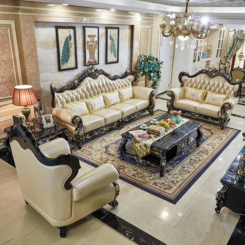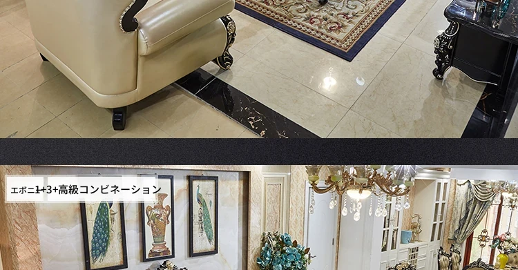 高級感溢れる欧風ソファセット|広々としたリビングに最適な本格木製家具|豪華な別荘スタイルのアメリカンエボニー本革ソファ|あなたの暮らしに贅沢を。