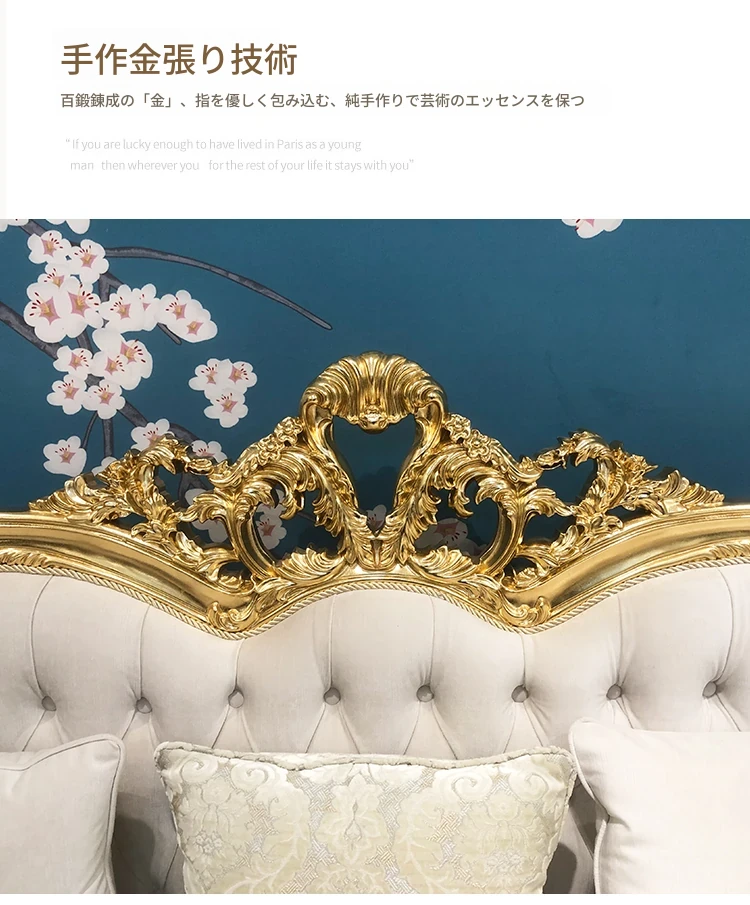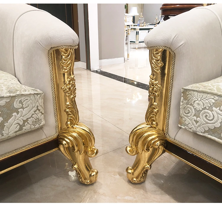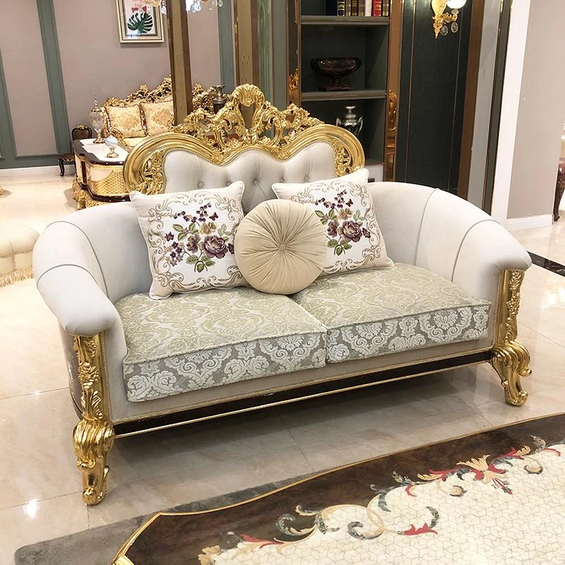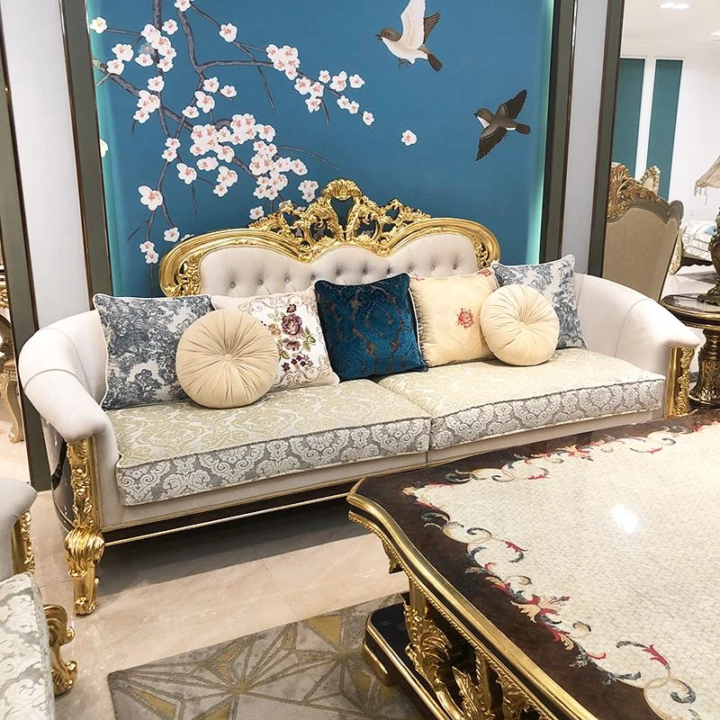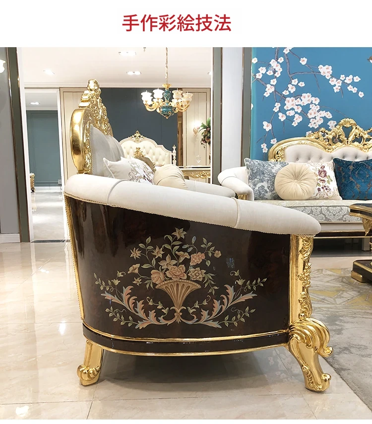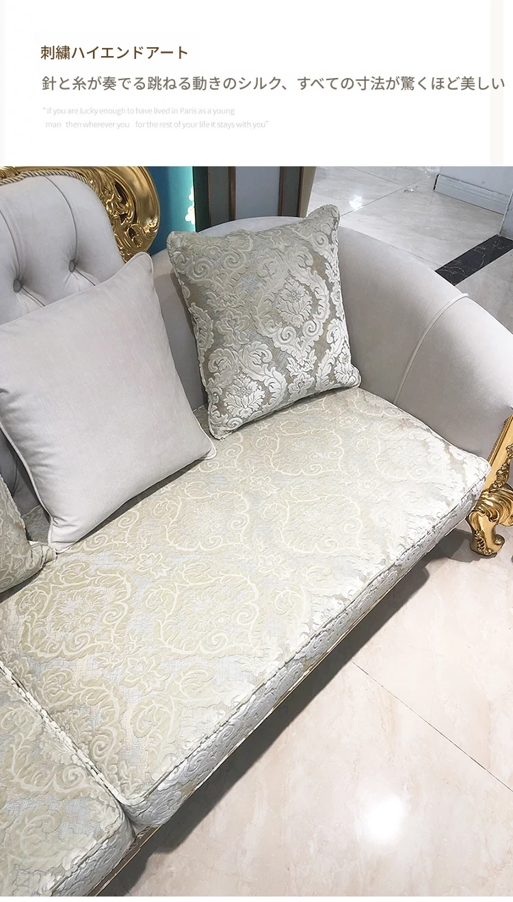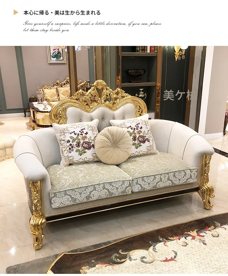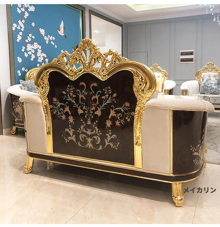 フランス高級ラグジュアリー布製ソファ|別荘リビングに最適|金箔仕上げの高級感溢れるソファ|フランス宮廷スタイルの無垢材ソファで、優雅な空間を演出します。