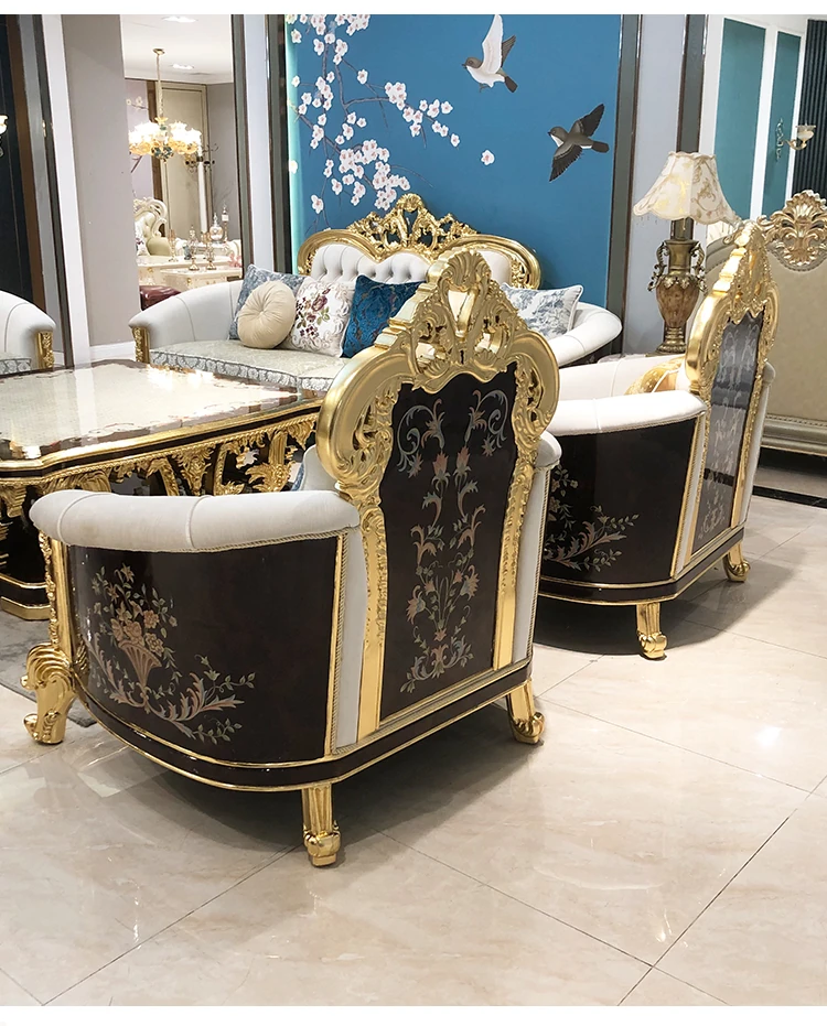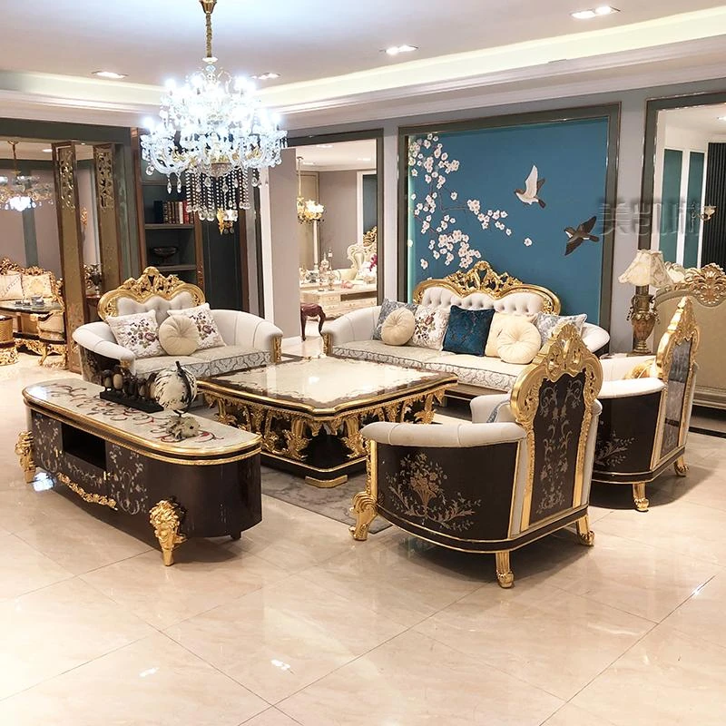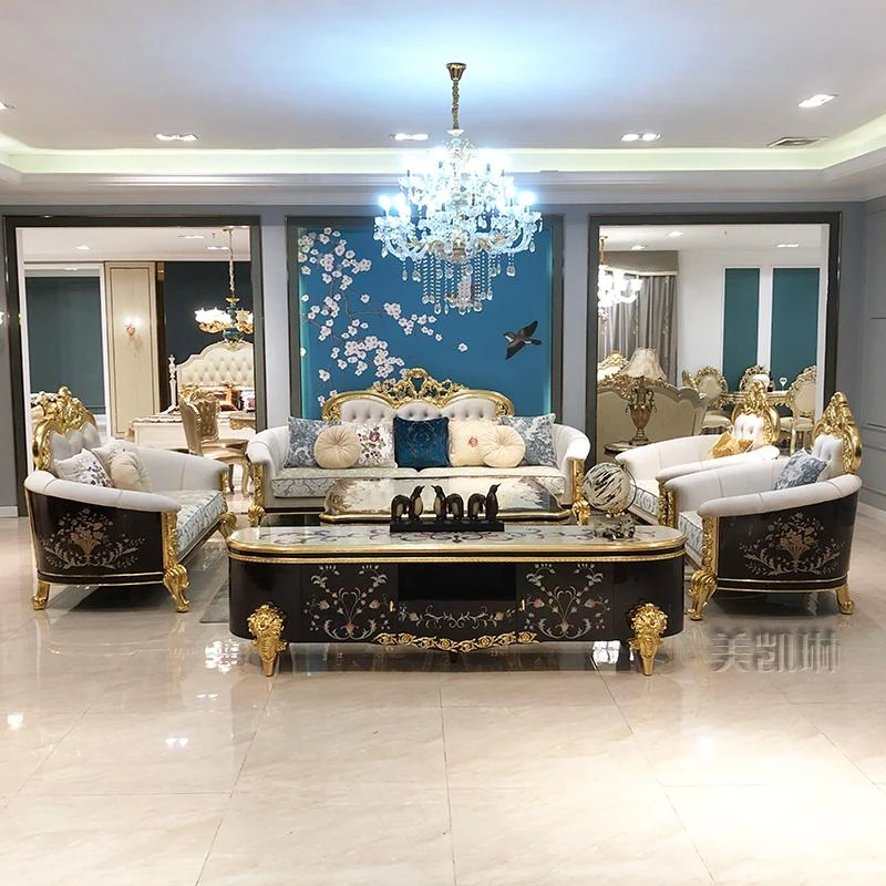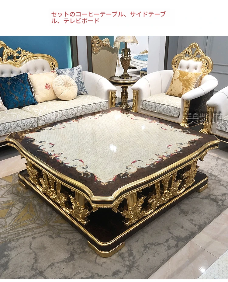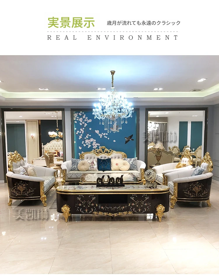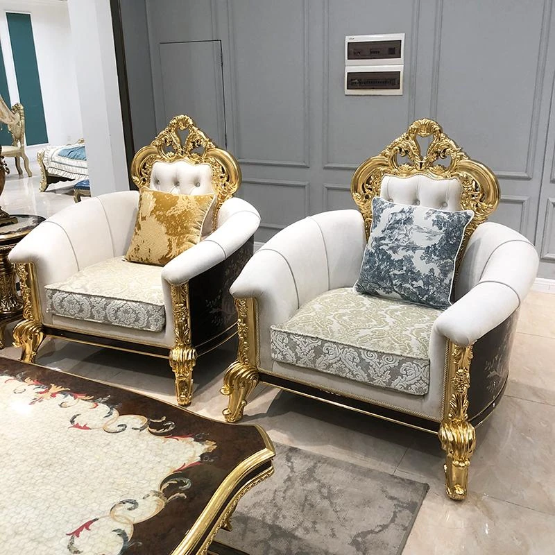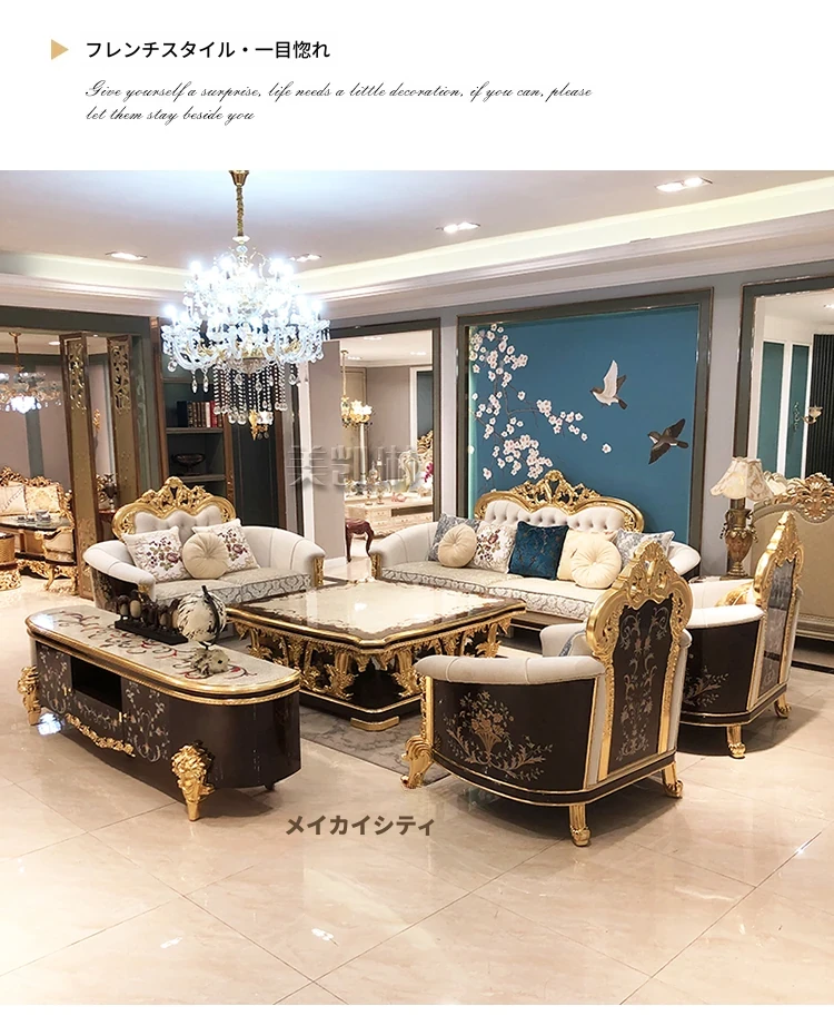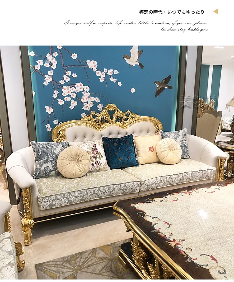 フランス高級ラグジュアリー布製ソファ|別荘リビングに最適|金箔仕上げの高級感溢れるソファ|フランス宮廷スタイルの無垢材ソファで、優雅な空間を演出します。
