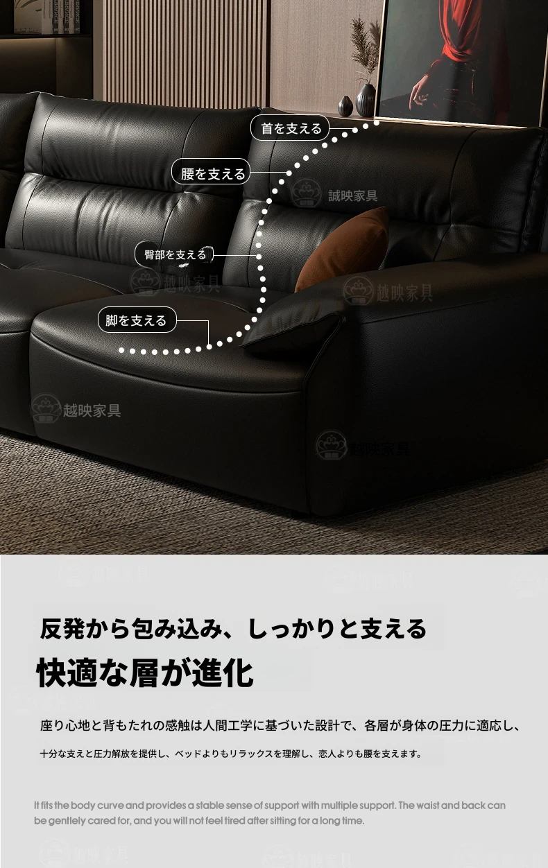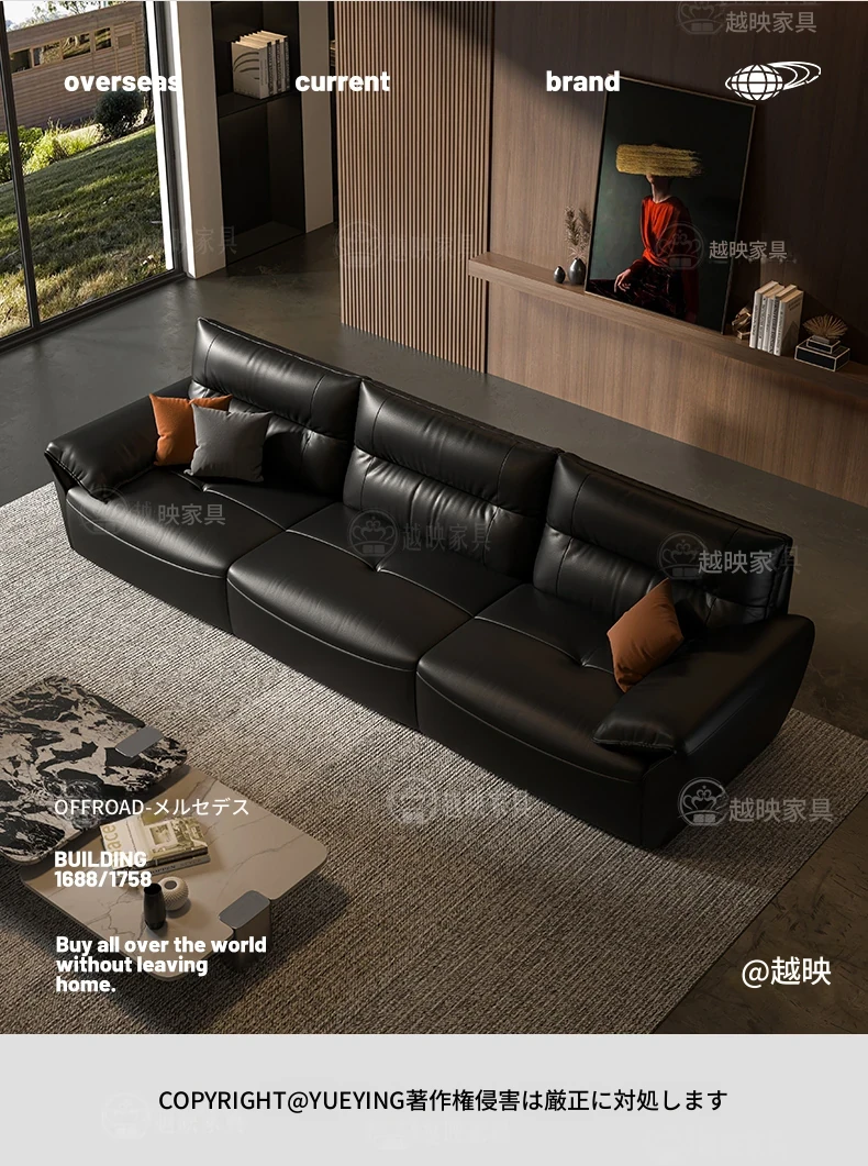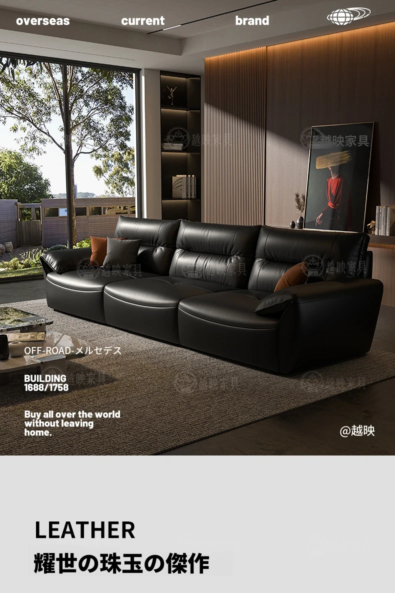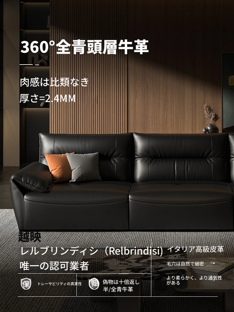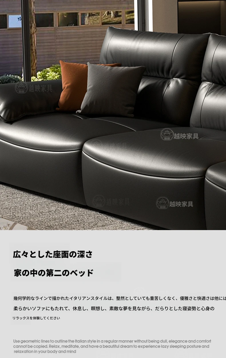 越映梅德赛スリムデザイン本革ソファ - 小型リビングに最適な直線的なブラックソファ、半青皮仕上げの高級トップグレイン牛革使用。高級感あふれるスタイリッシュな空間を演出します!