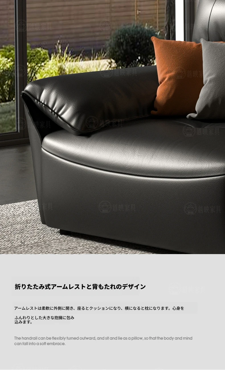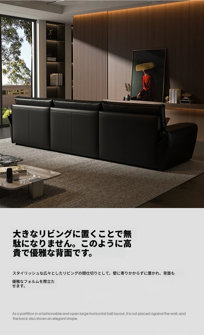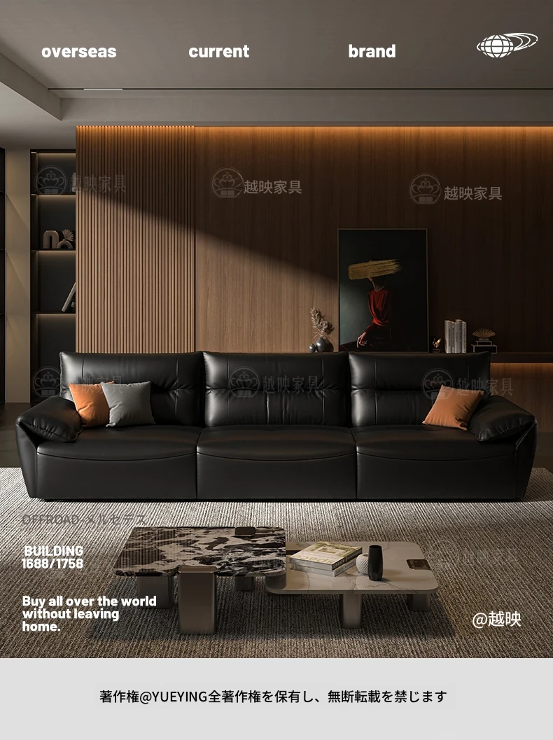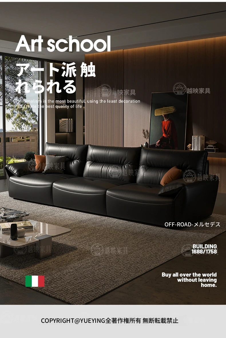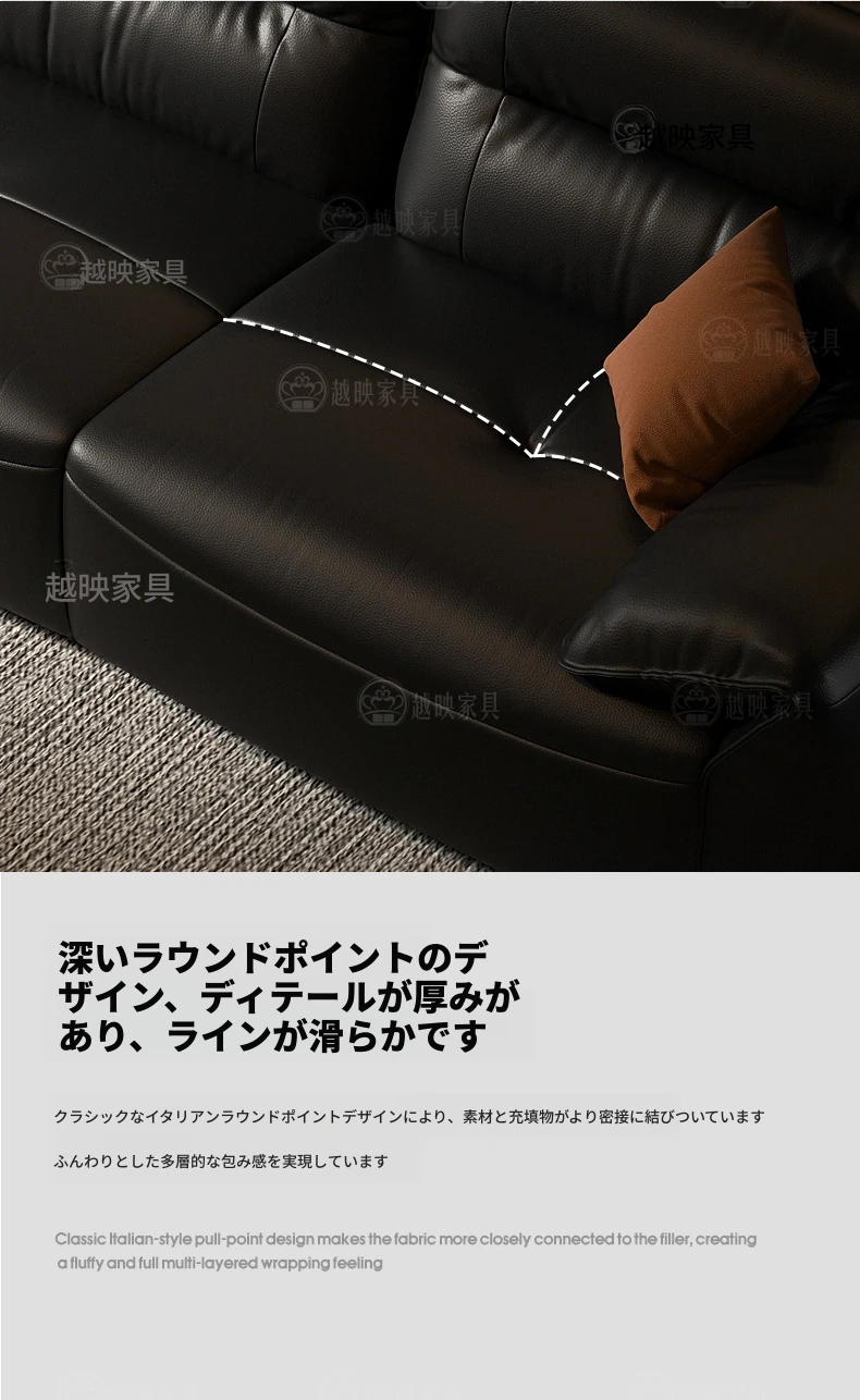 越映梅德赛スリムデザイン本革ソファ - 小型リビングに最適な直線的なブラックソファ、半青皮仕上げの高級トップグレイン牛革使用。高級感あふれるスタイリッシュな空間を演出します!