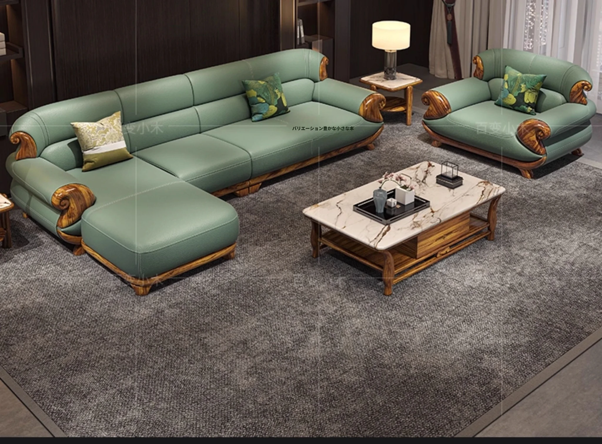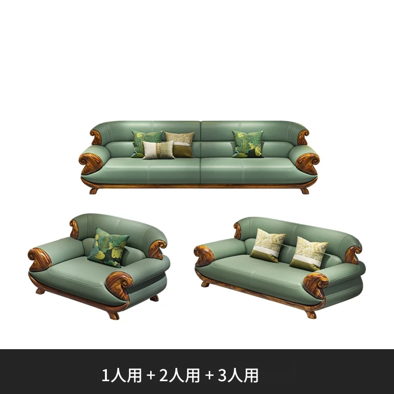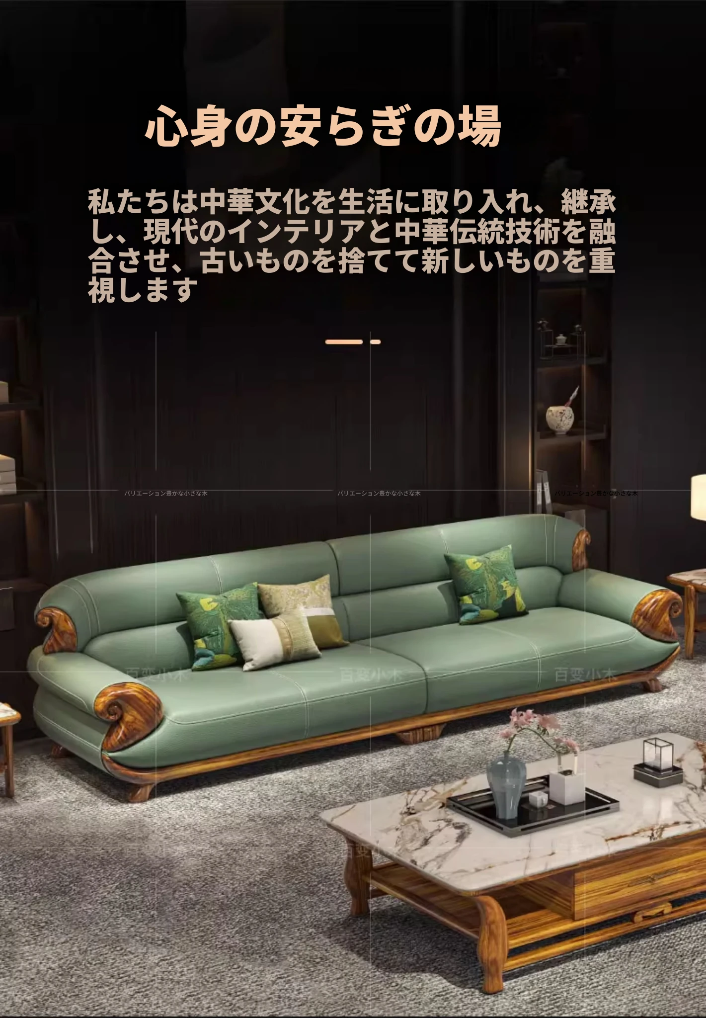 ウッディブラックレザーソファセット|高級本革使用のモダン中式デザイン|ヴィラのリビングにぴったりなラグジュアリー天然木ソファ家具