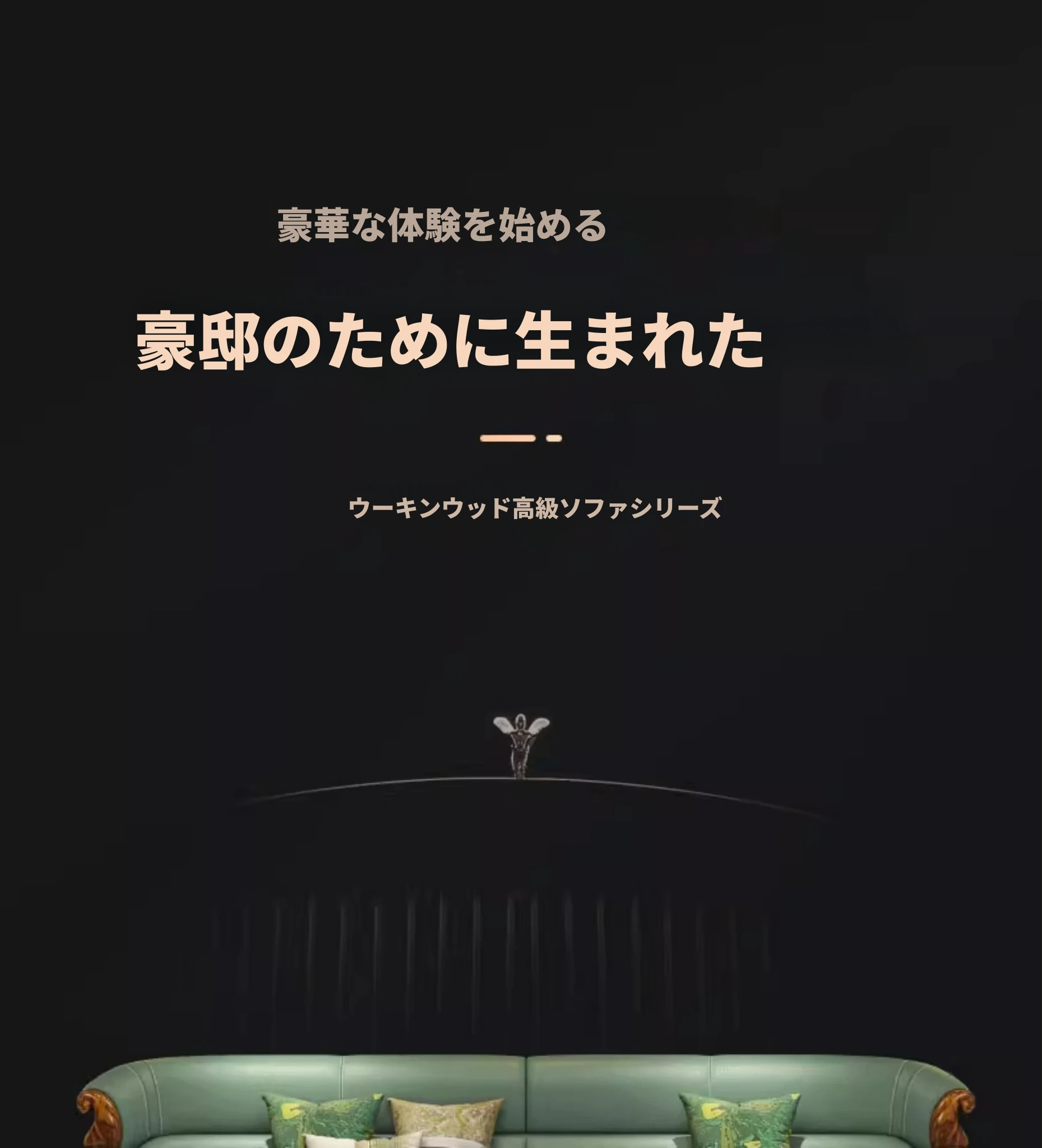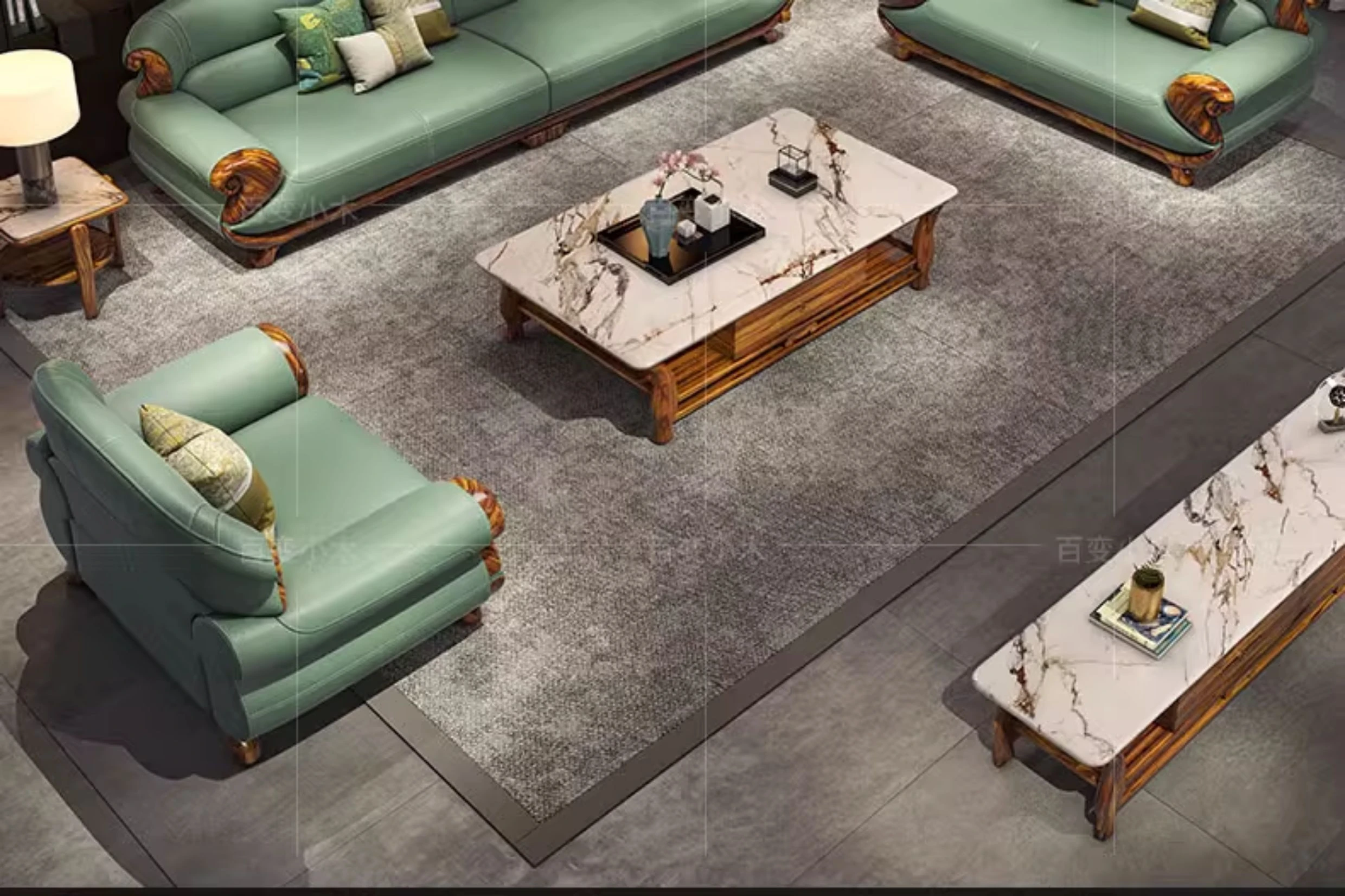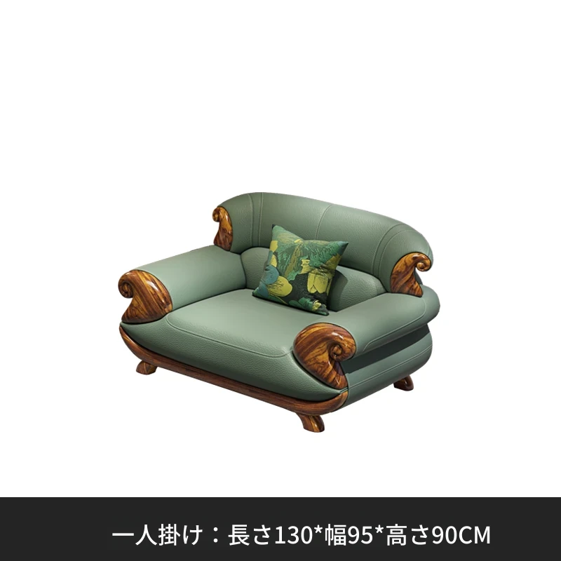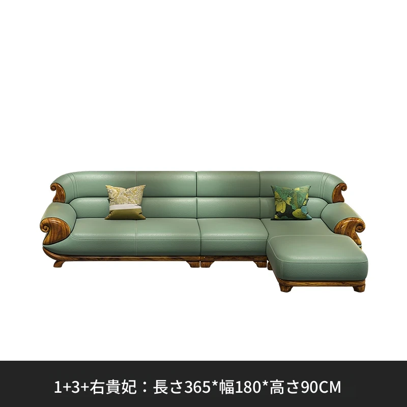 ウッディブラックレザーソファセット|高級本革使用のモダン中式デザイン|ヴィラのリビングにぴったりなラグジュアリー天然木ソファ家具